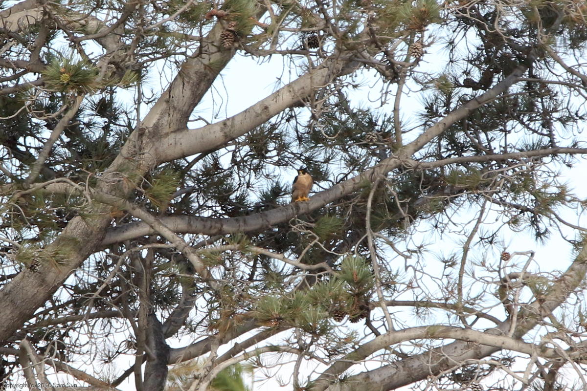 (5:32p) Mom and at least one juvenile hanging out in a distant pine tree