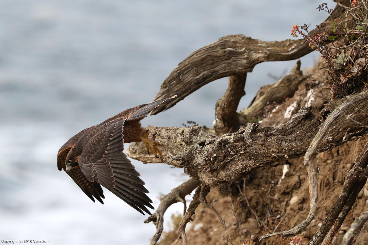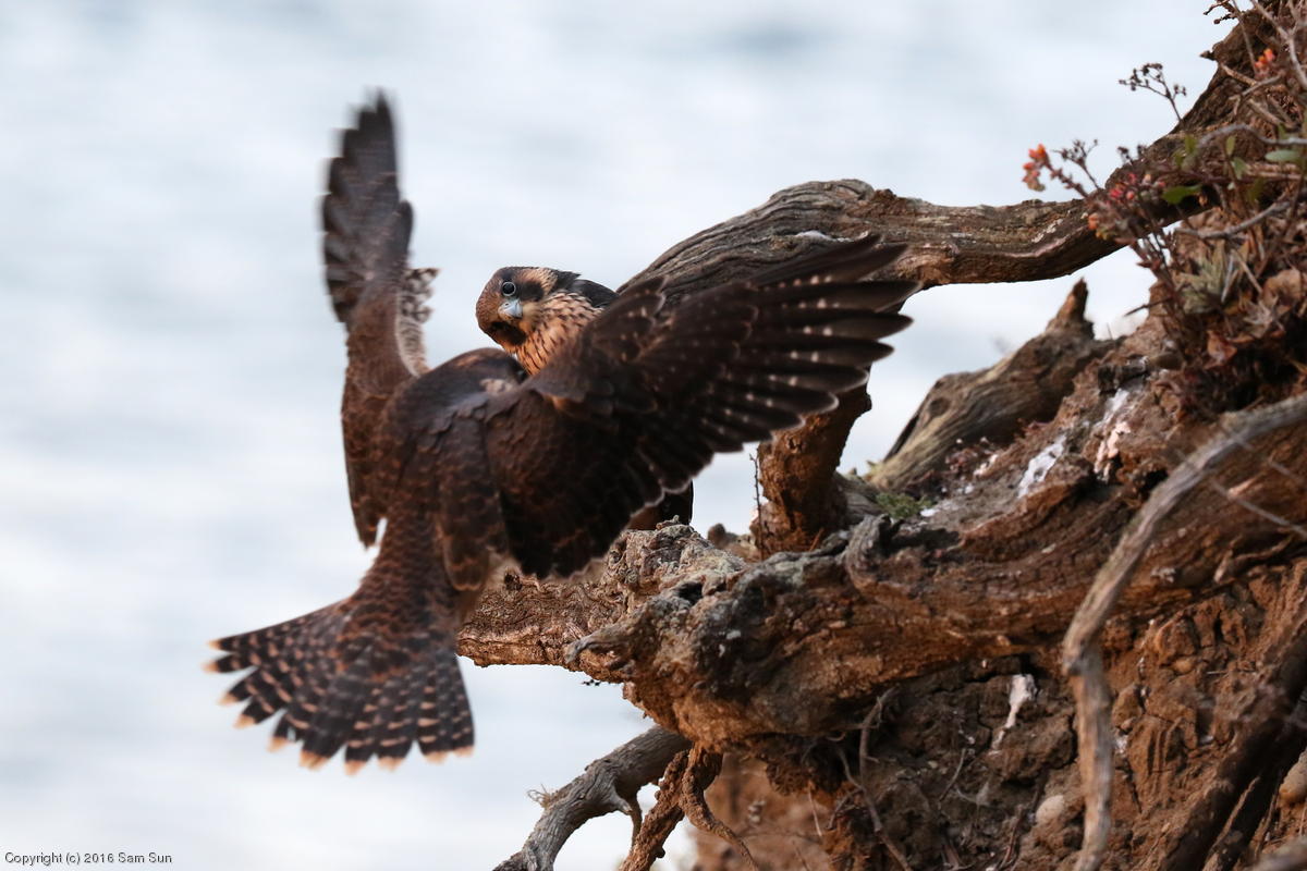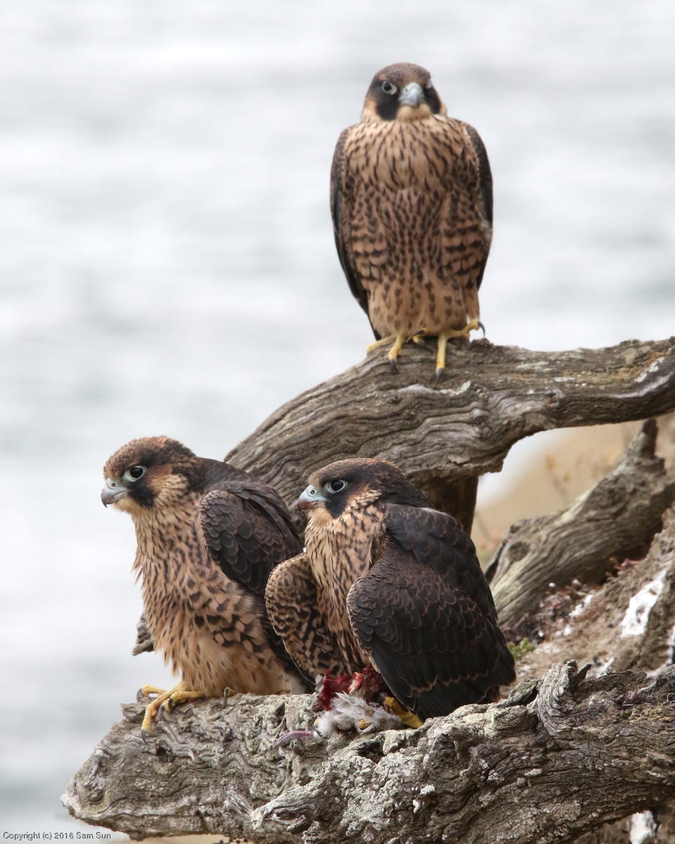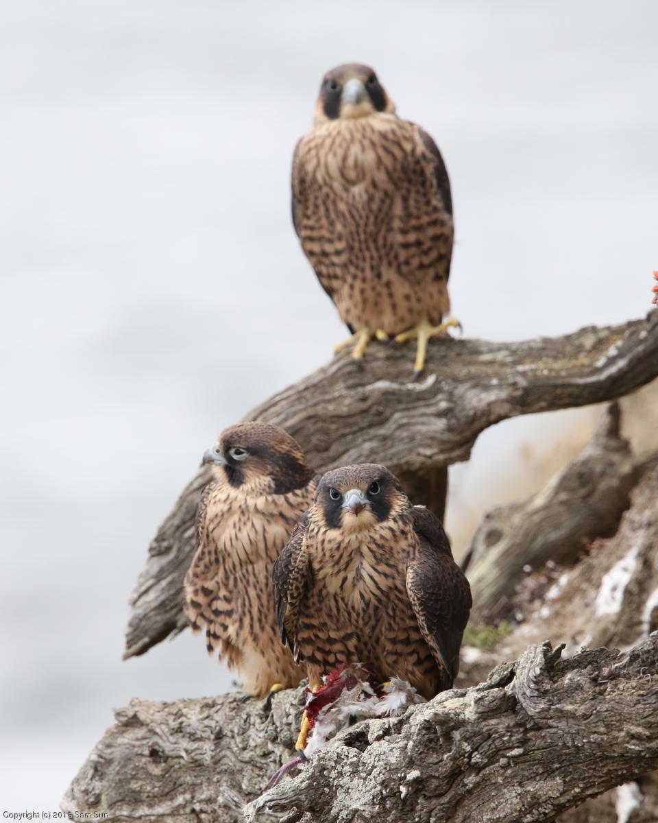 A good look at some up close activity today. Mom went hunting just below me on the cliff and came up with a dove, which she plucked about 100 feet away. Later in the morning, all three juveniles posed on the branches by the photo landing.