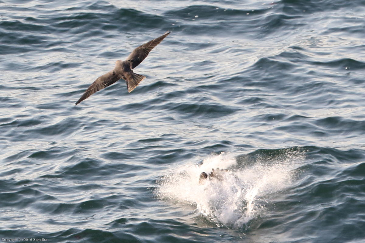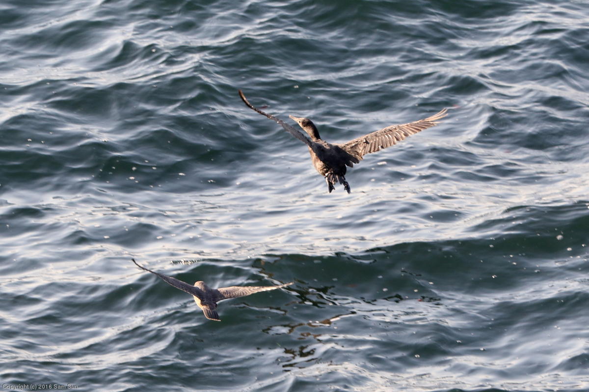 Chasing a cormorant into the water.