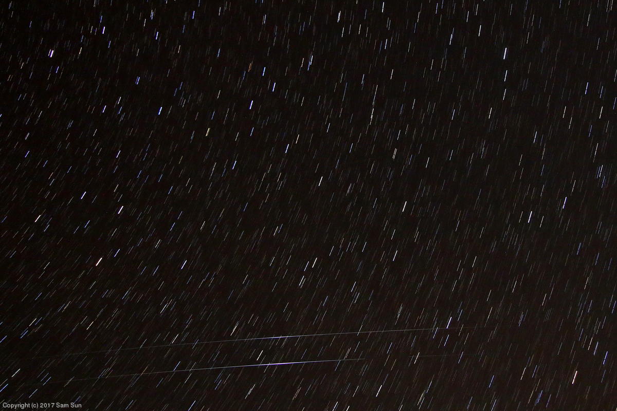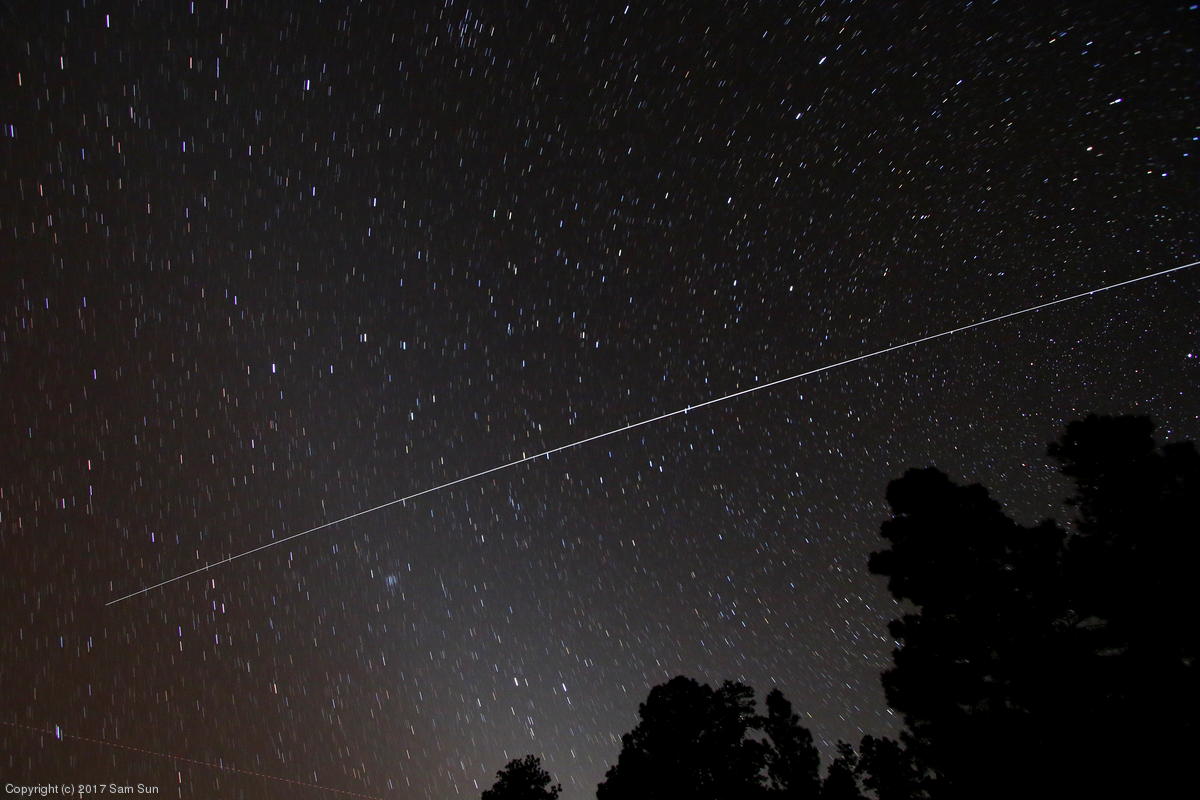 An ISS pass with the Beehive Cluster below, Big Dipper upper right.