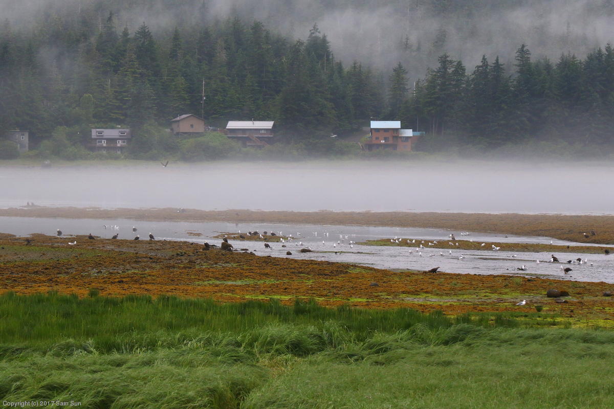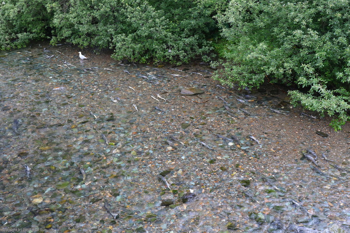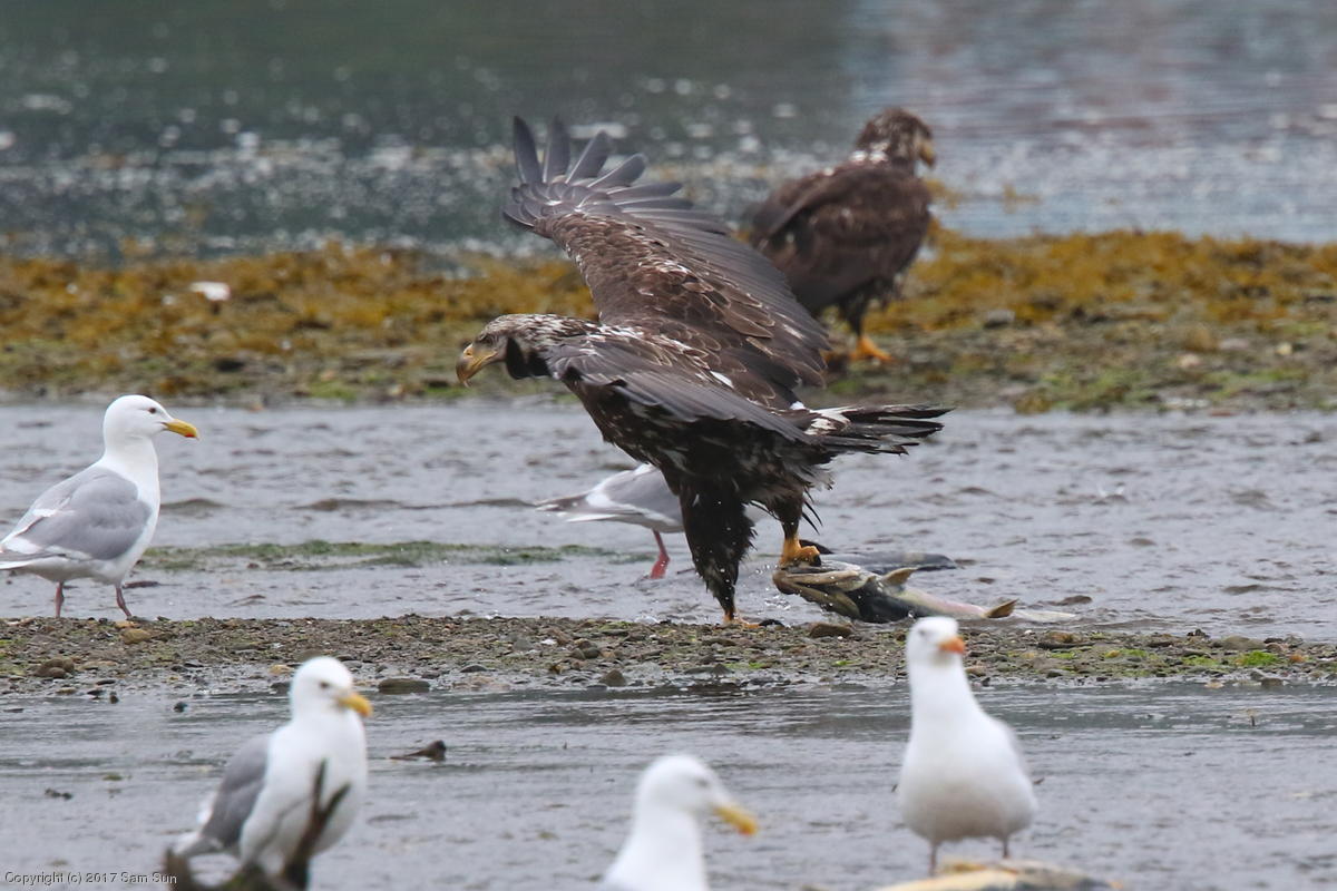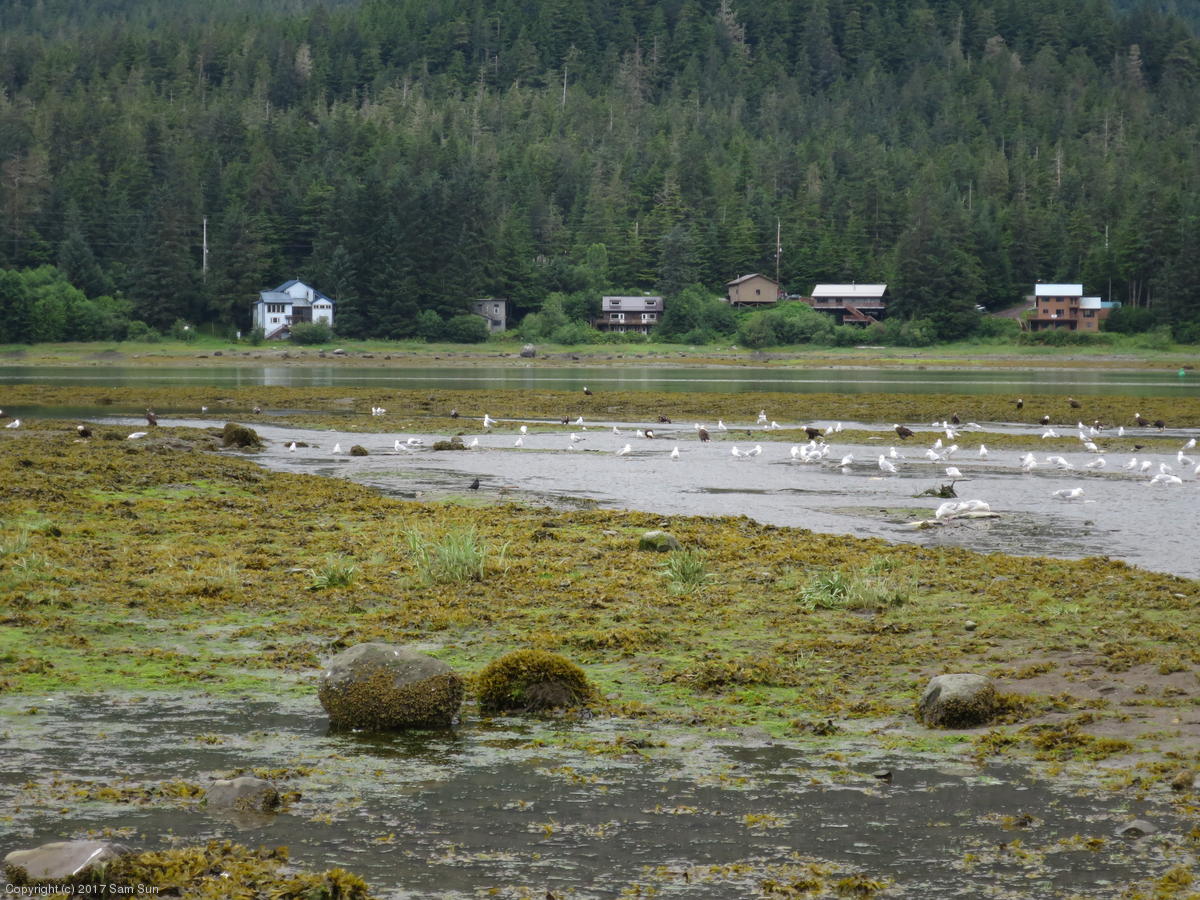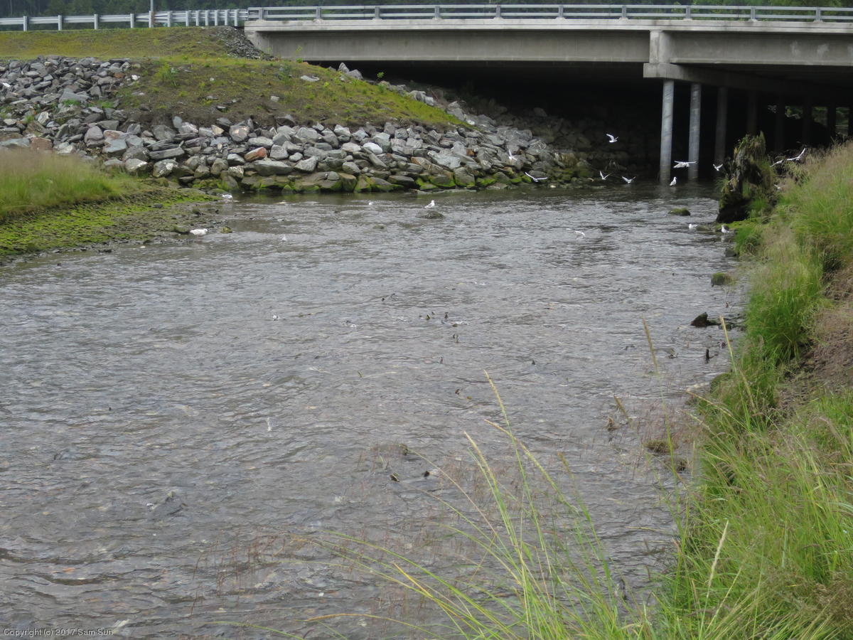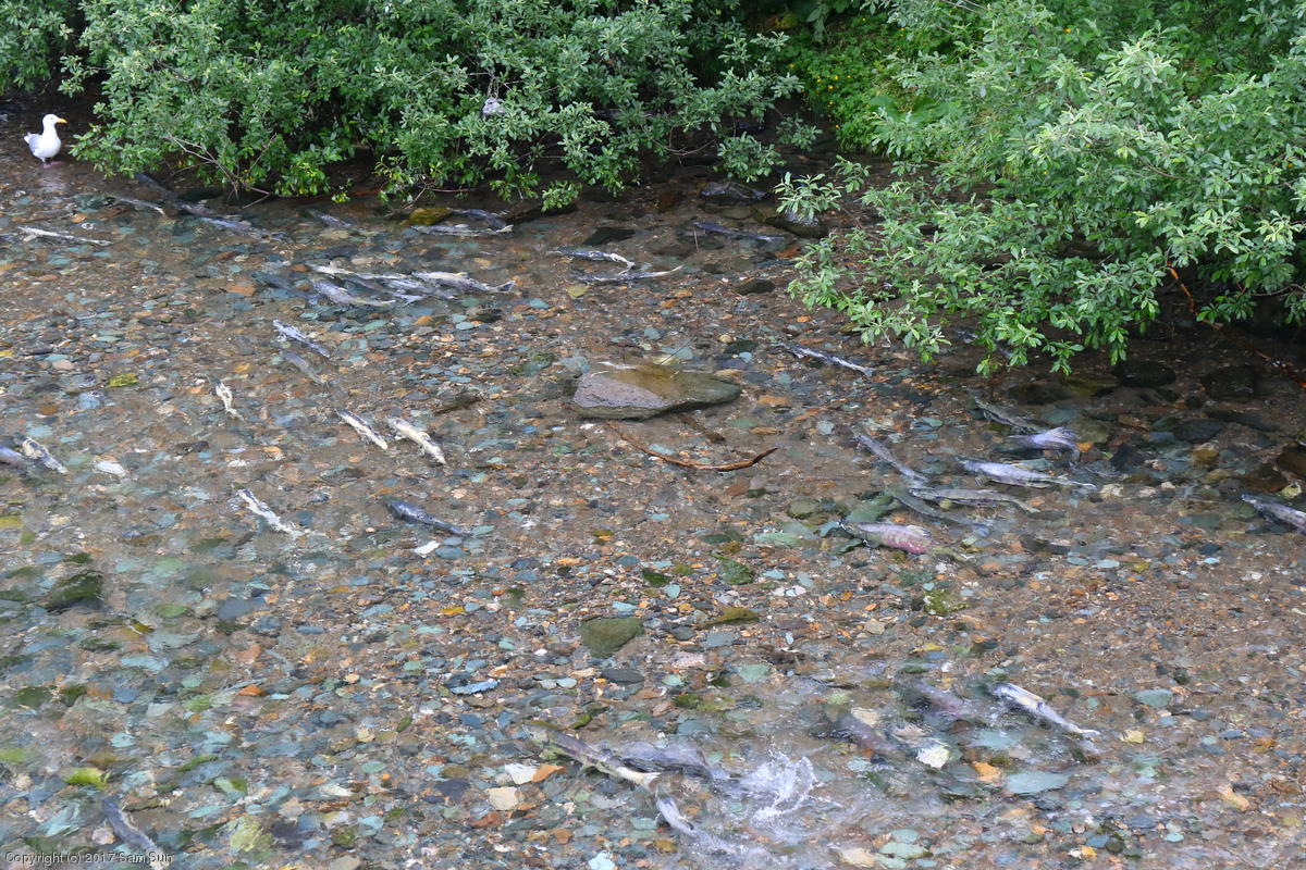 On the way back into town, I found the even more aptly named Salmon Creek. There were a tremendous number of salmon, eagles, and gulls gathered. A 15.9 foot high tide at 9:23p was coming in, which was driving the birds off.