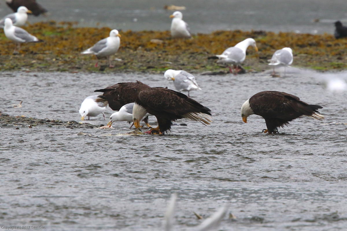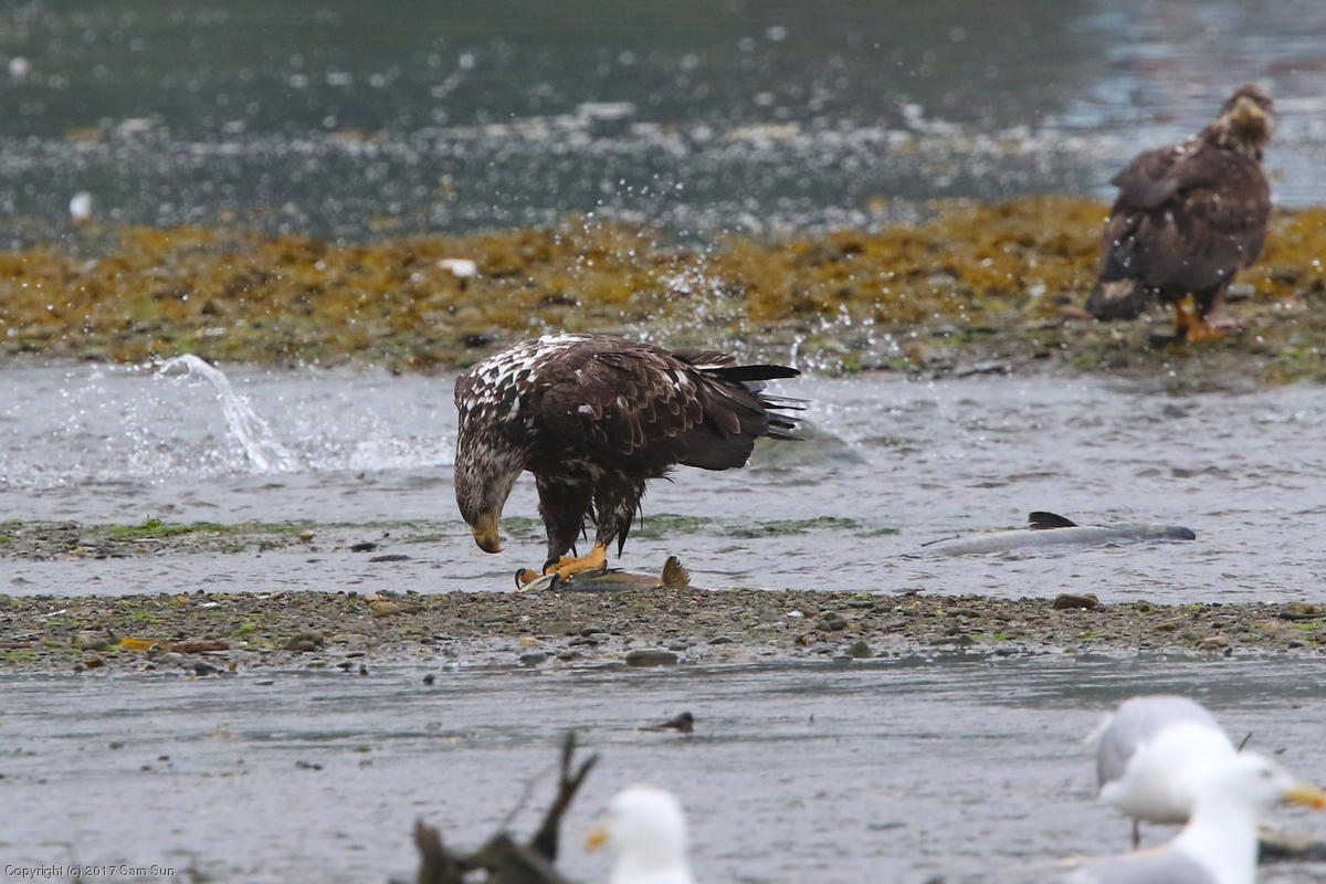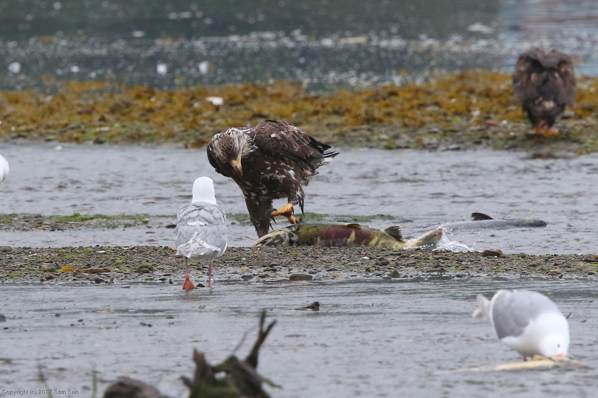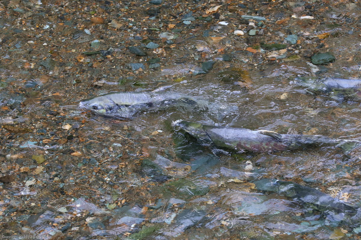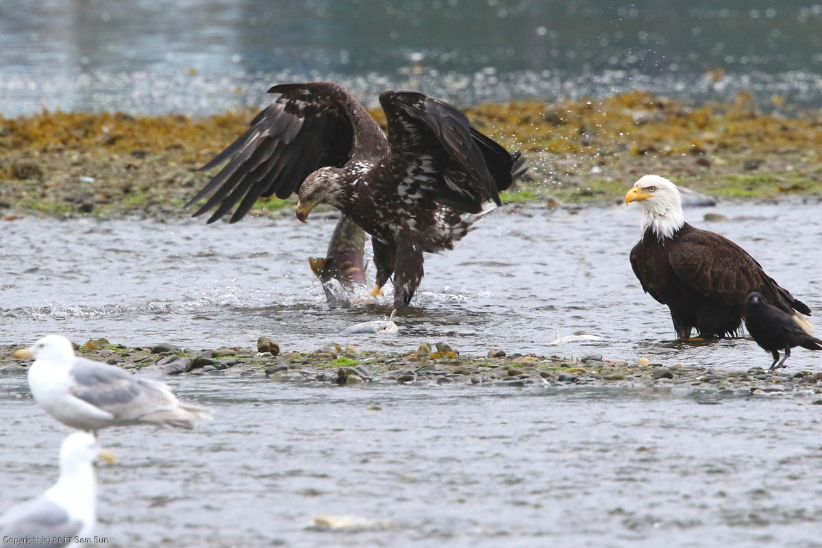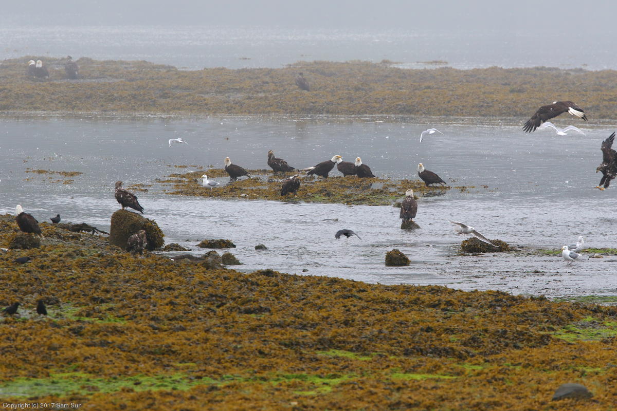 On the way back into town, I found the even more aptly named Salmon Creek. There were a tremendous number of salmon, eagles, and gulls gathered. A 15.9 foot high tide at 9:23p was coming in, which was driving the birds off.