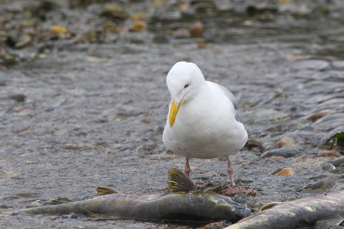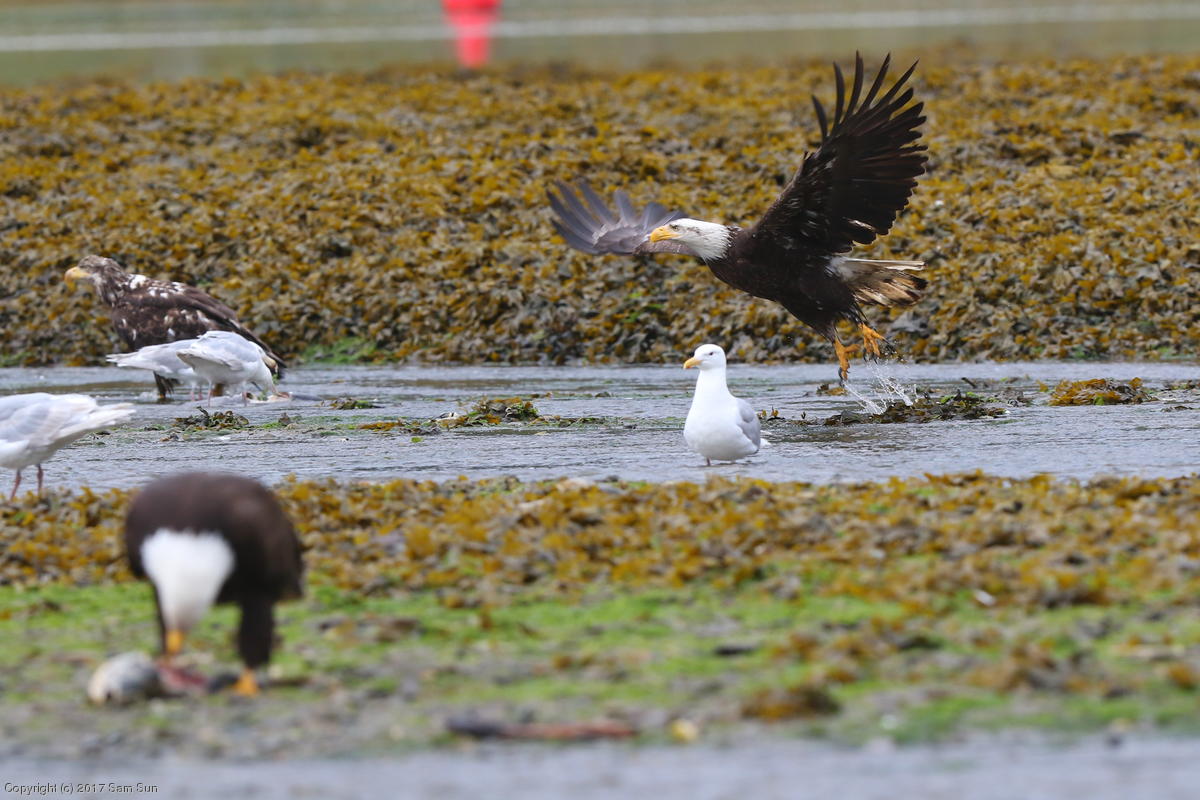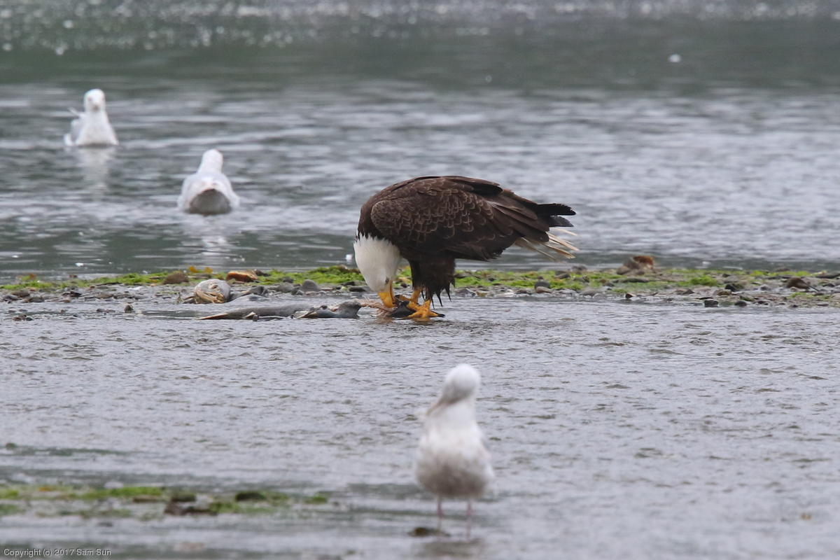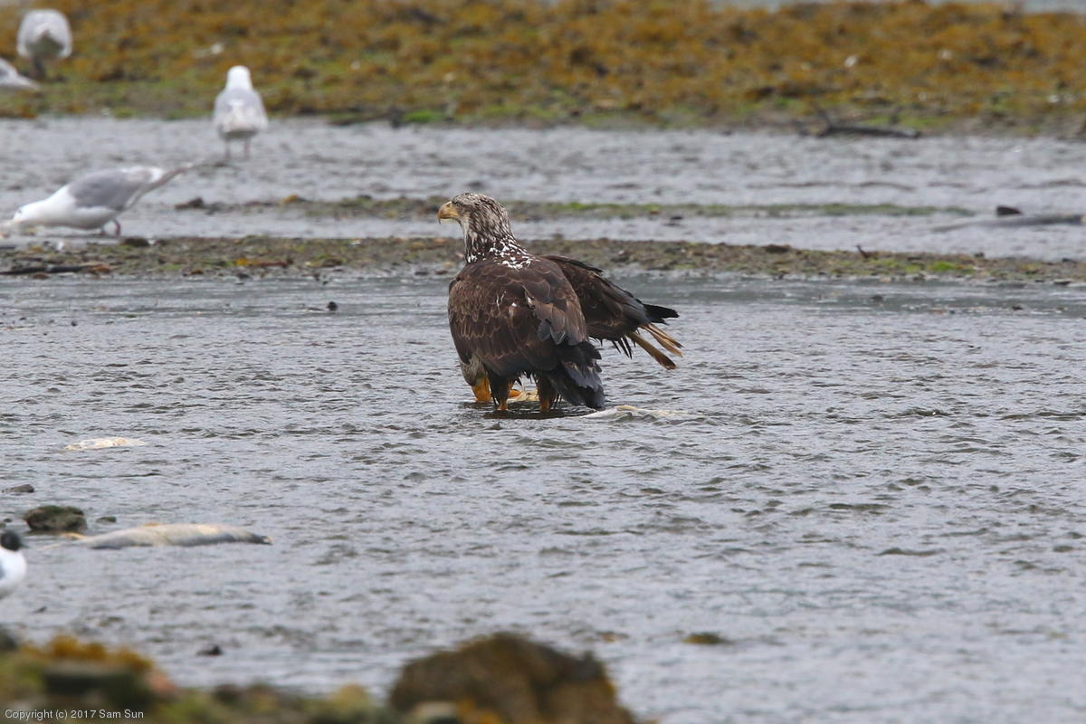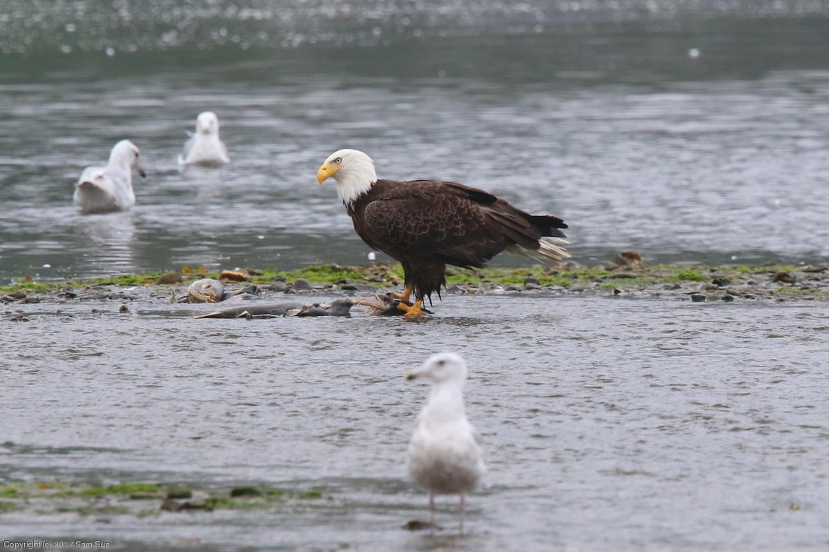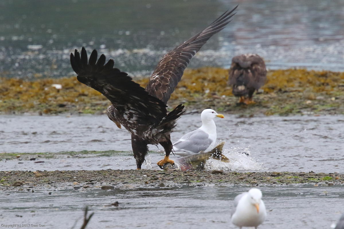 On the way back into town, I found the even more aptly named Salmon Creek. There were a tremendous number of salmon, eagles, and gulls gathered. A 15.9 foot high tide at 9:23p was coming in, which was driving the birds off.