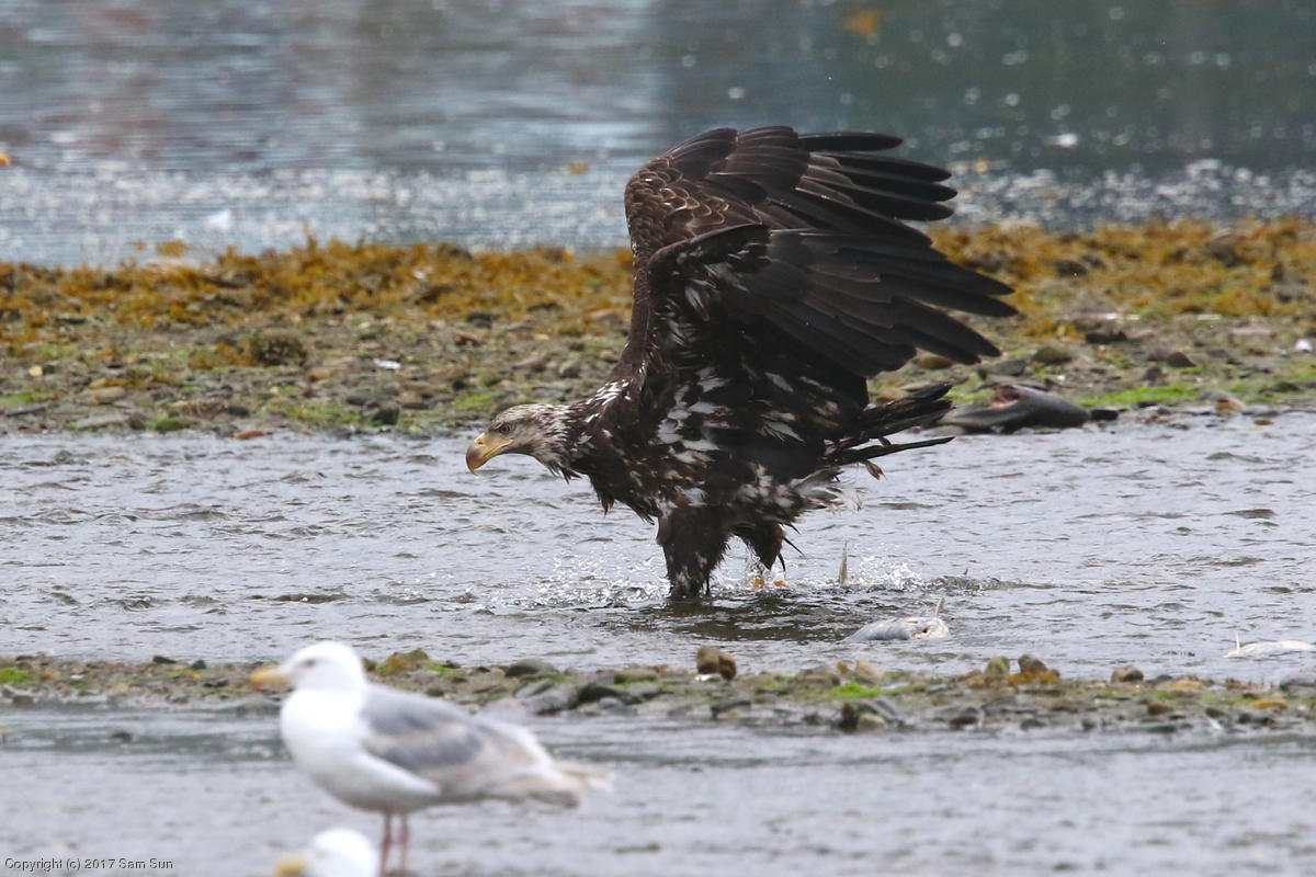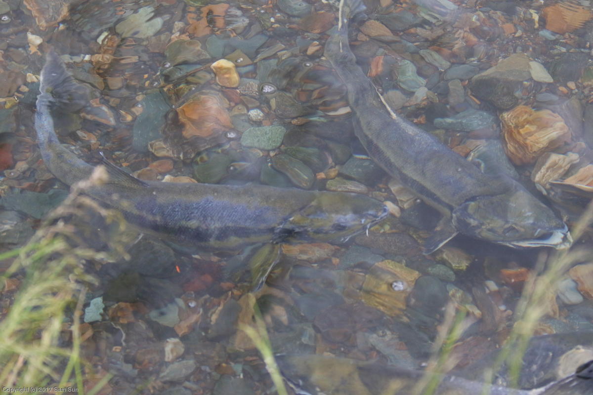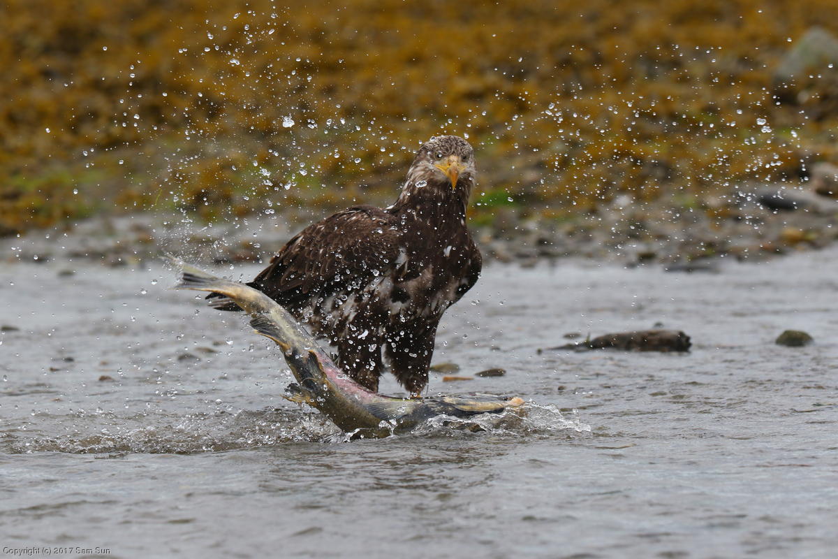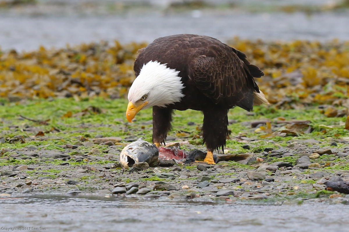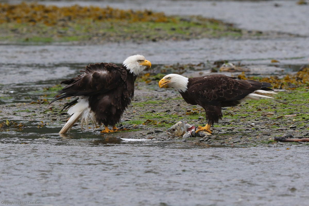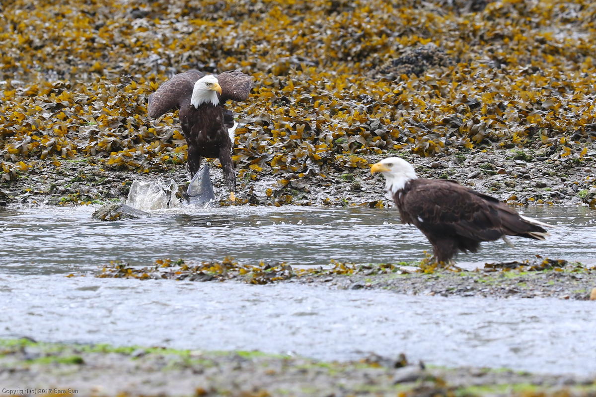 On the way back into town, I found the even more aptly named Salmon Creek. There were a tremendous number of salmon, eagles, and gulls gathered. A 15.9 foot high tide at 9:23p was coming in, which was driving the birds off.