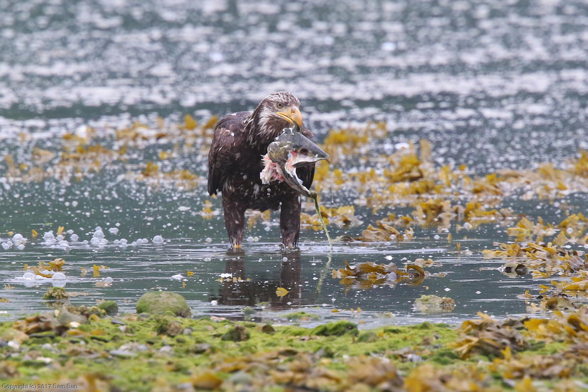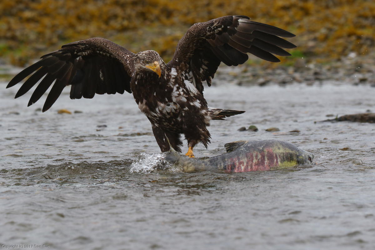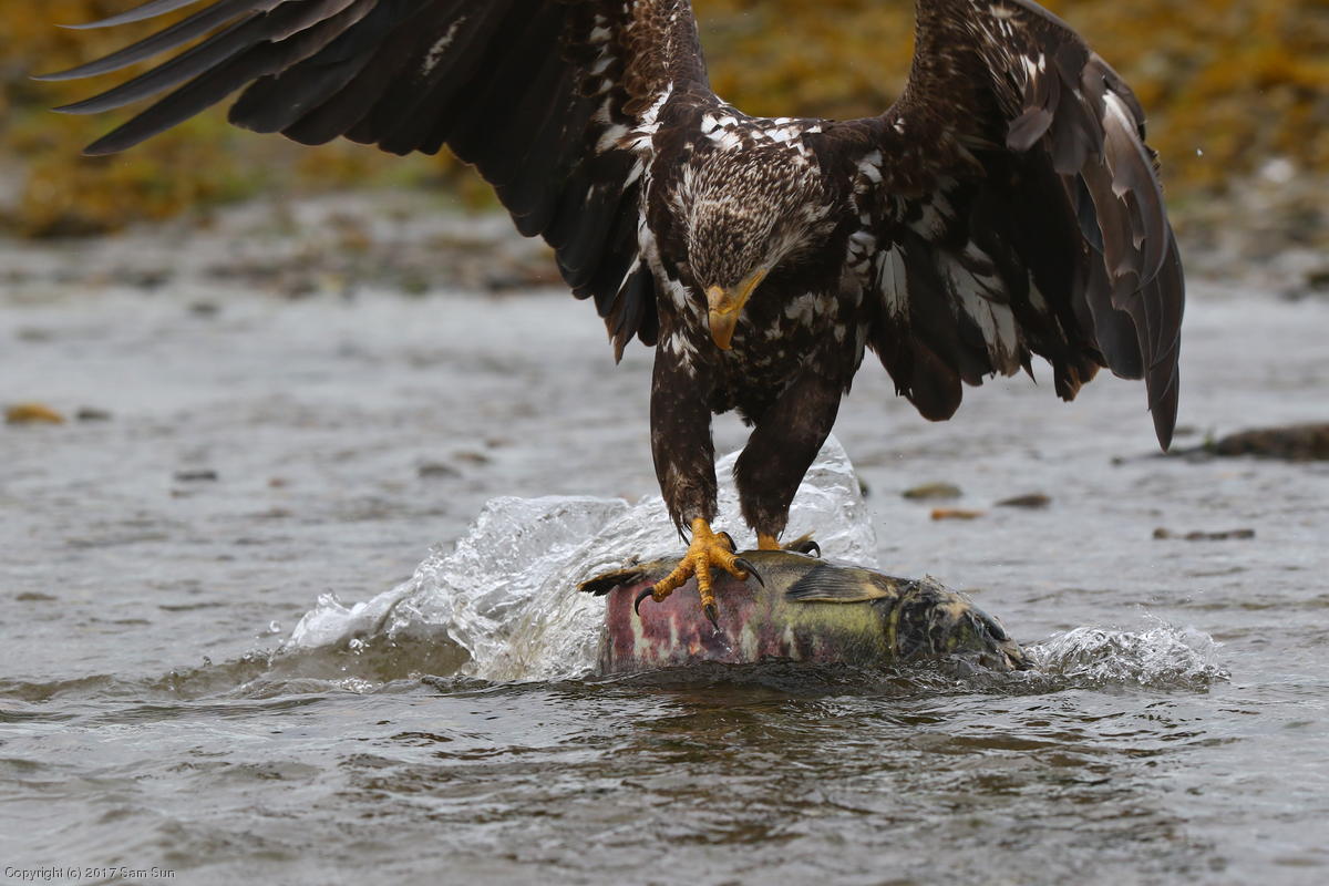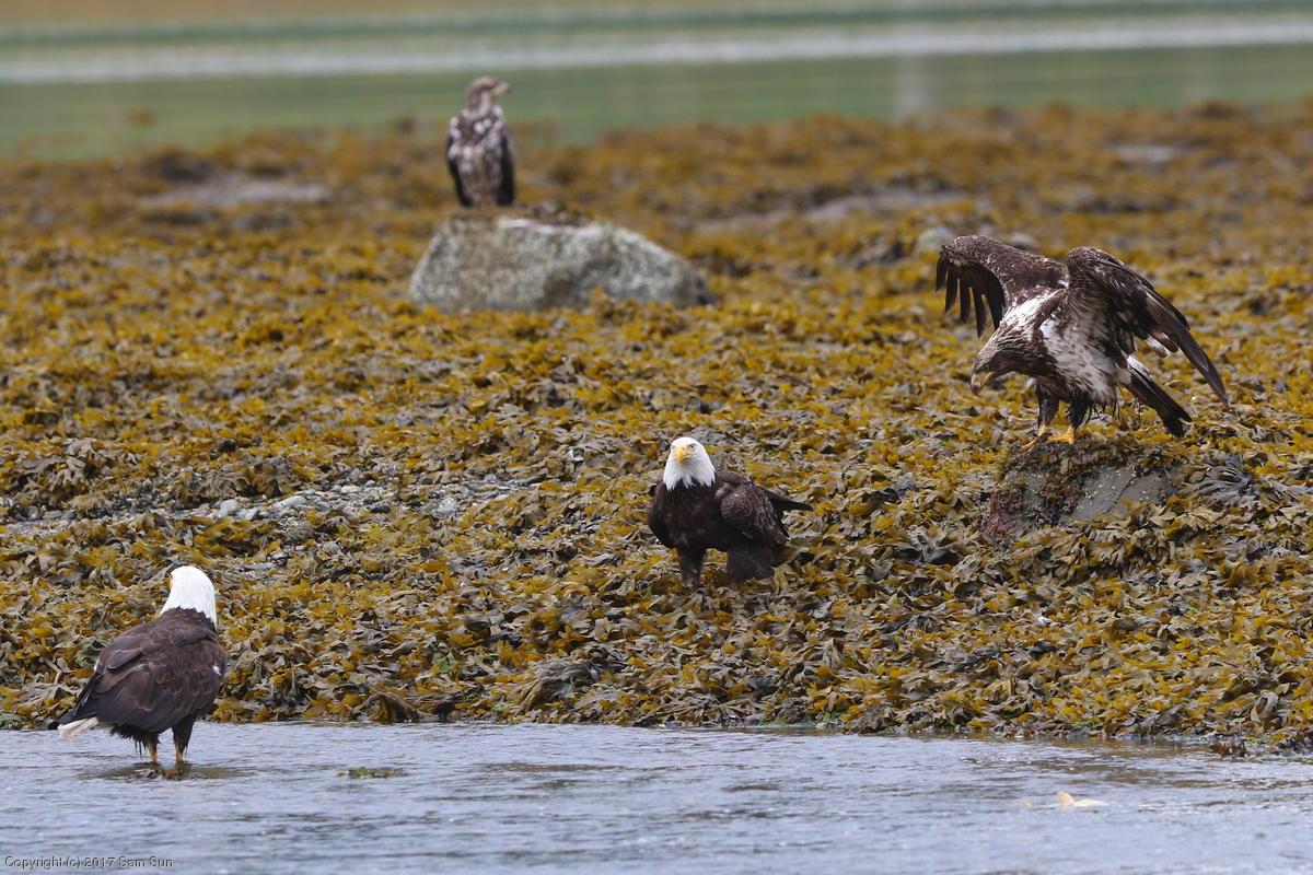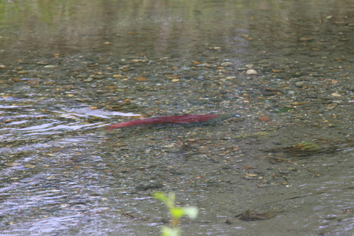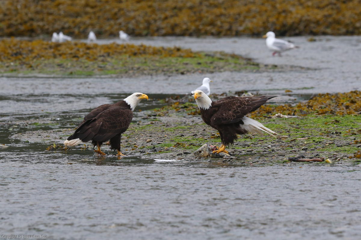 On the way back into town, I found the even more aptly named Salmon Creek. There were a tremendous number of salmon, eagles, and gulls gathered. A 15.9 foot high tide at 9:23p was coming in, which was driving the birds off.