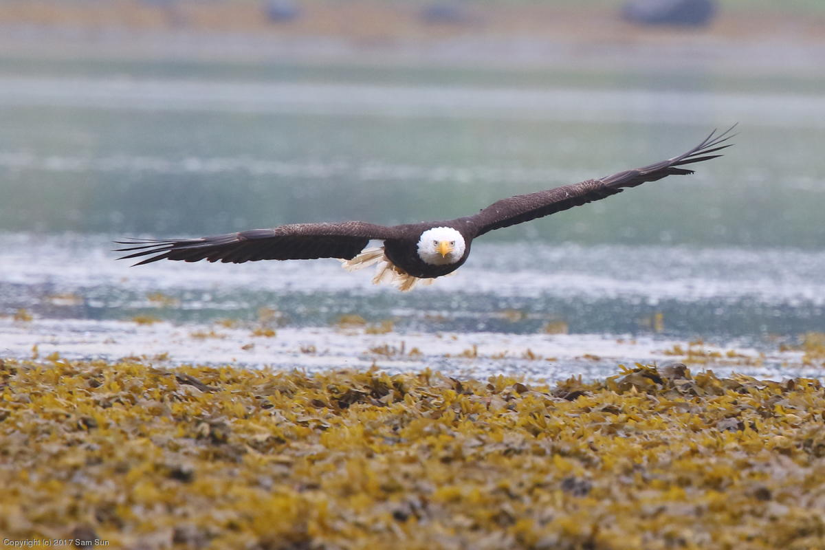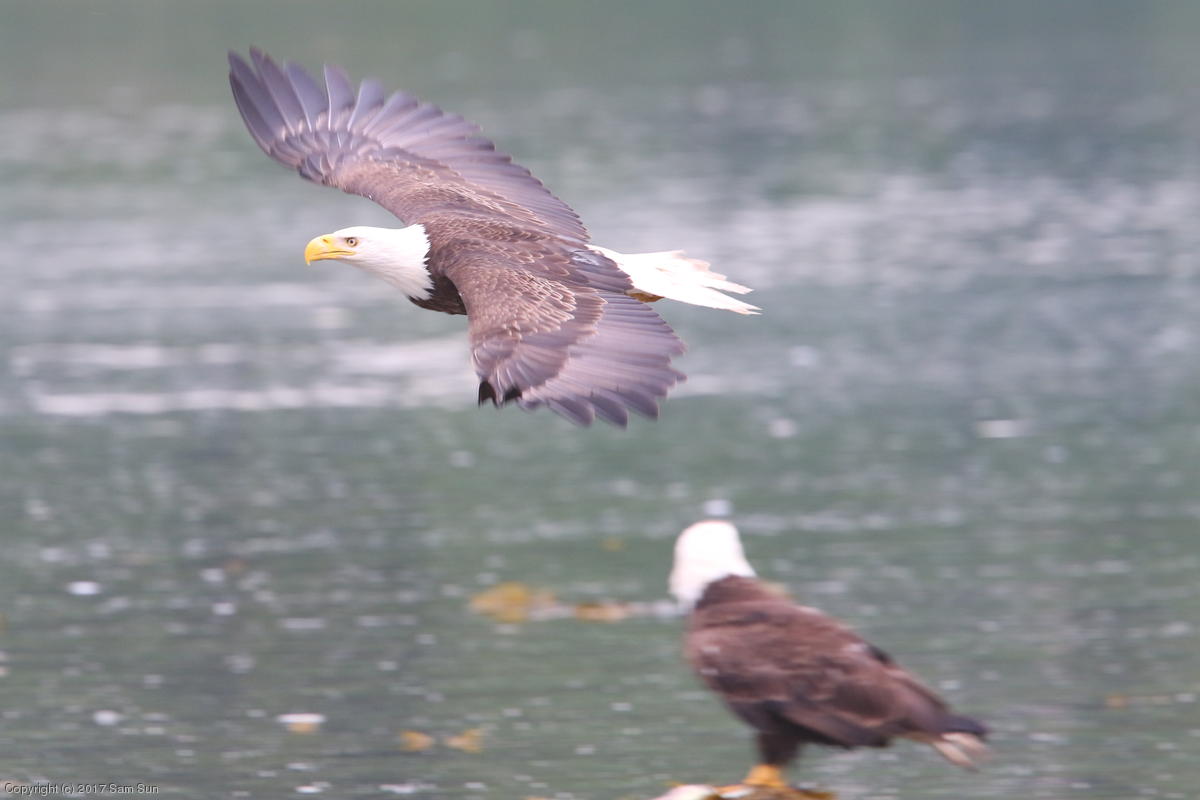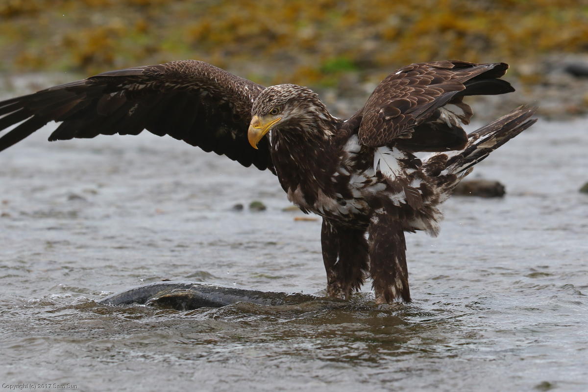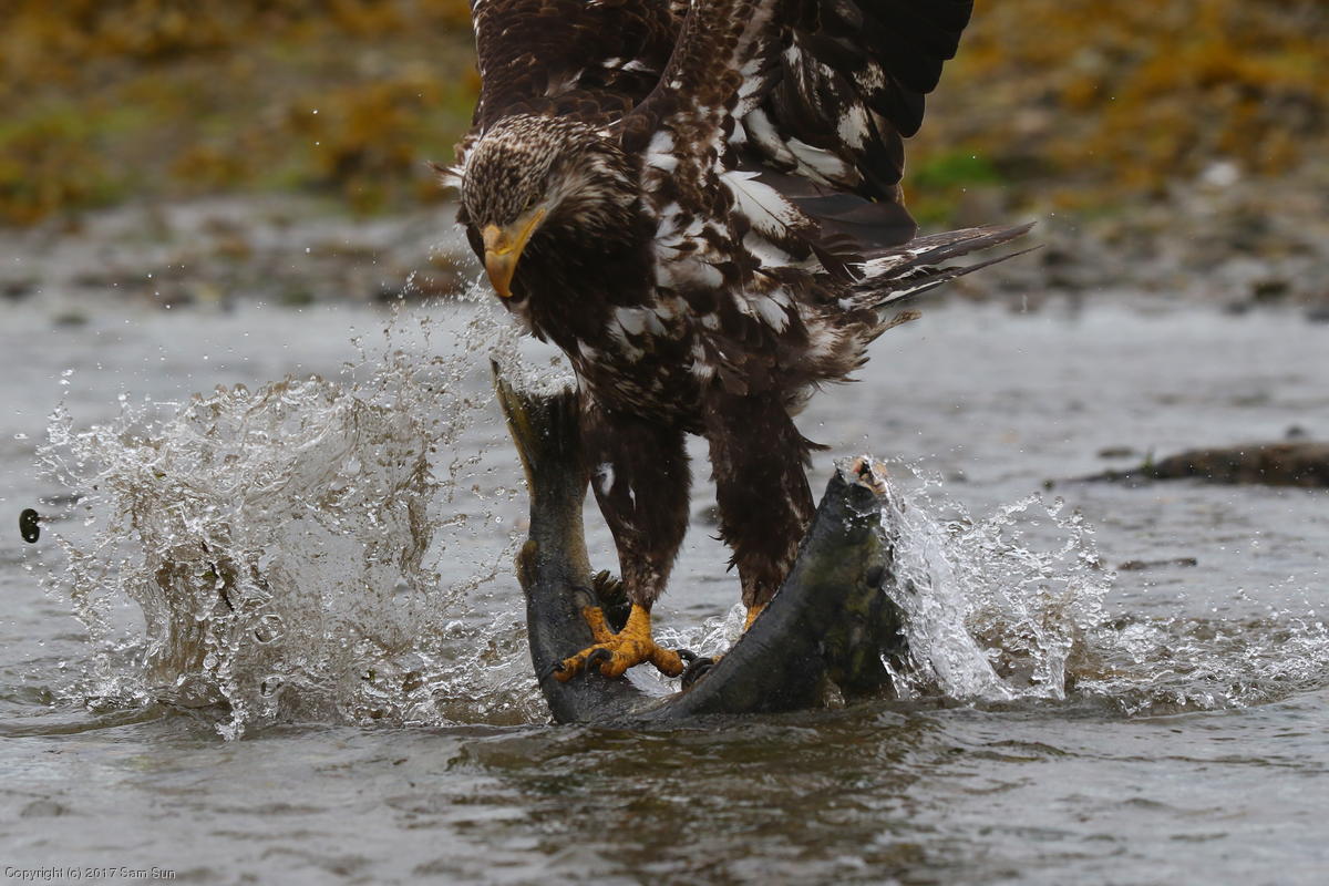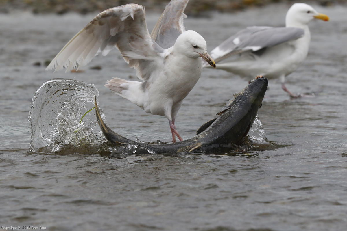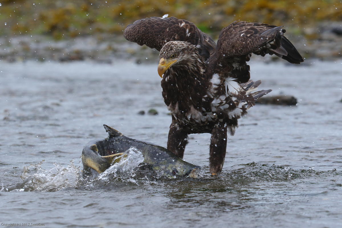 On the way back into town, I found the even more aptly named Salmon Creek. There were a tremendous number of salmon, eagles, and gulls gathered. A 15.9 foot high tide at 9:23p was coming in, which was driving the birds off.