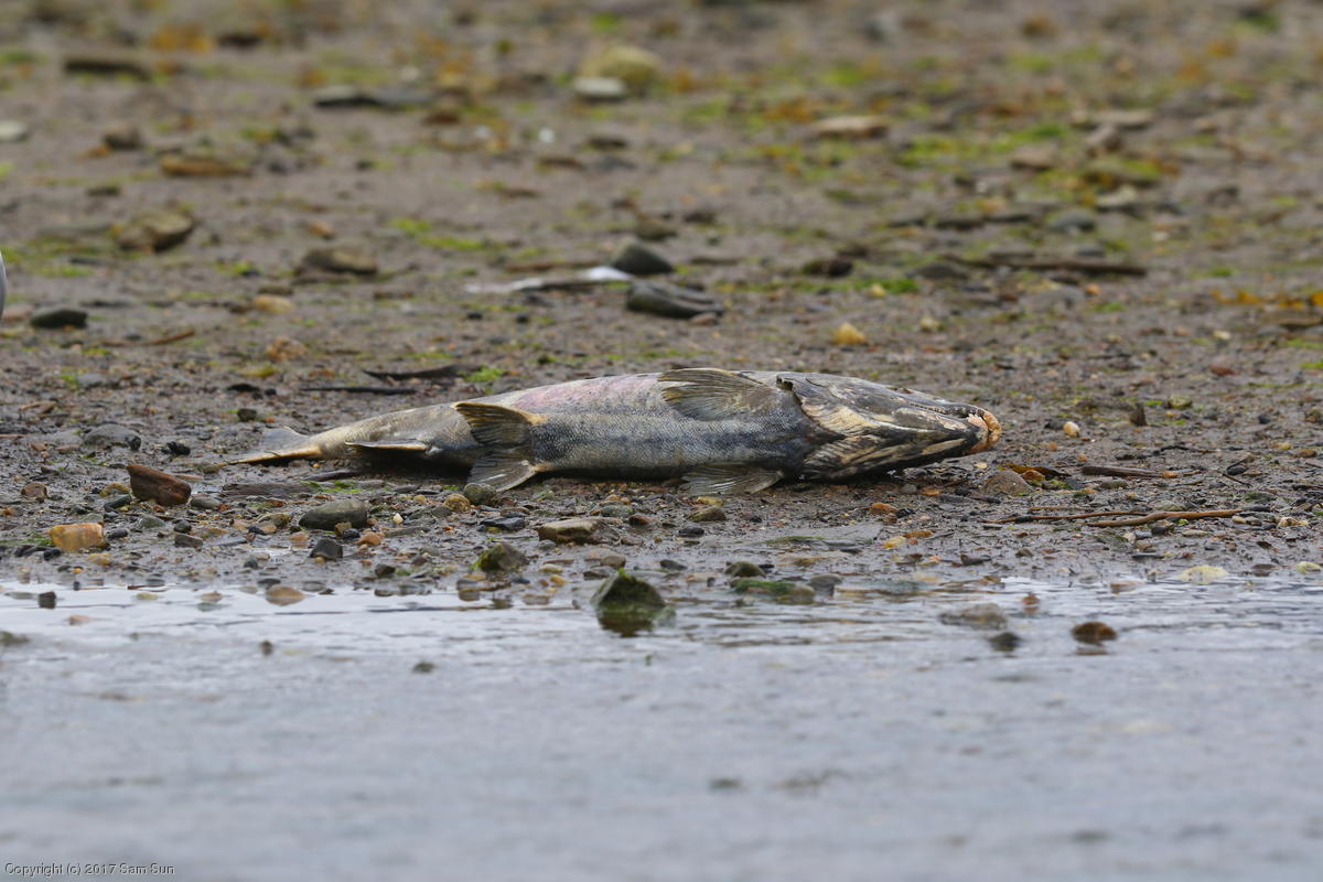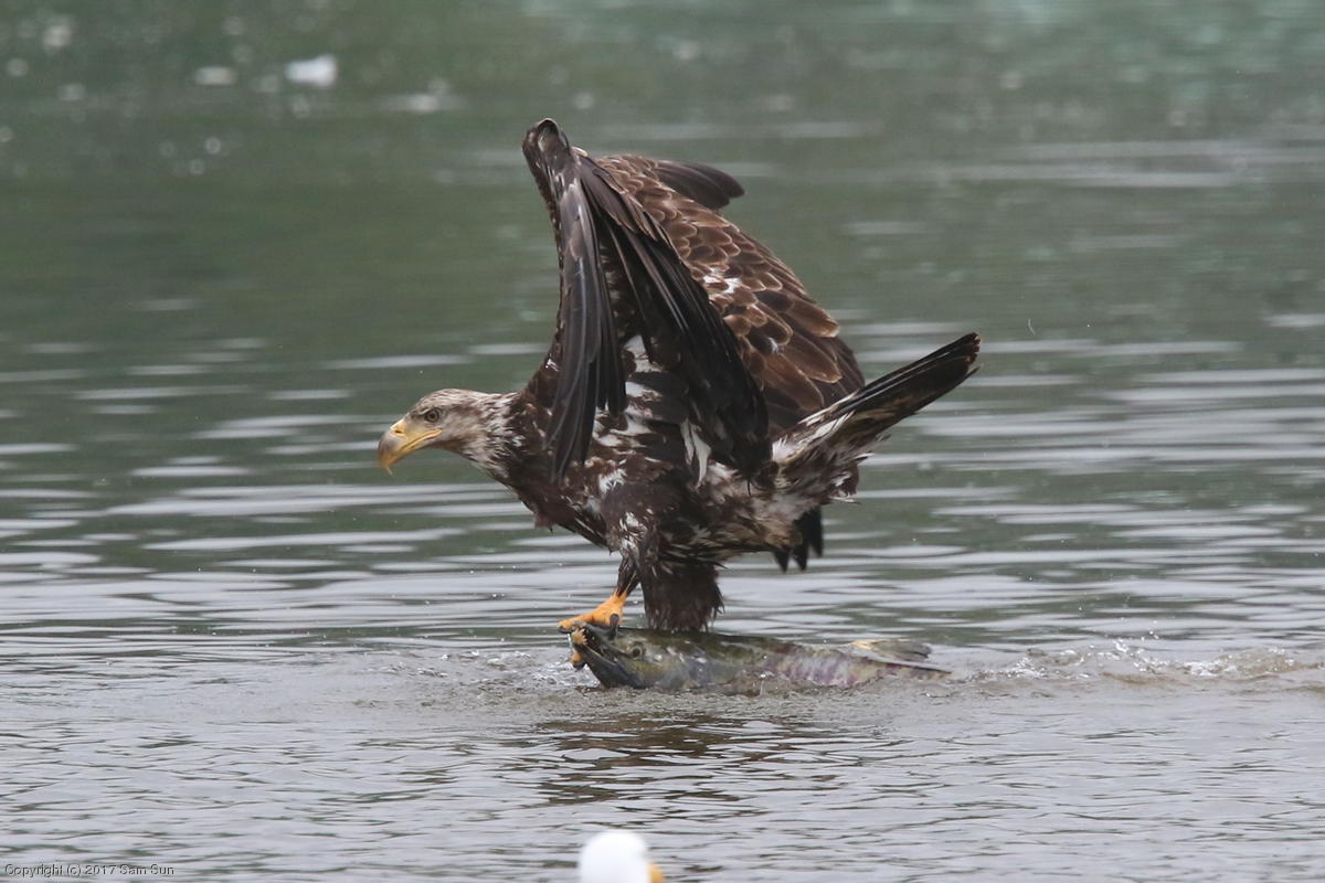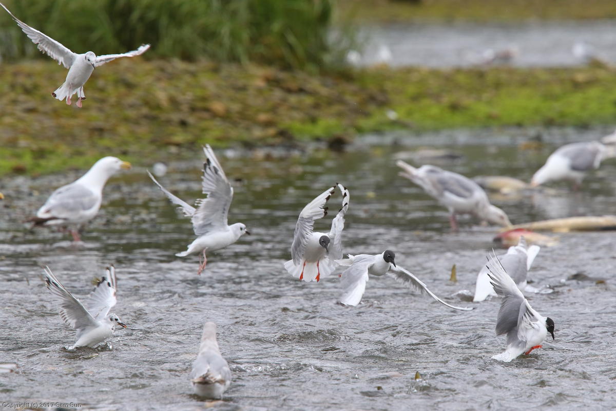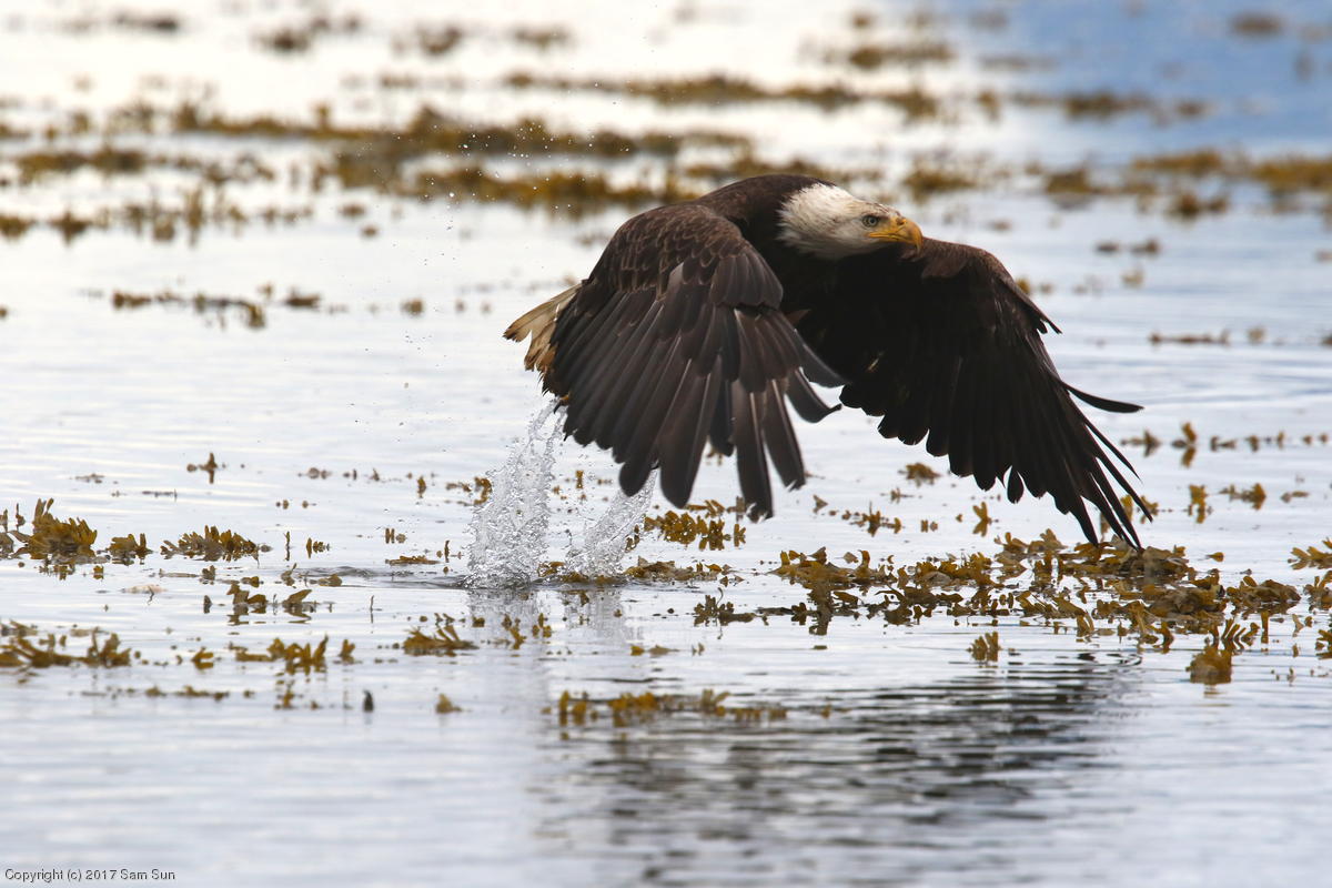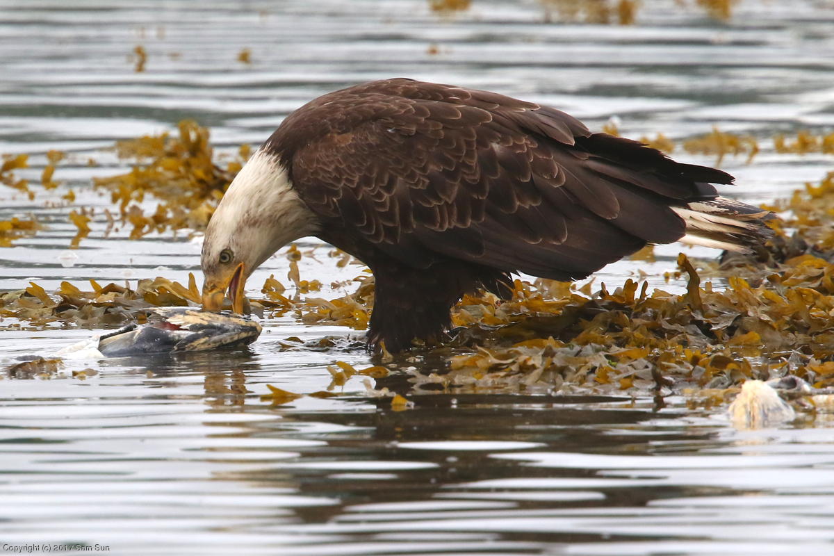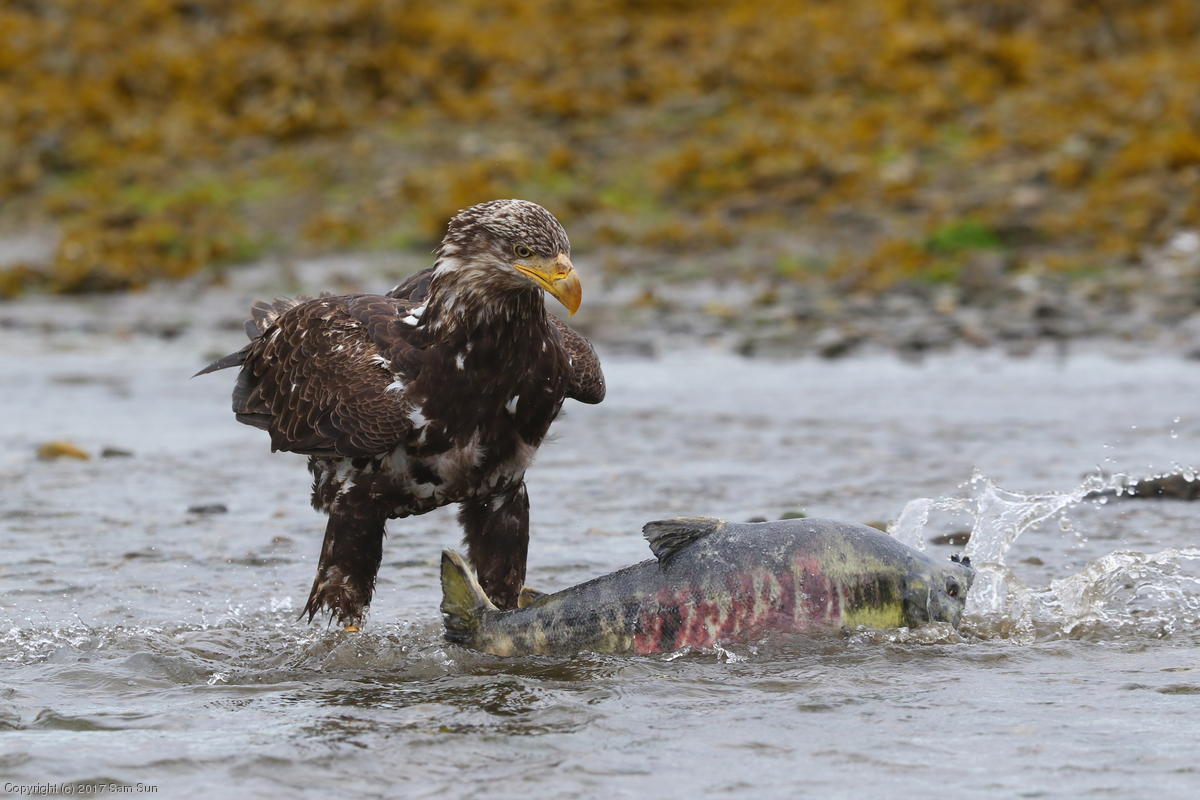 On the way back into town, I found the even more aptly named Salmon Creek. There were a tremendous number of salmon, eagles, and gulls gathered. A 15.9 foot high tide at 9:23p was coming in, which was driving the birds off.