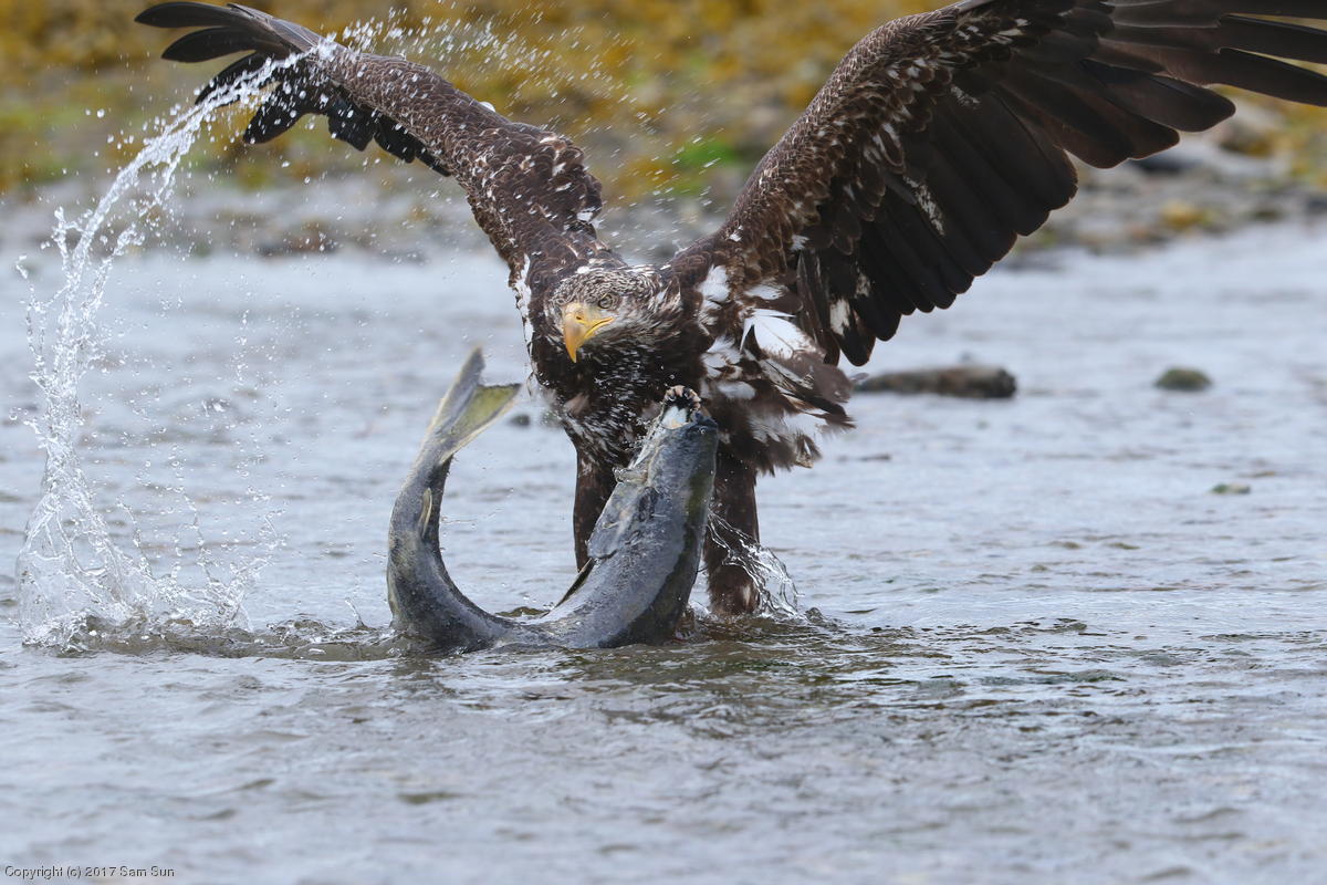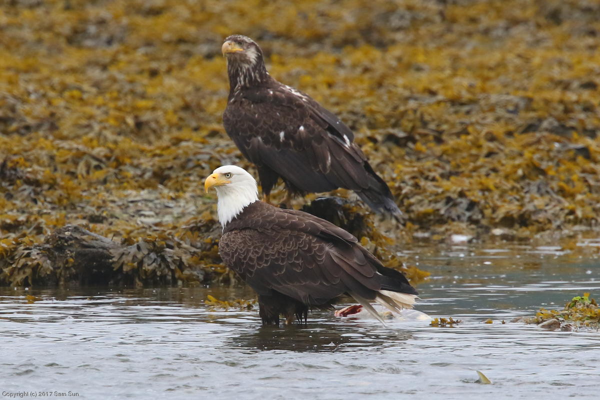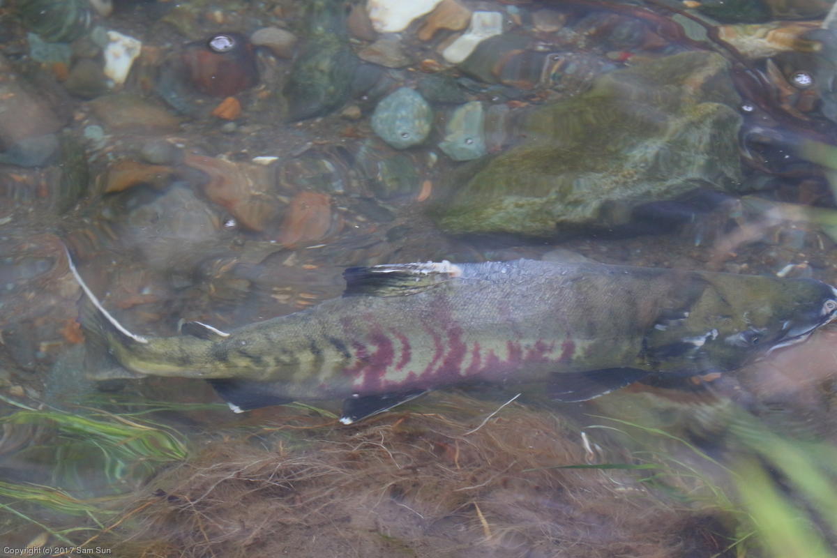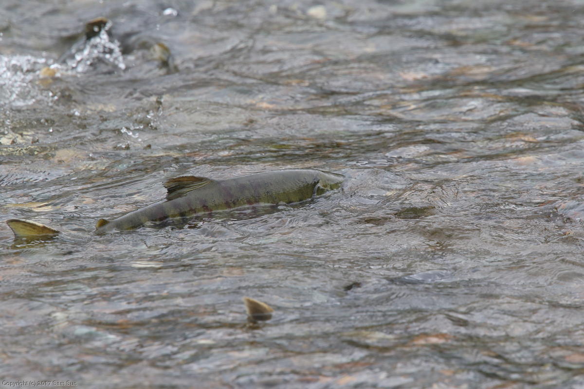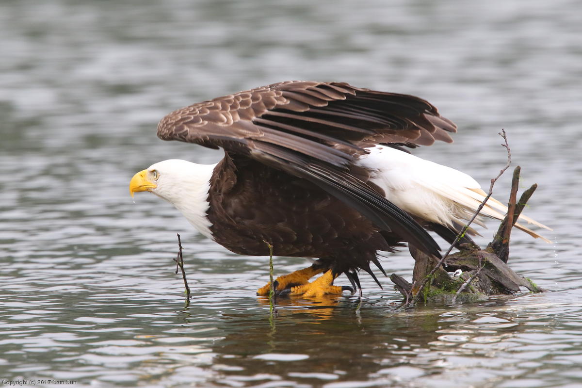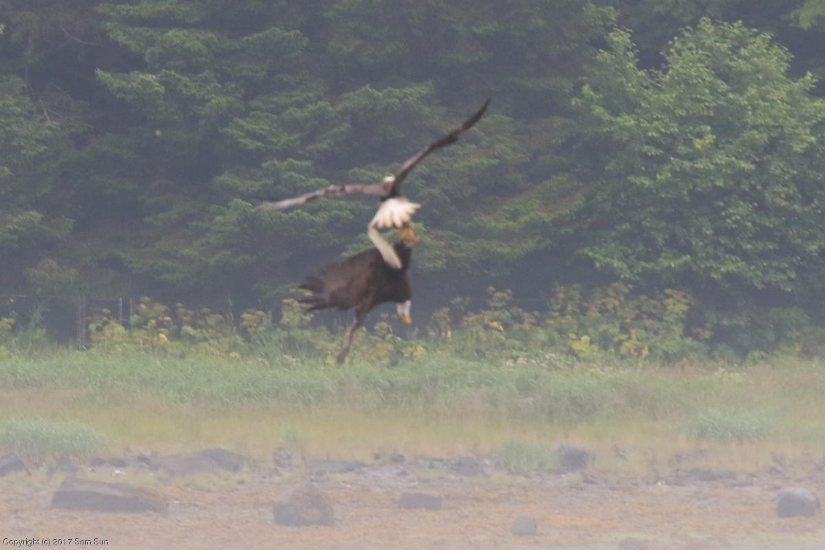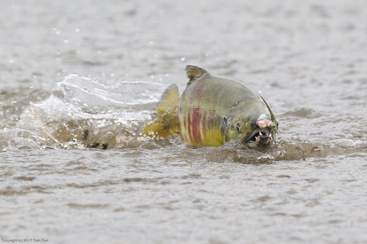 On the way back into town, I found the even more aptly named Salmon Creek. There were a tremendous number of salmon, eagles, and gulls gathered. A 15.9 foot high tide at 9:23p was coming in, which was driving the birds off.