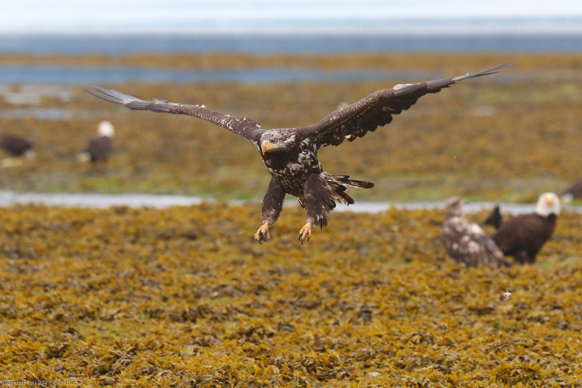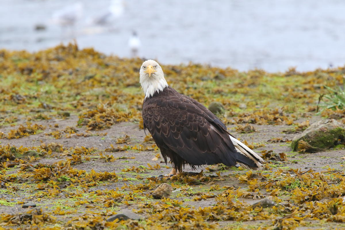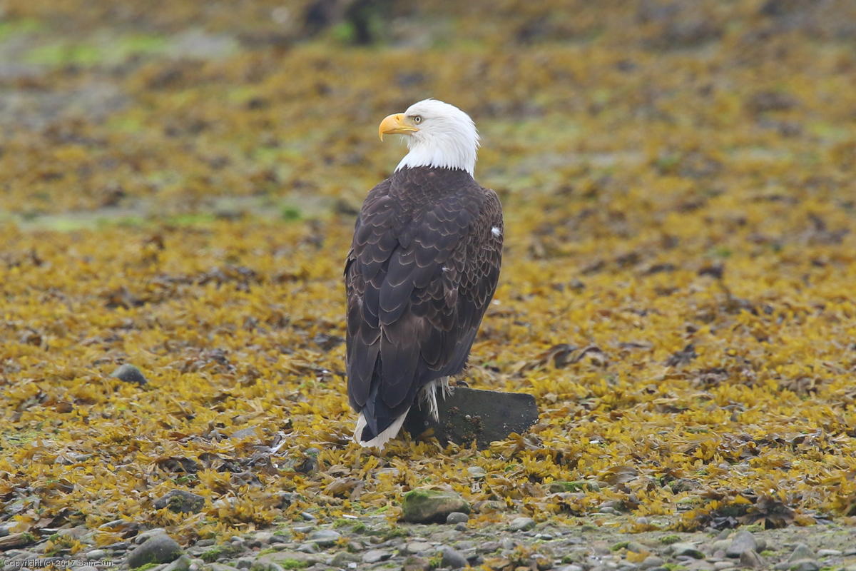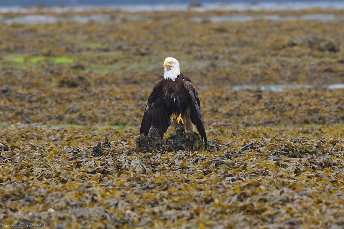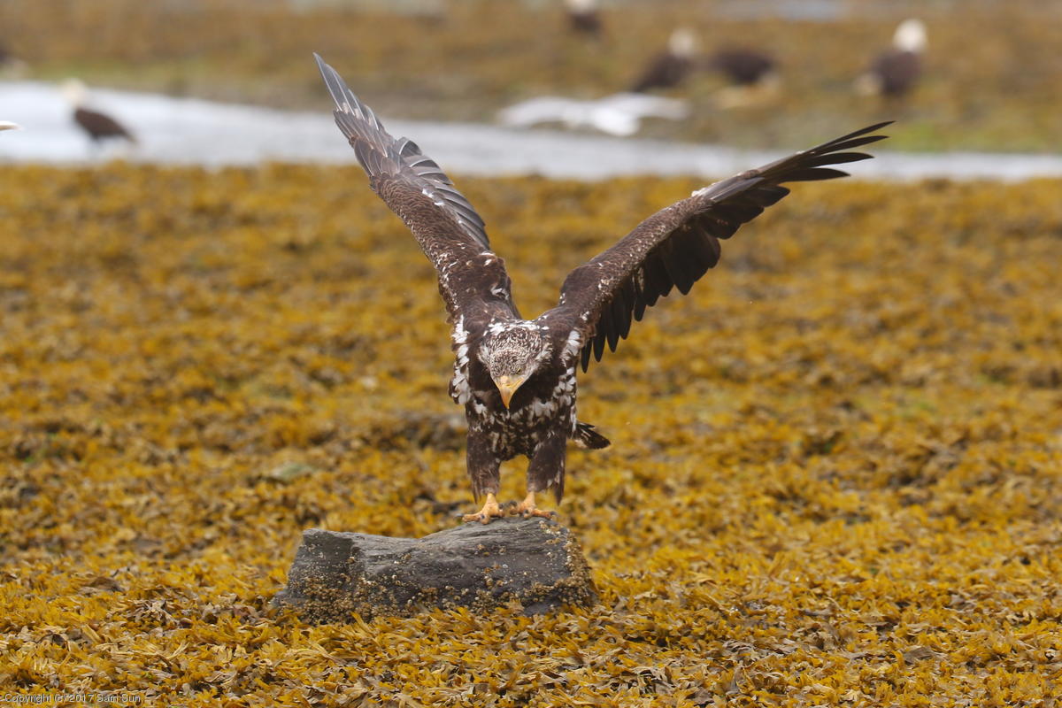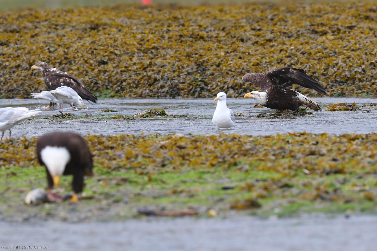 I spent much of the day at Salmon Creek. A 12.9 foot high tide at 10:28a was to be followed by a 3.5 foot low tide at 4:12p, so after all the eagles left in the morning, I did some gift shopping in town and came back as the tide was going back out.