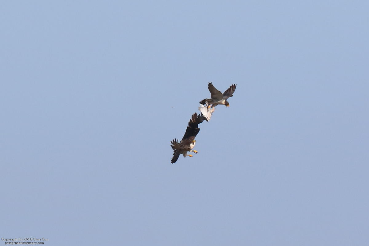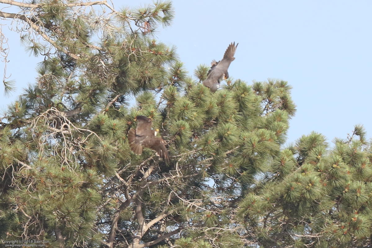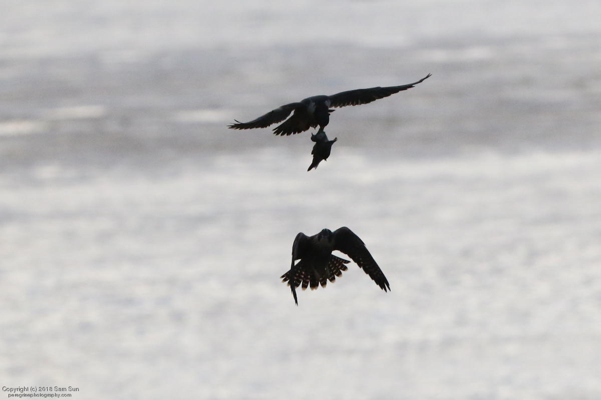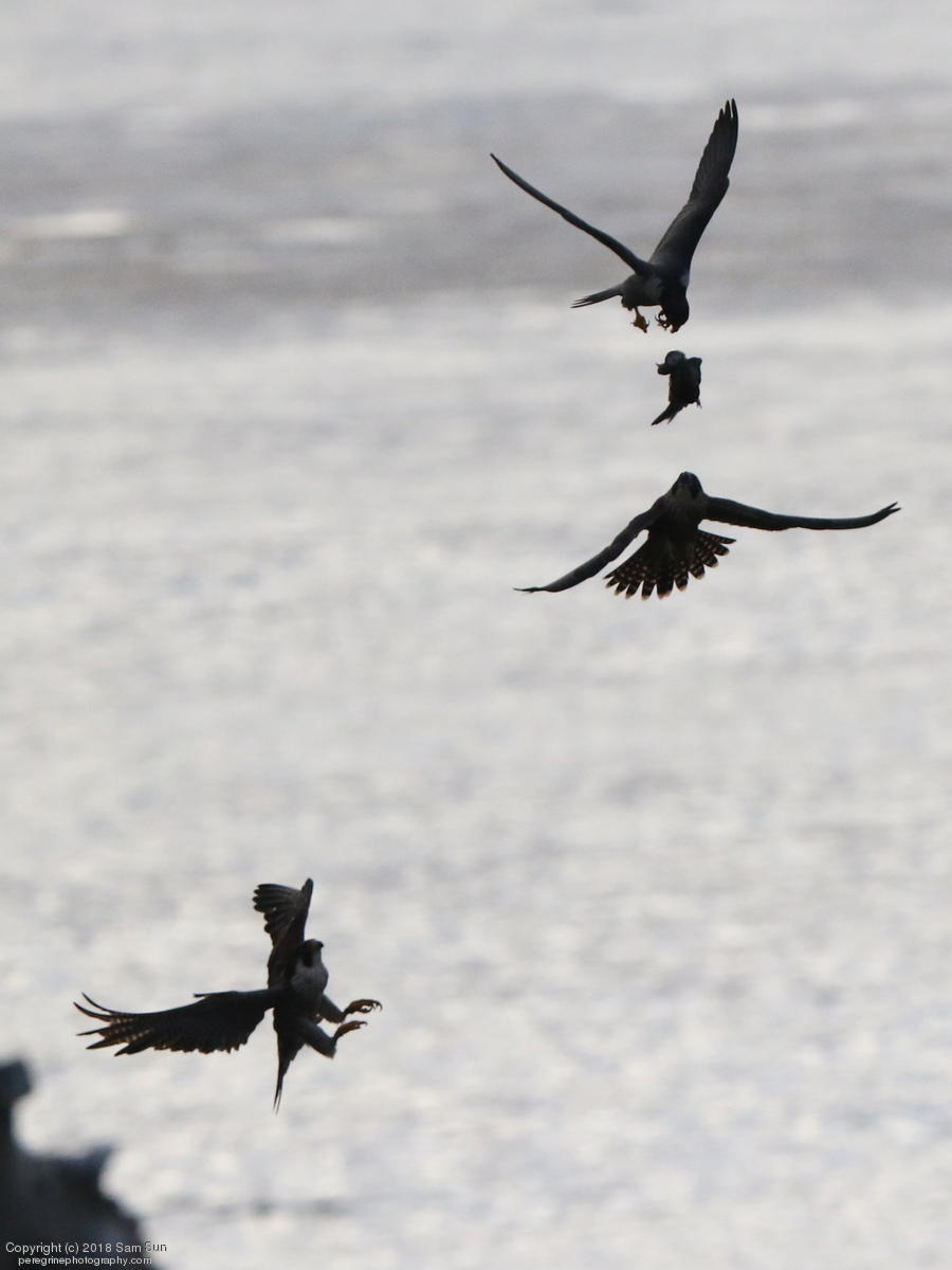 The juveniles flew a little, but no dogfighting. A juvenile took a food transfer, then got chased around a little before finding a quiet place to eat.