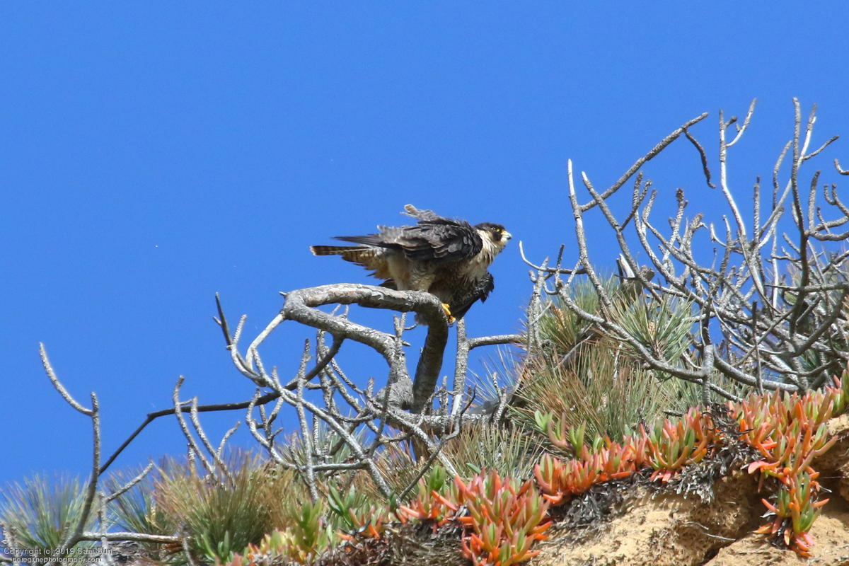 It looks like 16AC has a new, unbanded mate. It also looks like the nest site may have moved further down the beach, as they repeatedly visited a particular ledge. A third falcon showed up and there was much chasing around.