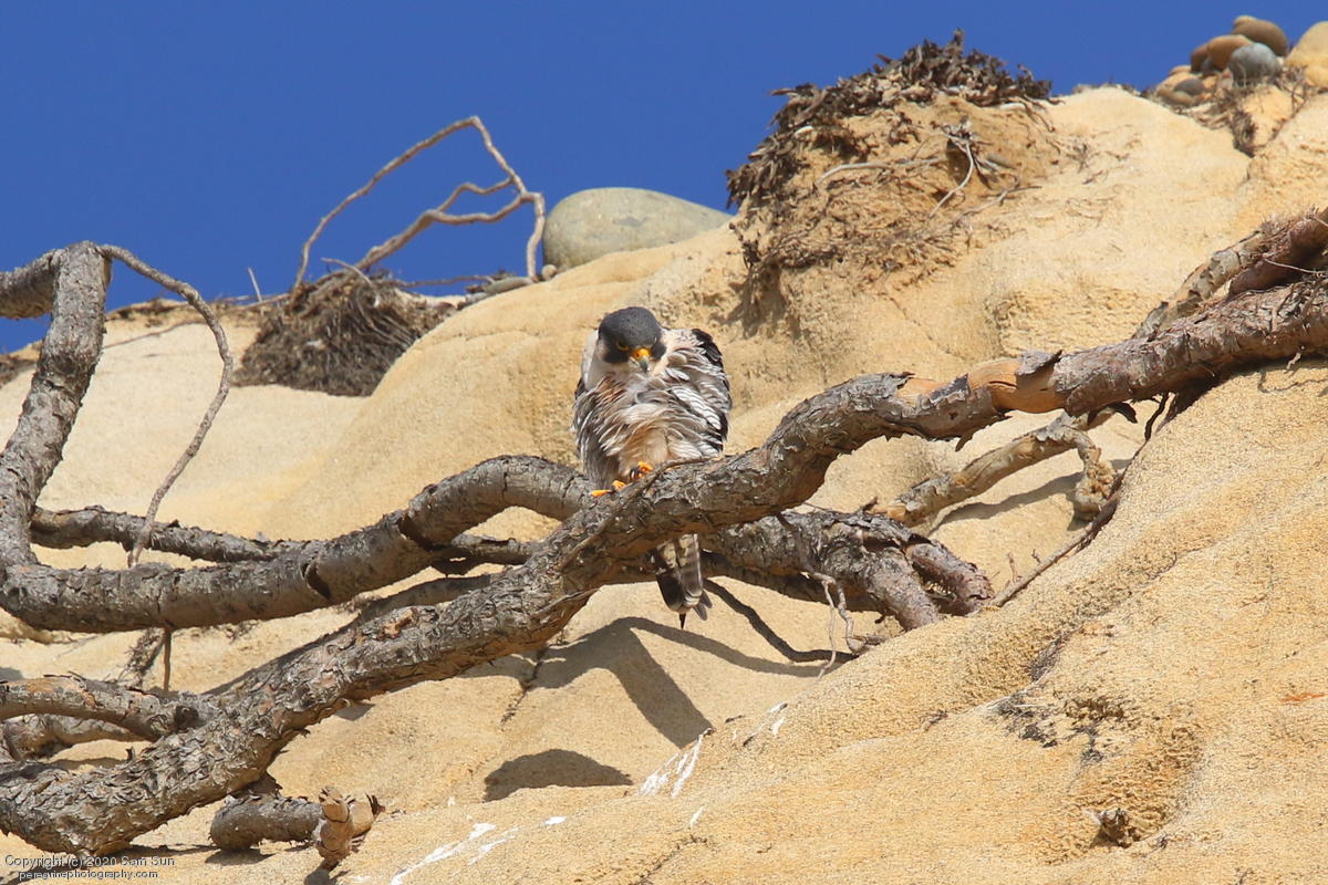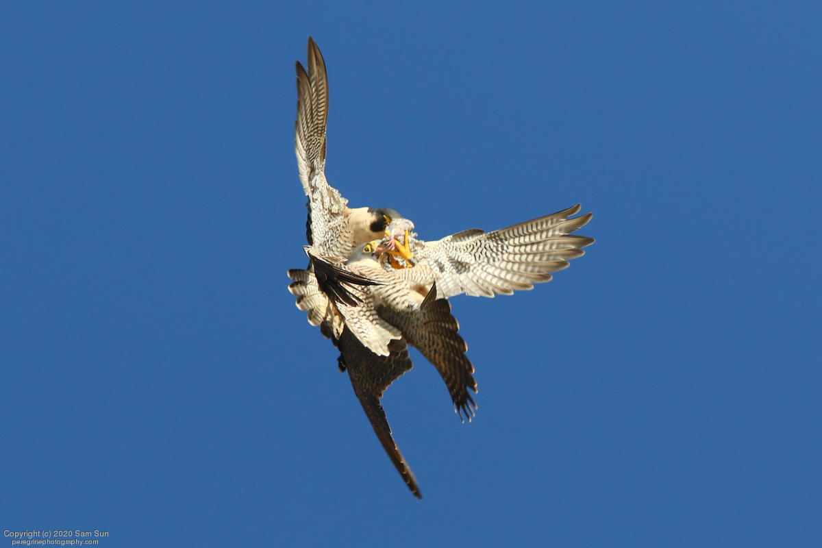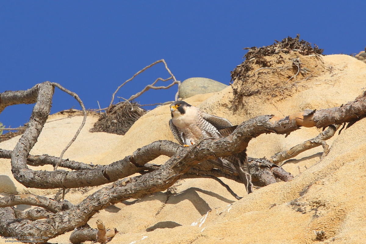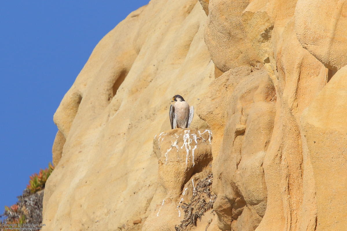 The male brought in some food and played keep away from the female for a bit, then went towards the north end of the cliff to eat. He eventually transfered the leftovers to the female, then went to preen. After a long wait, they mated twice in about half an hour (~3:55, 4:20p).