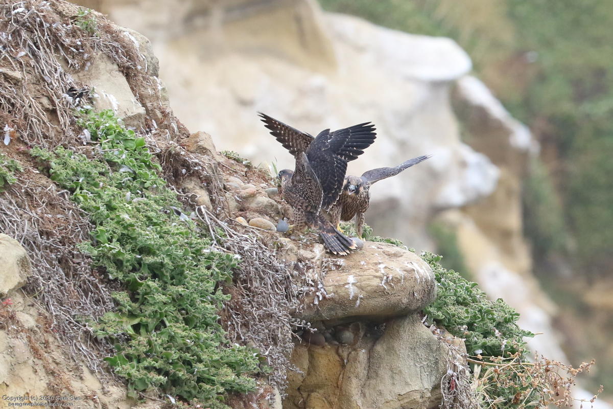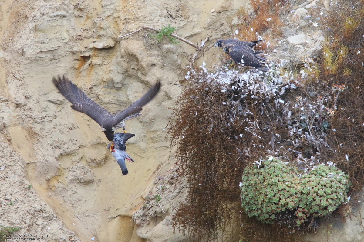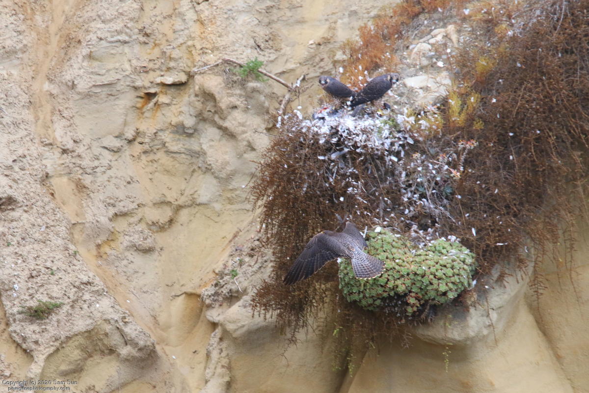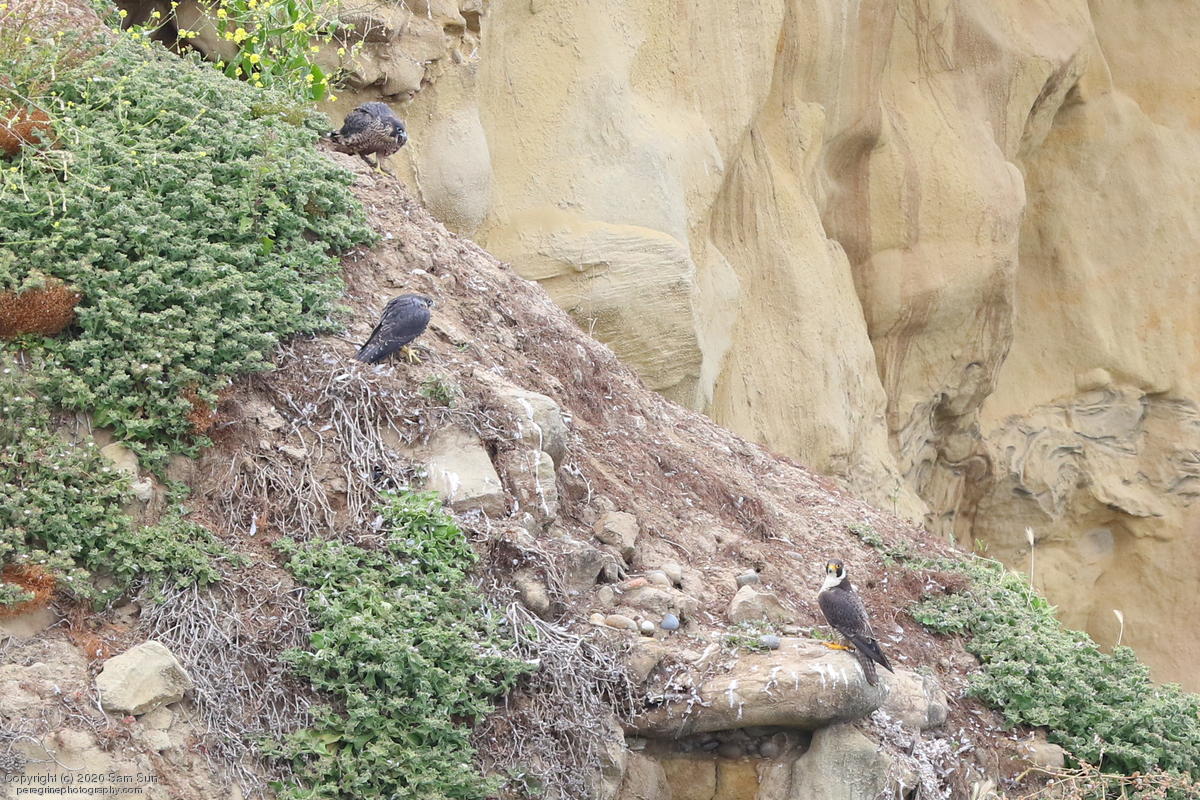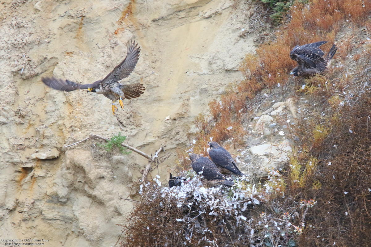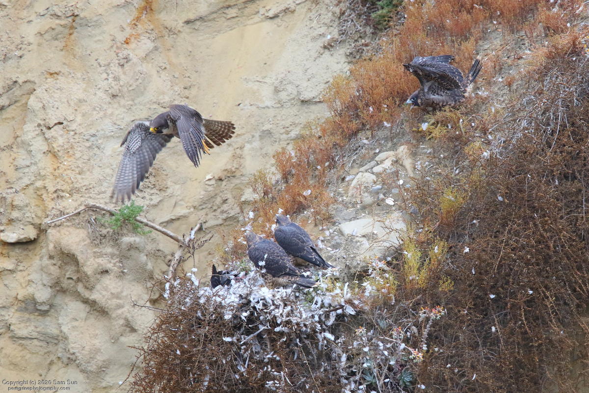Three chicks at La Jolla have fledged - about 2-3 days ago according to other photographers. They were making some short flights today. The parents made two food deliveries during the afternoon.