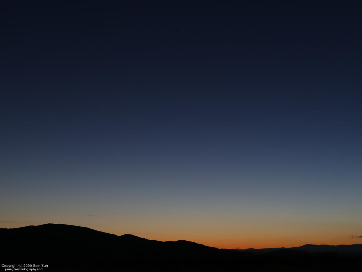 Capella is the star at top; comet is speck above middle-left peak