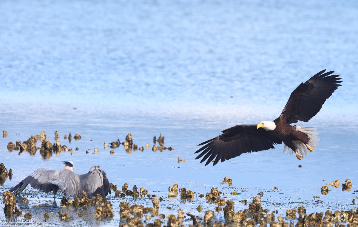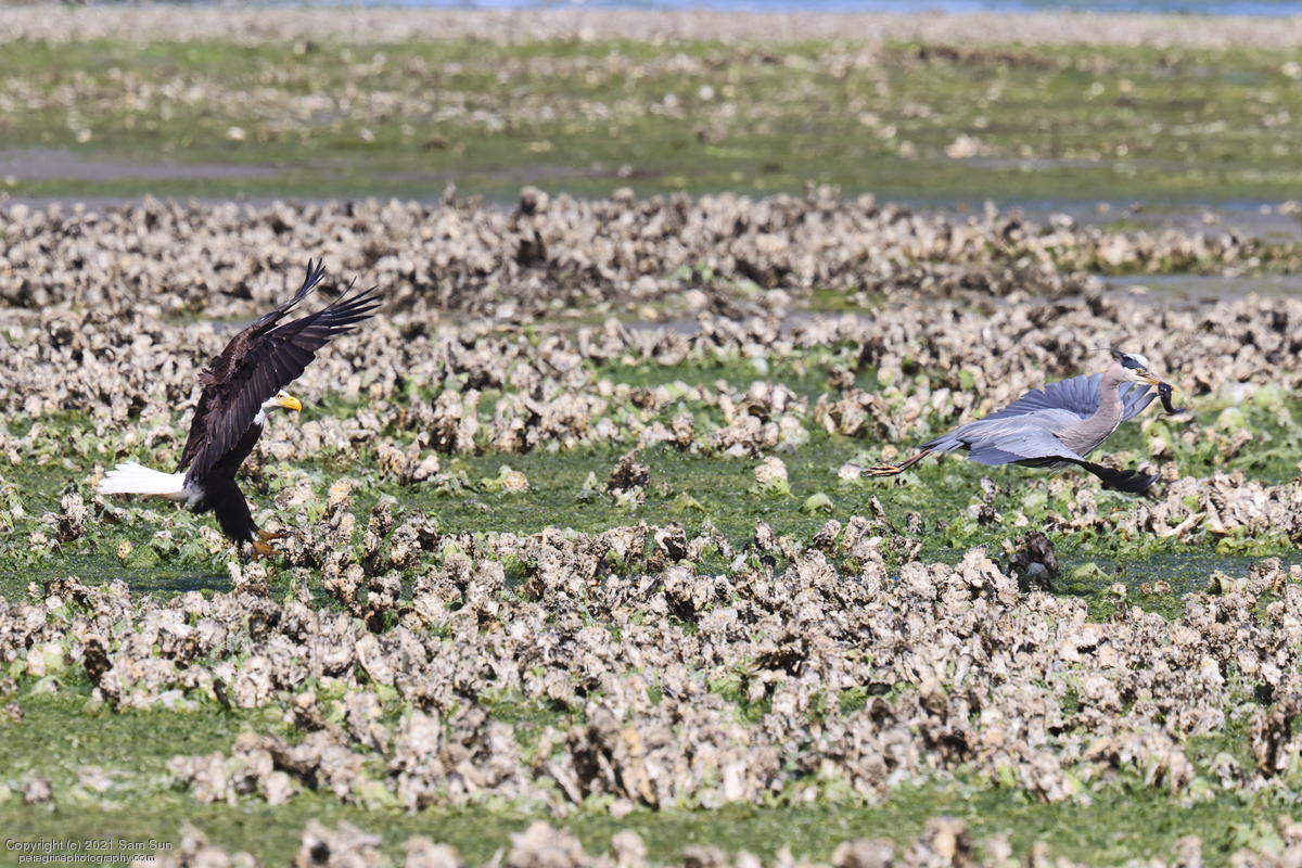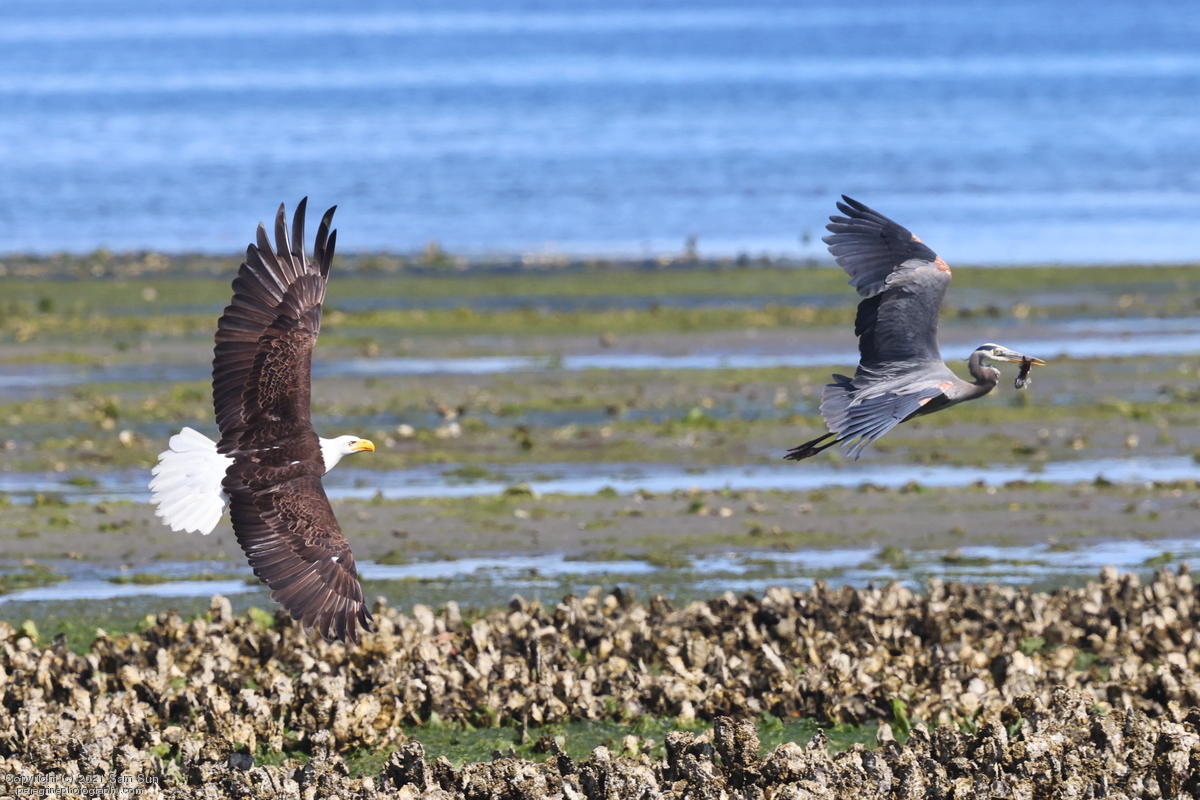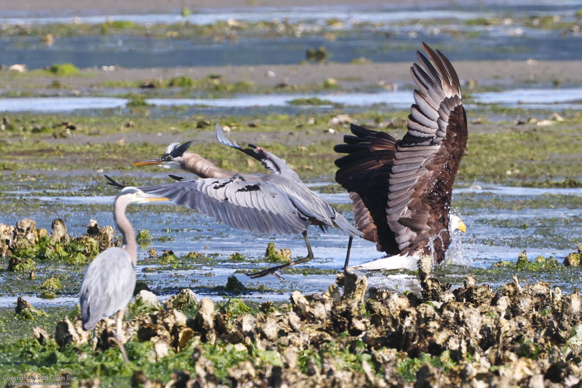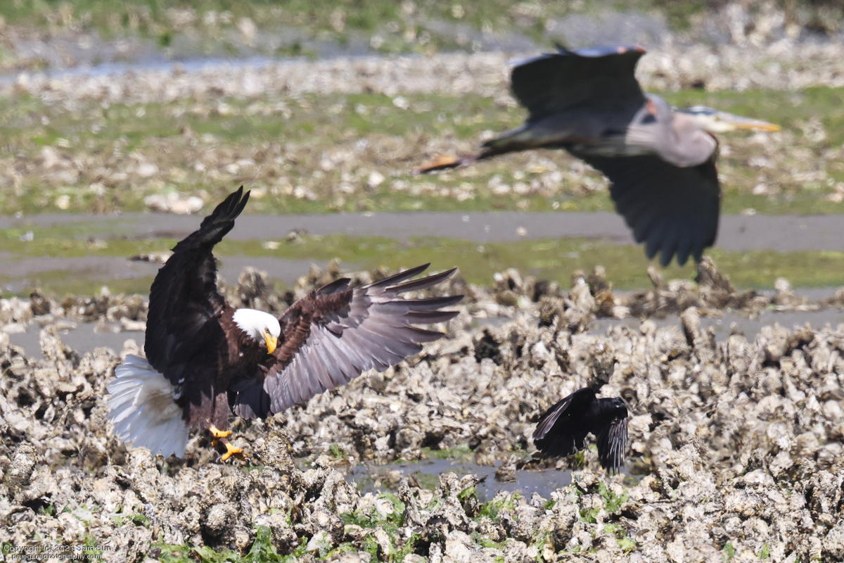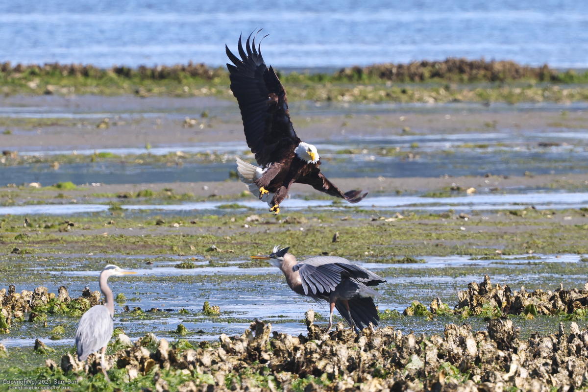 Midshipman fish bring the birds and photographers to Seabeck. The fish spawn among the oyster beds and are easy prey at low tide. The herons show up first as the tide goes out, then the eagles.