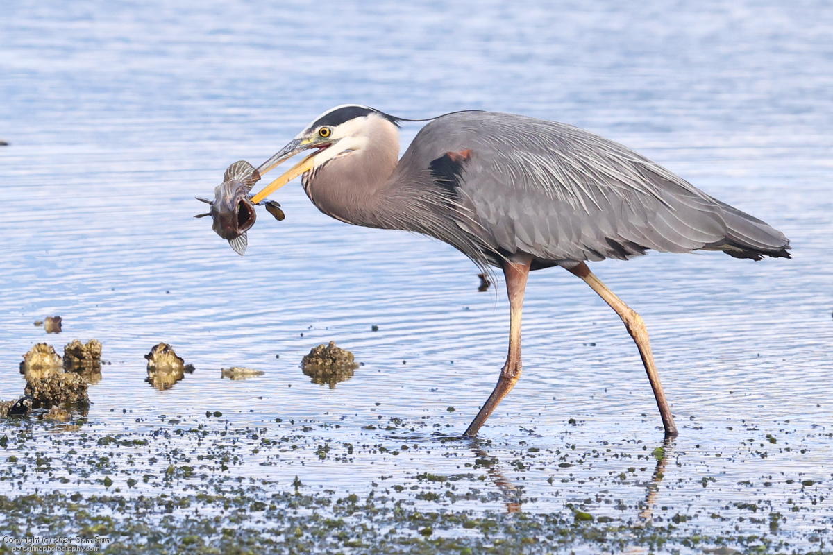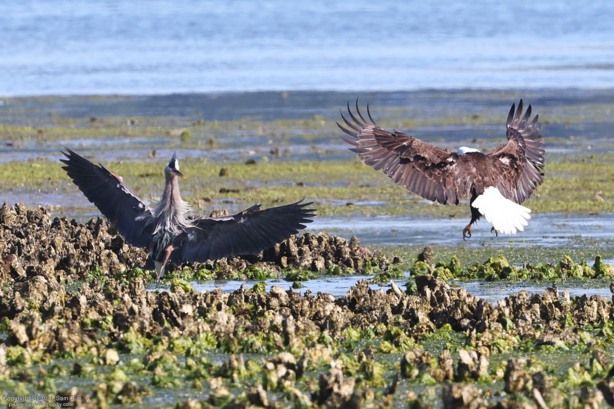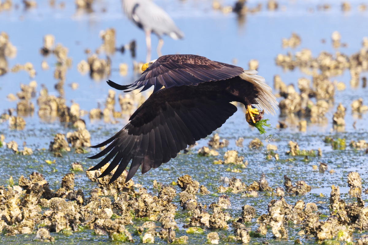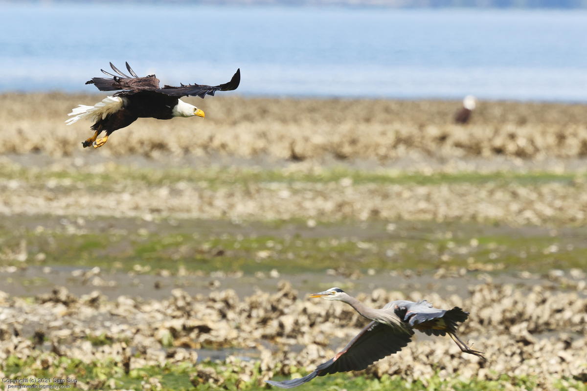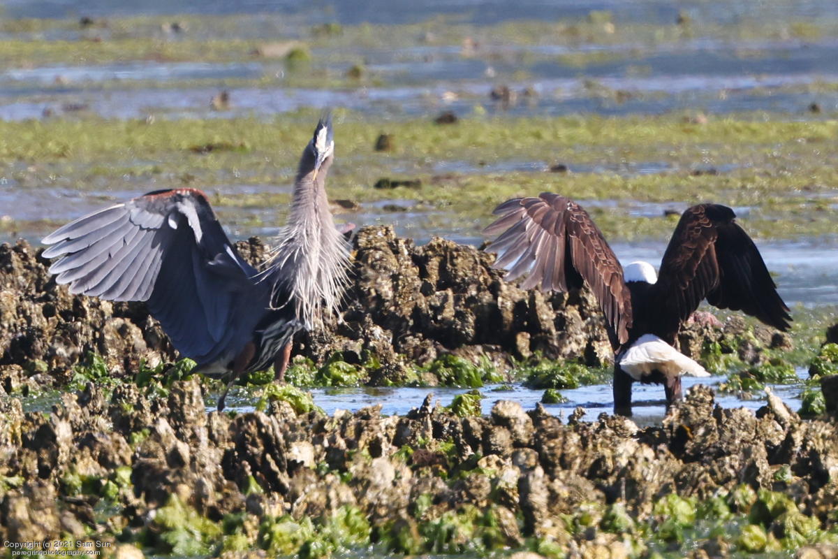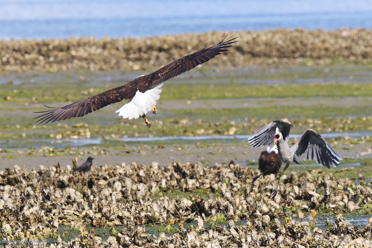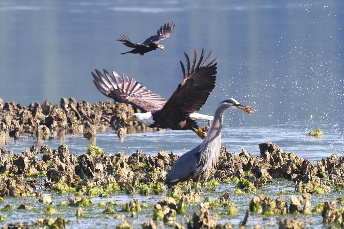 Midshipman fish bring the birds and photographers to Seabeck. The fish spawn among the oyster beds and are easy prey at low tide. The herons show up first as the tide goes out, then the eagles.