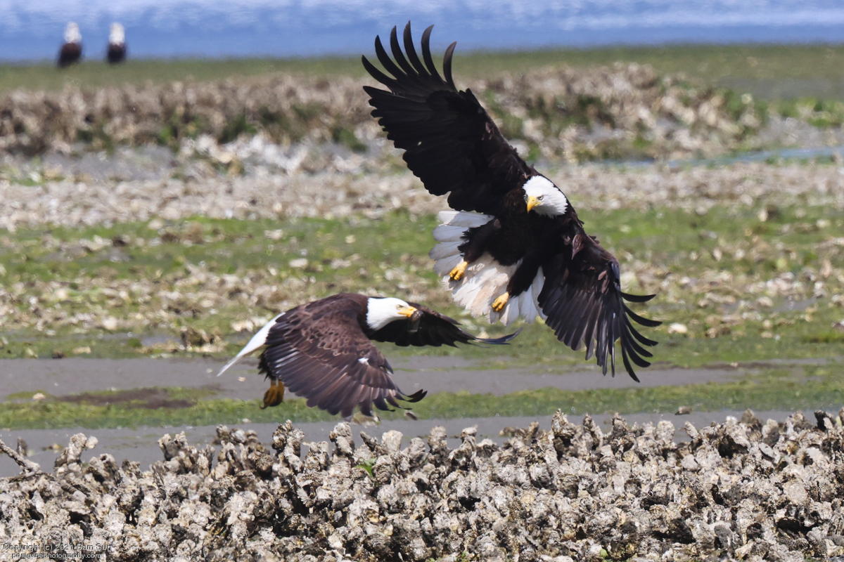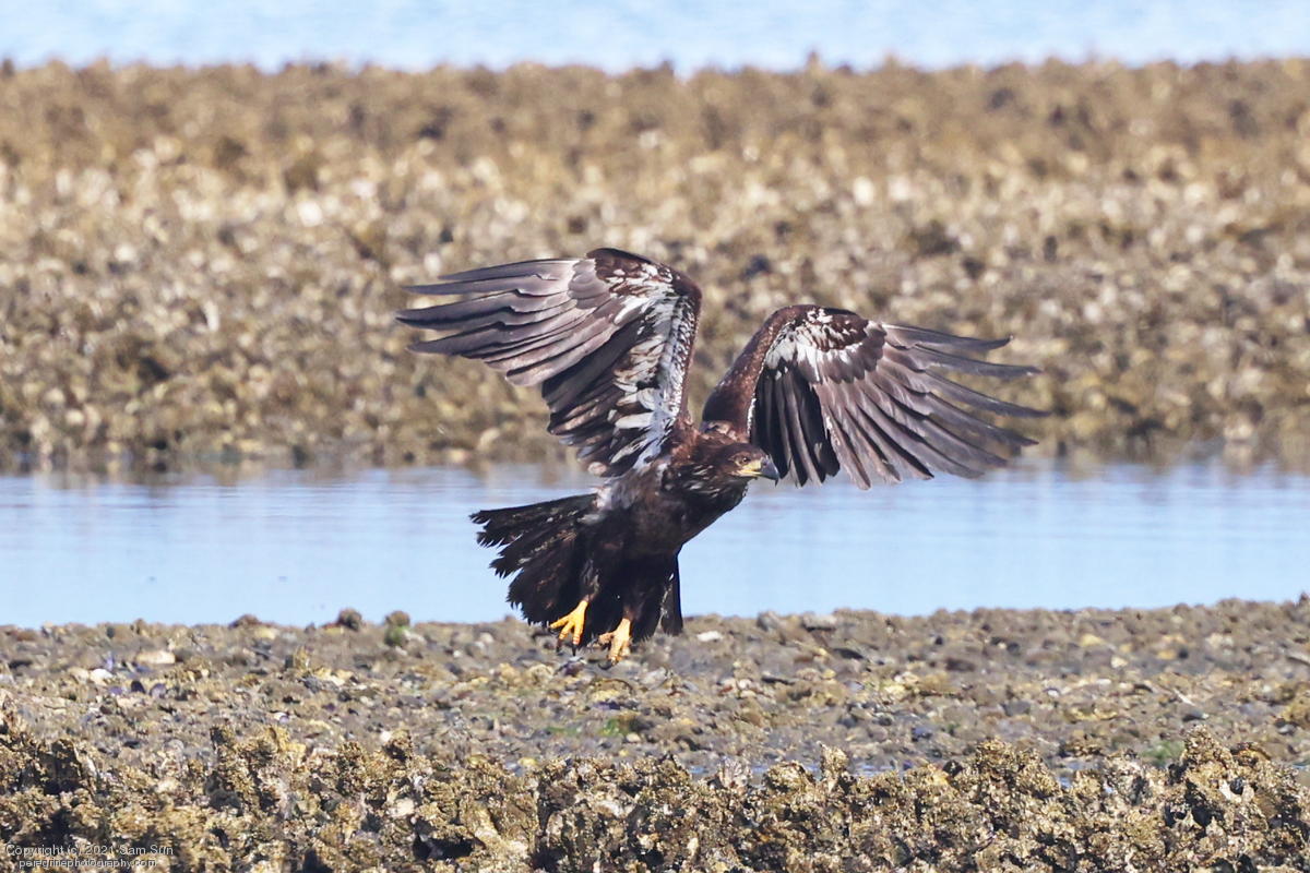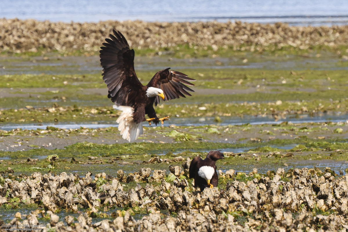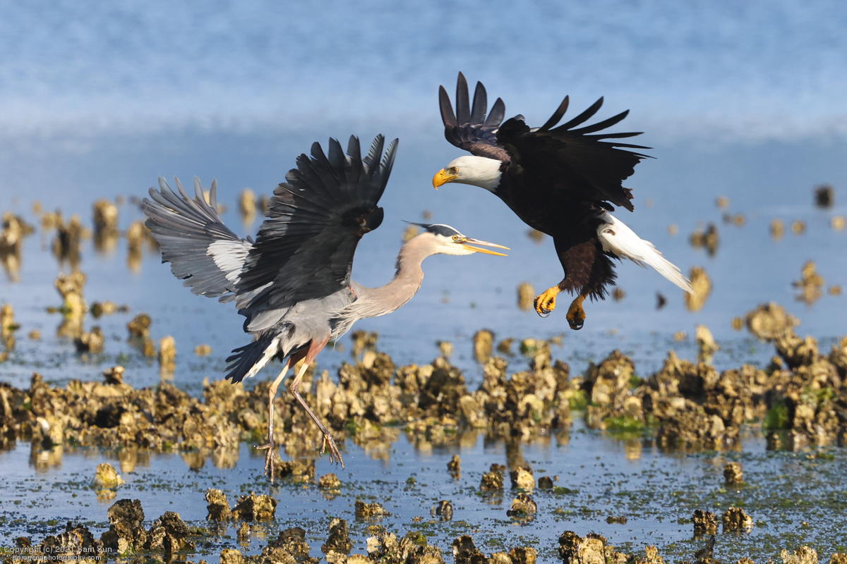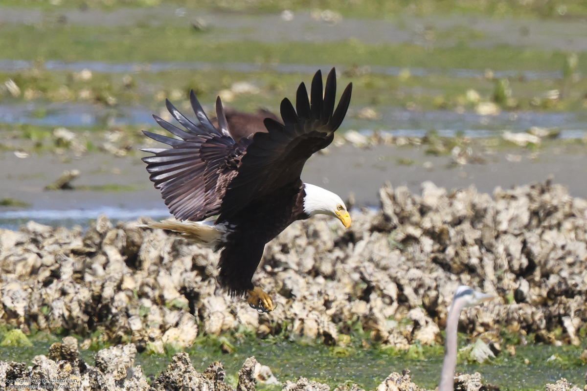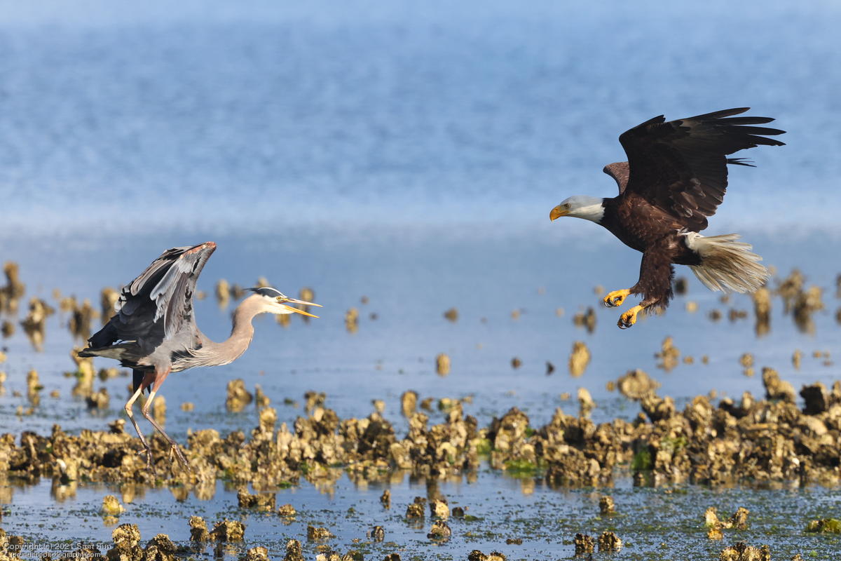 Midshipman fish bring the birds and photographers to Seabeck. The fish spawn among the oyster beds and are easy prey at low tide. The herons show up first as the tide goes out, then the eagles.