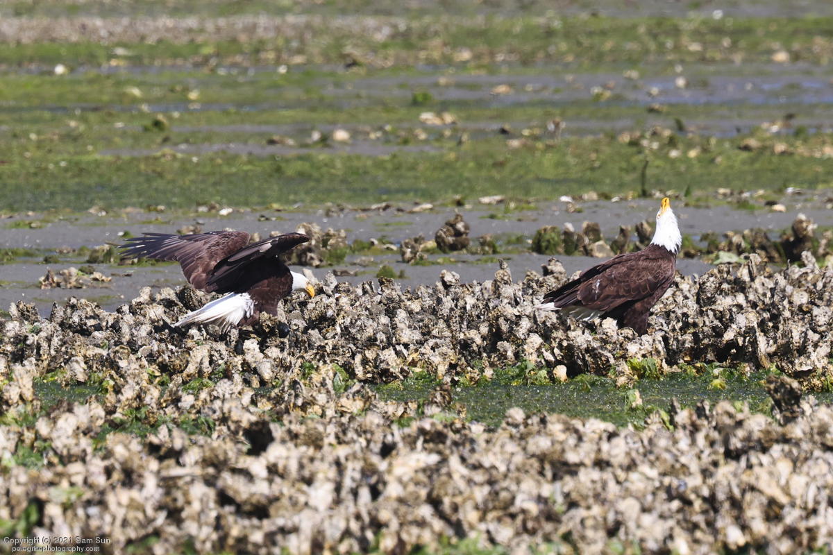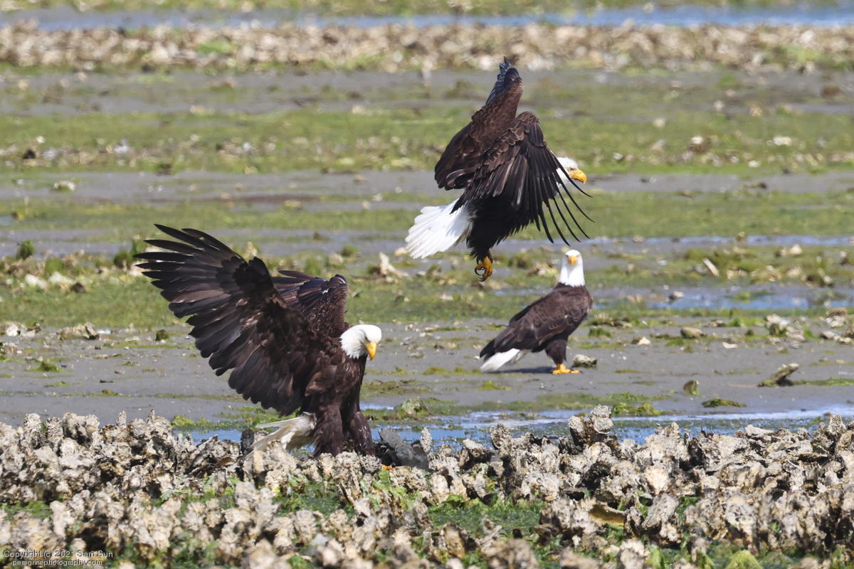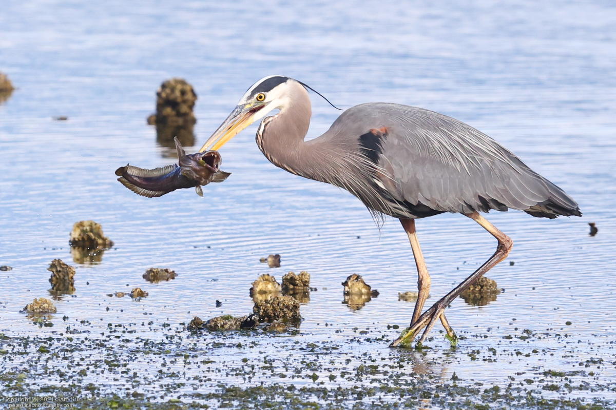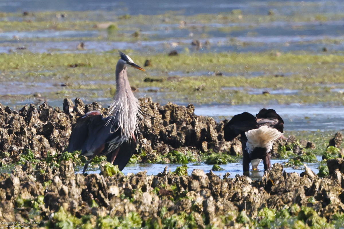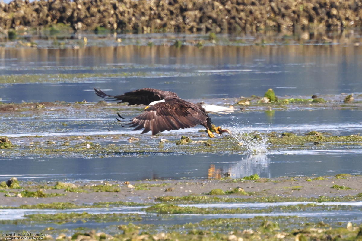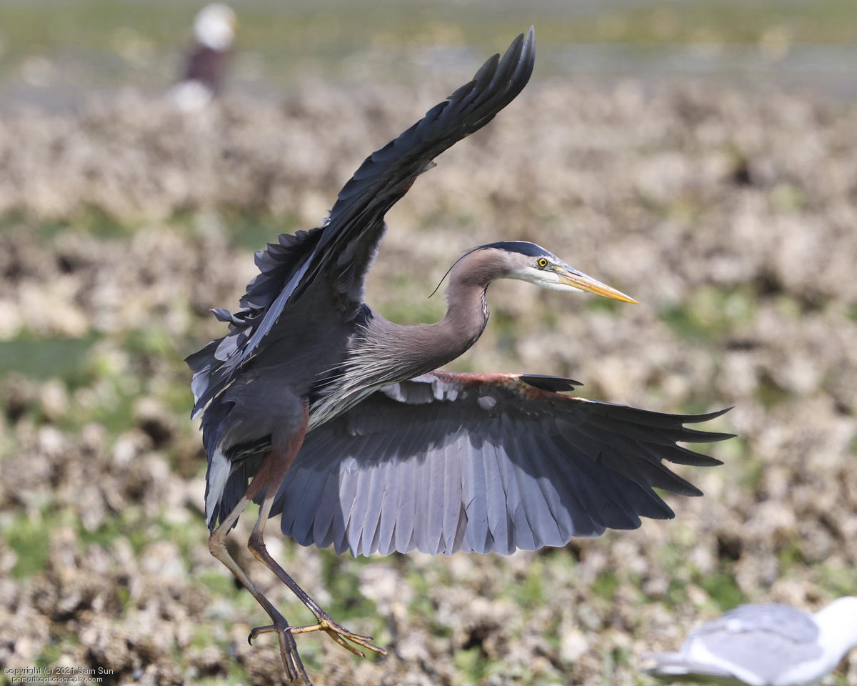 Midshipman fish bring the birds and photographers to Seabeck. The fish spawn among the oyster beds and are easy prey at low tide. The herons show up first as the tide goes out, then the eagles.