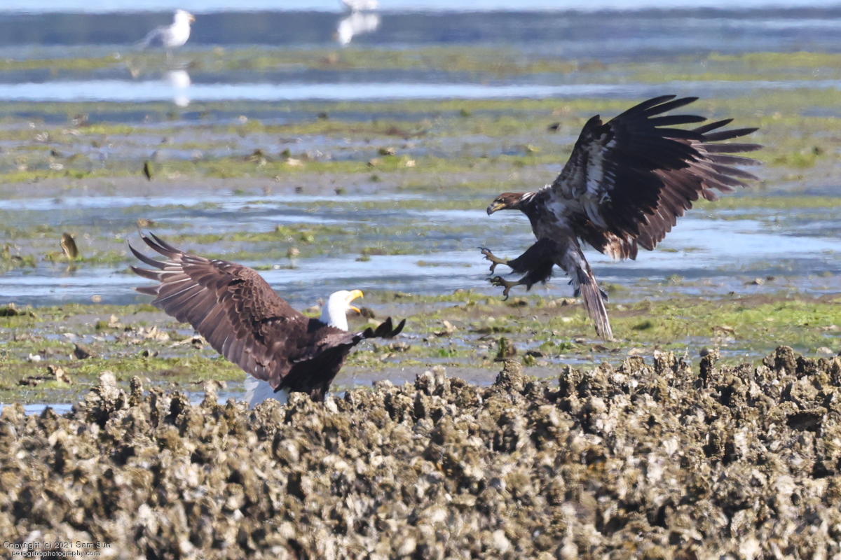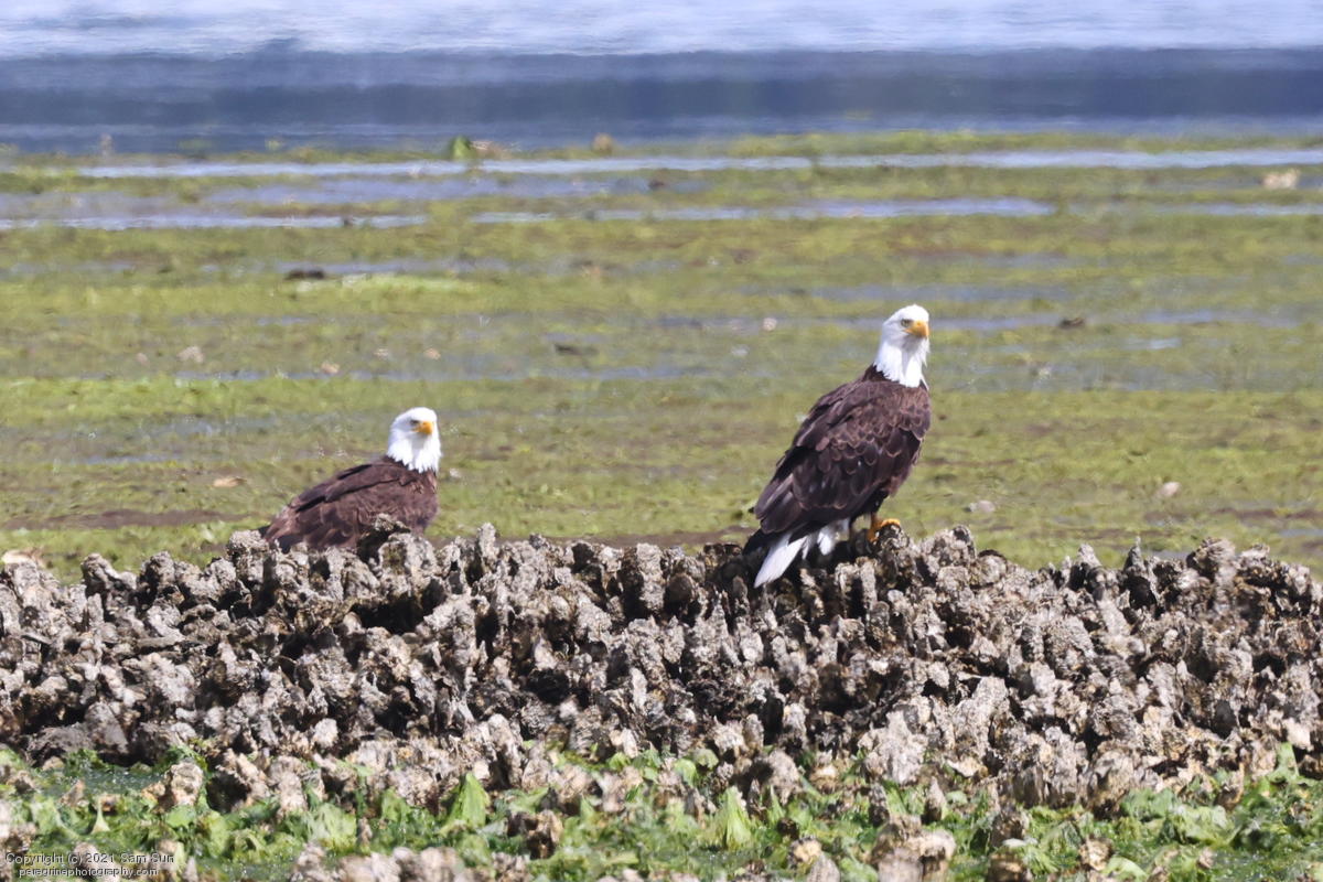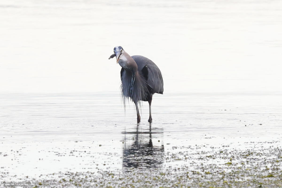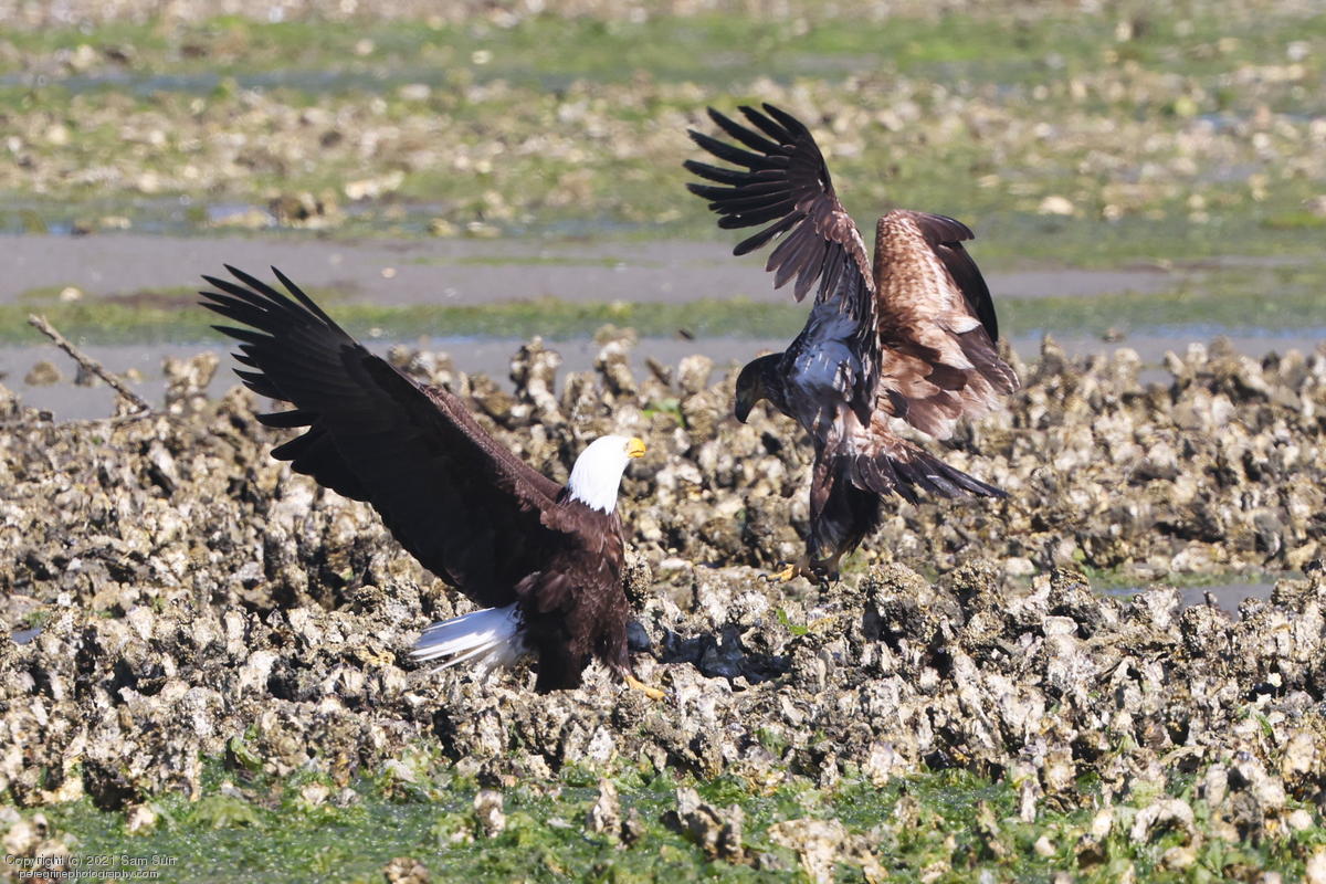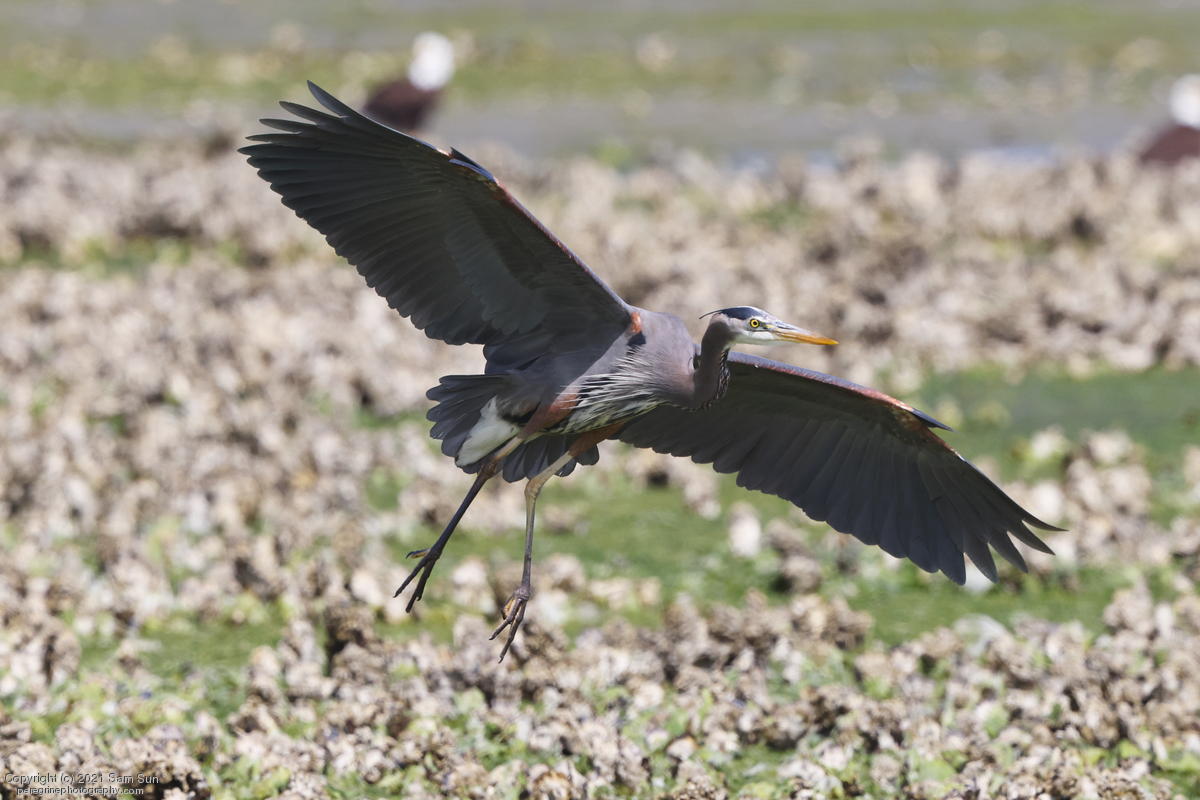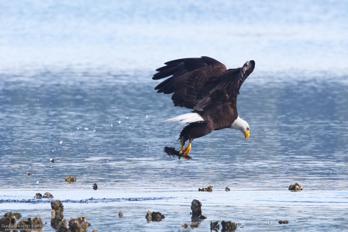 Midshipman fish bring the birds and photographers to Seabeck. The fish spawn among the oyster beds and are easy prey at low tide. The herons show up first as the tide goes out, then the eagles.