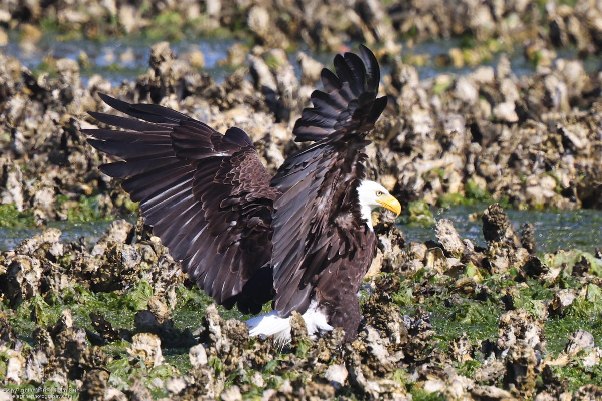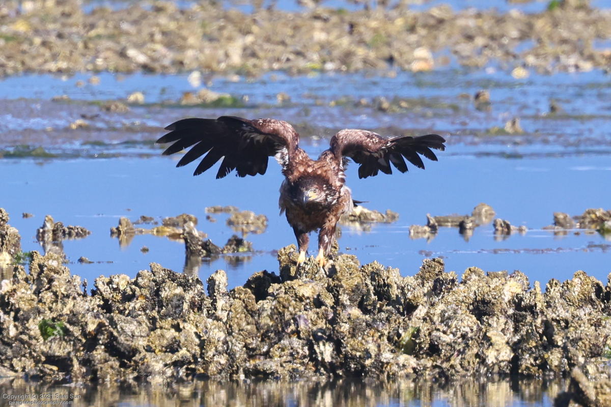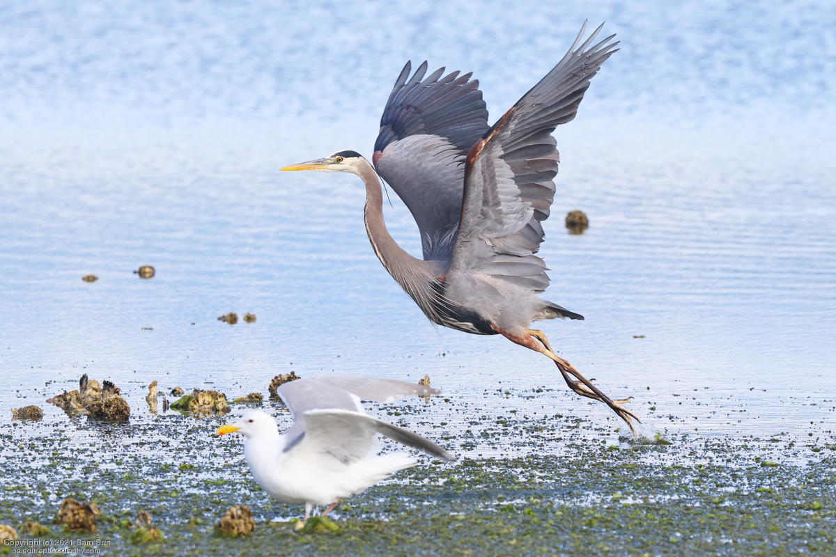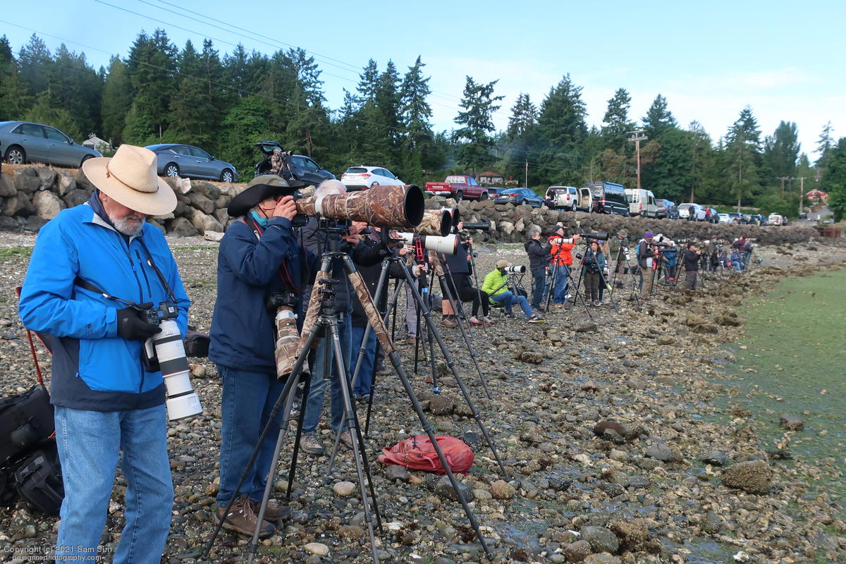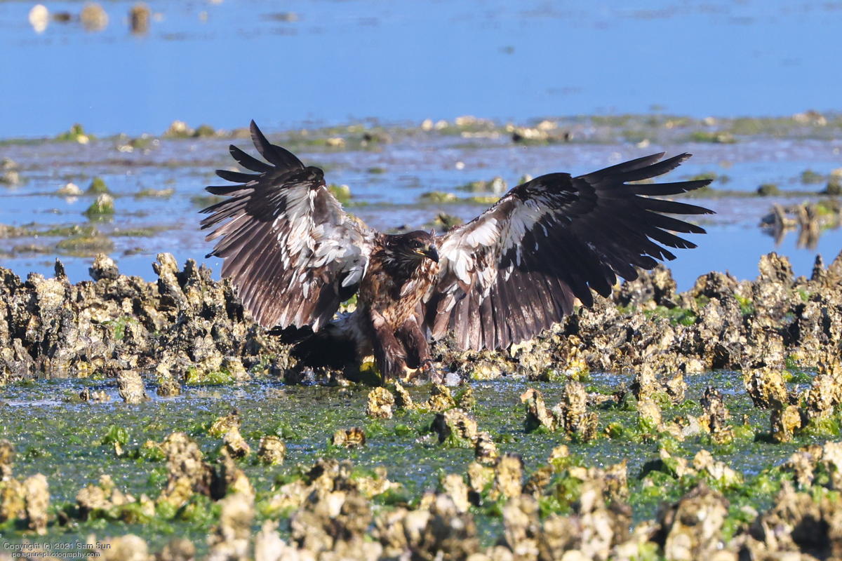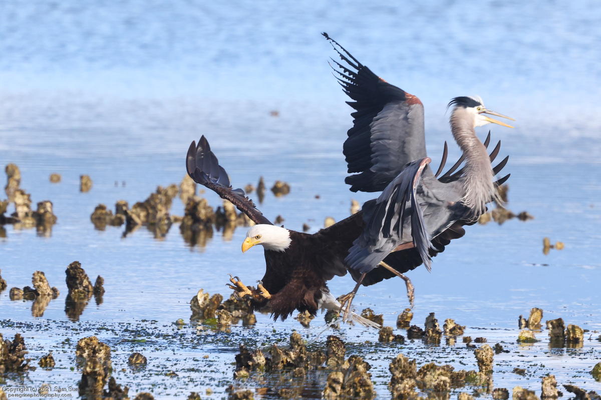 Midshipman fish bring the birds and photographers to Seabeck. The fish spawn among the oyster beds and are easy prey at low tide. The herons show up first as the tide goes out, then the eagles.