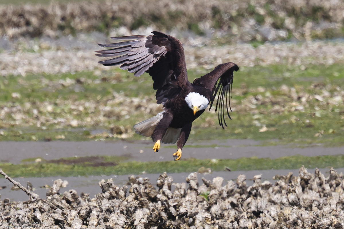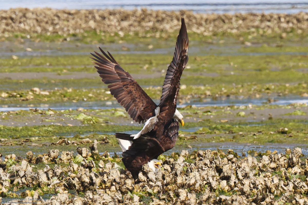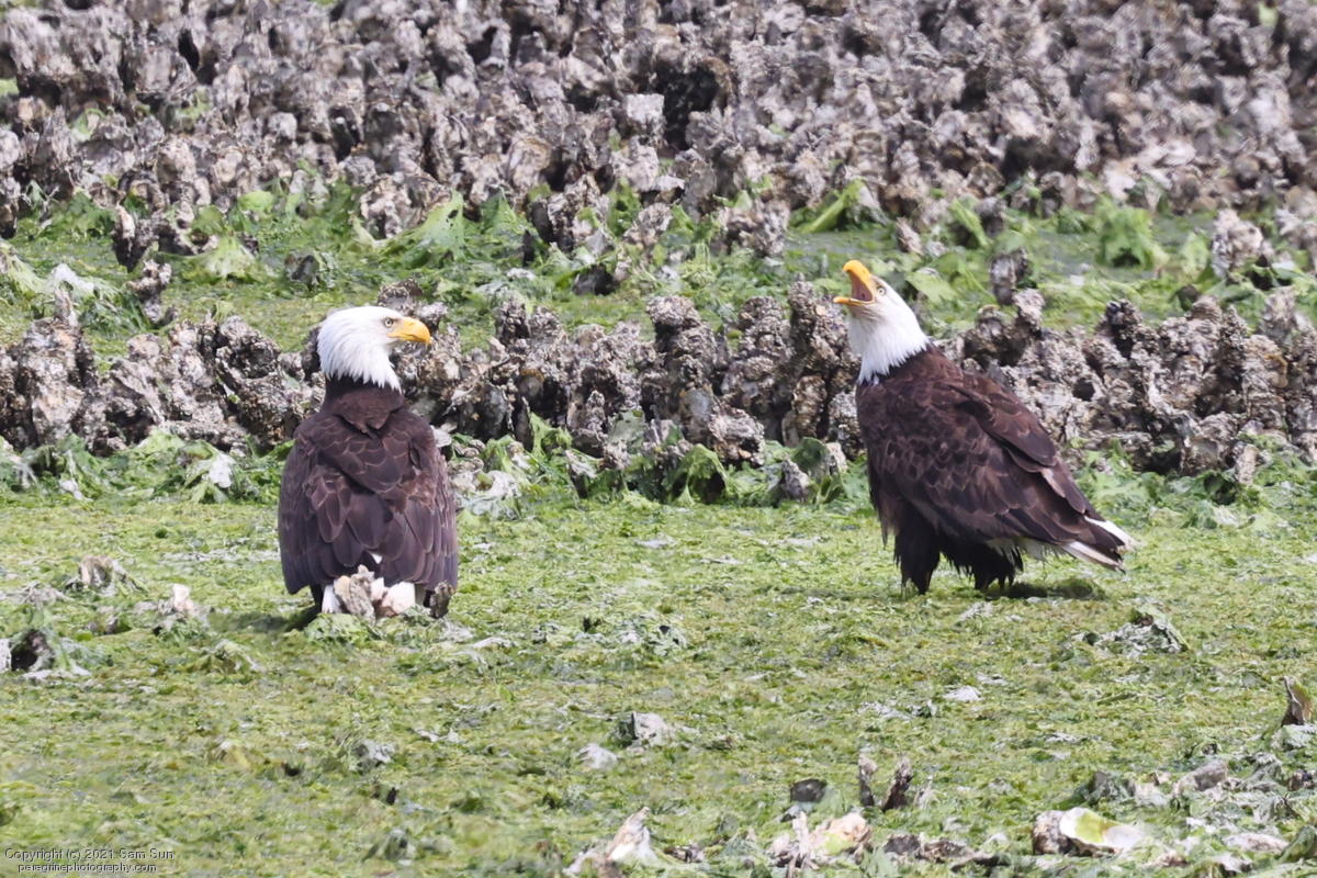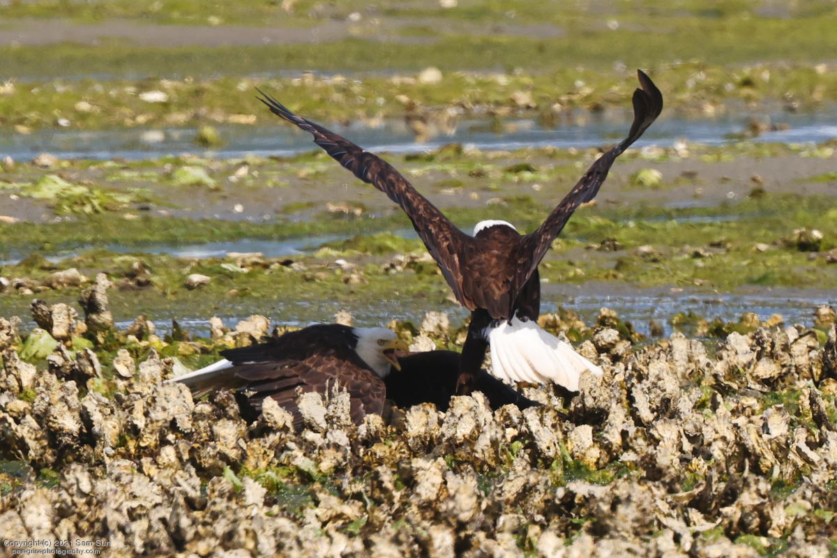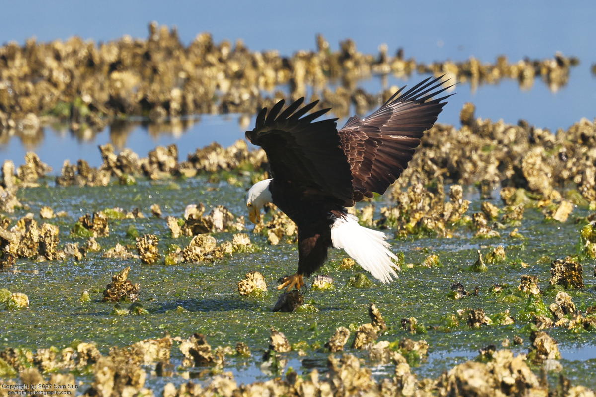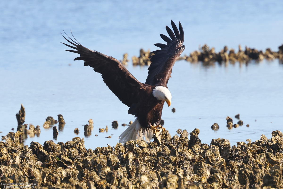 Midshipman fish bring the birds and photographers to Seabeck. The fish spawn among the oyster beds and are easy prey at low tide. The herons show up first as the tide goes out, then the eagles.