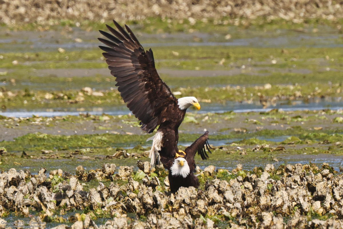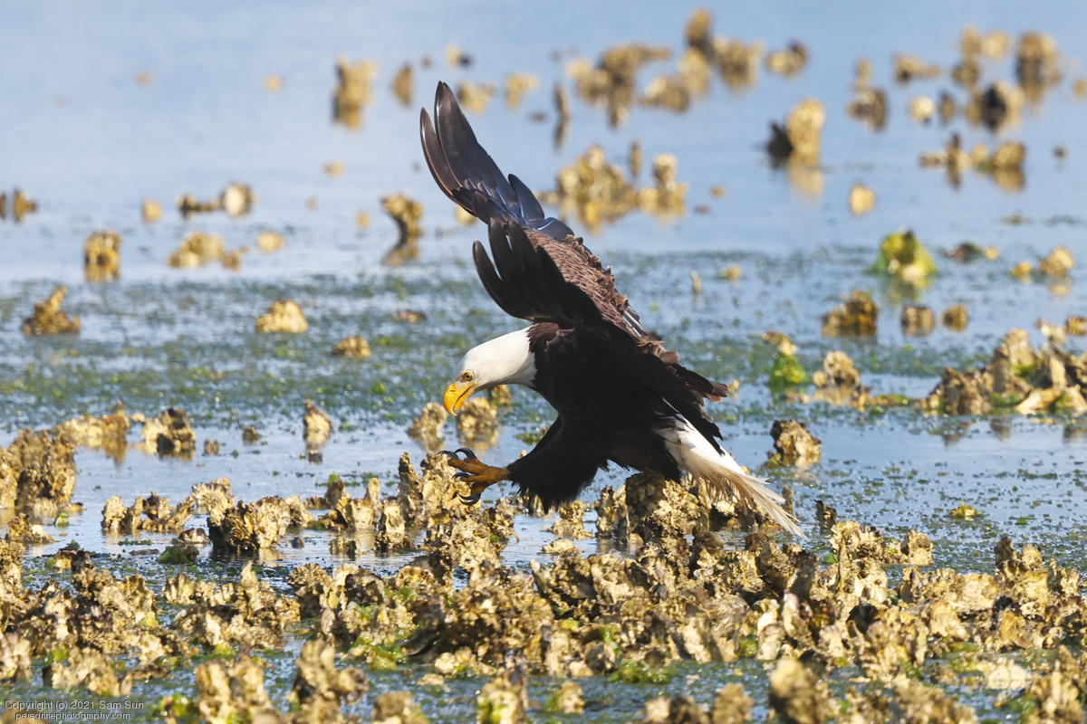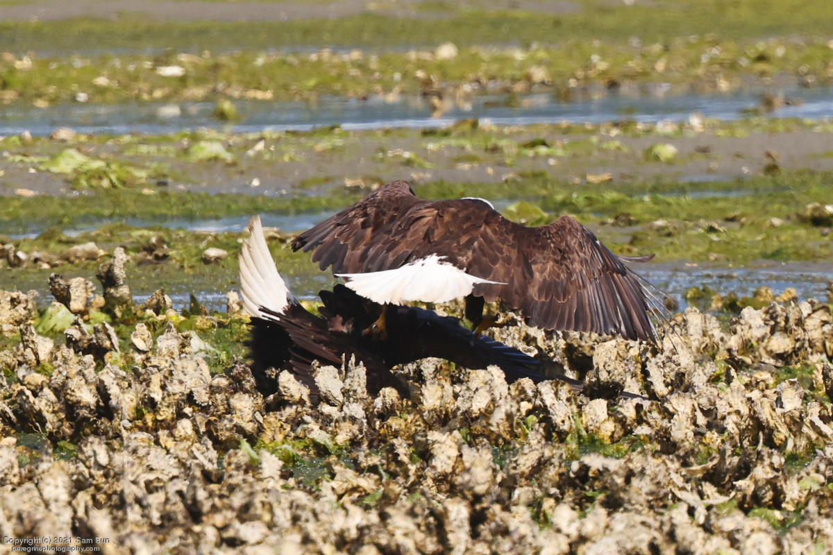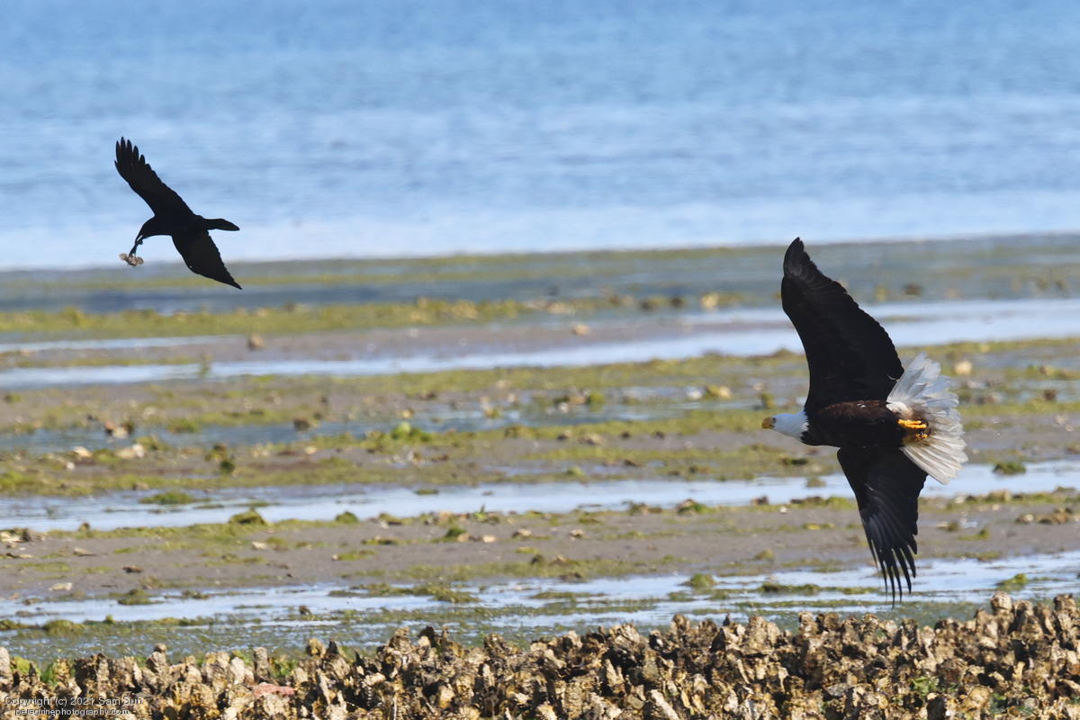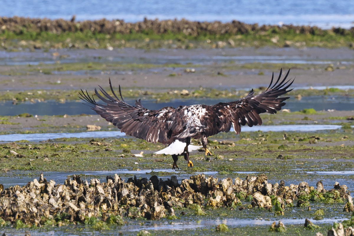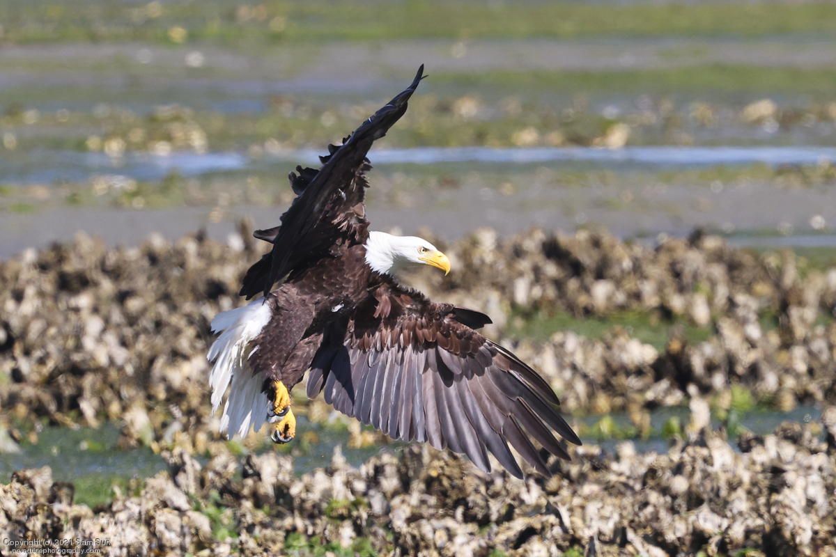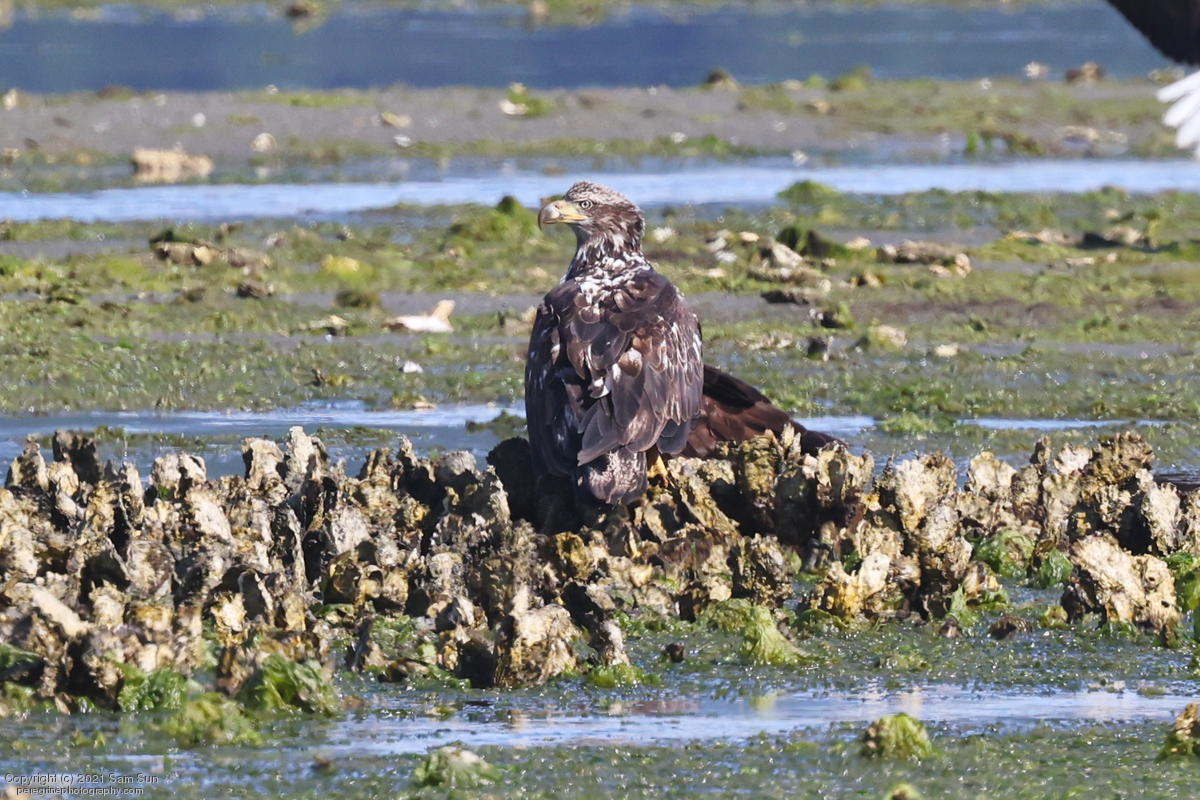 Midshipman fish bring the birds and photographers to Seabeck. The fish spawn among the oyster beds and are easy prey at low tide. The herons show up first as the tide goes out, then the eagles.