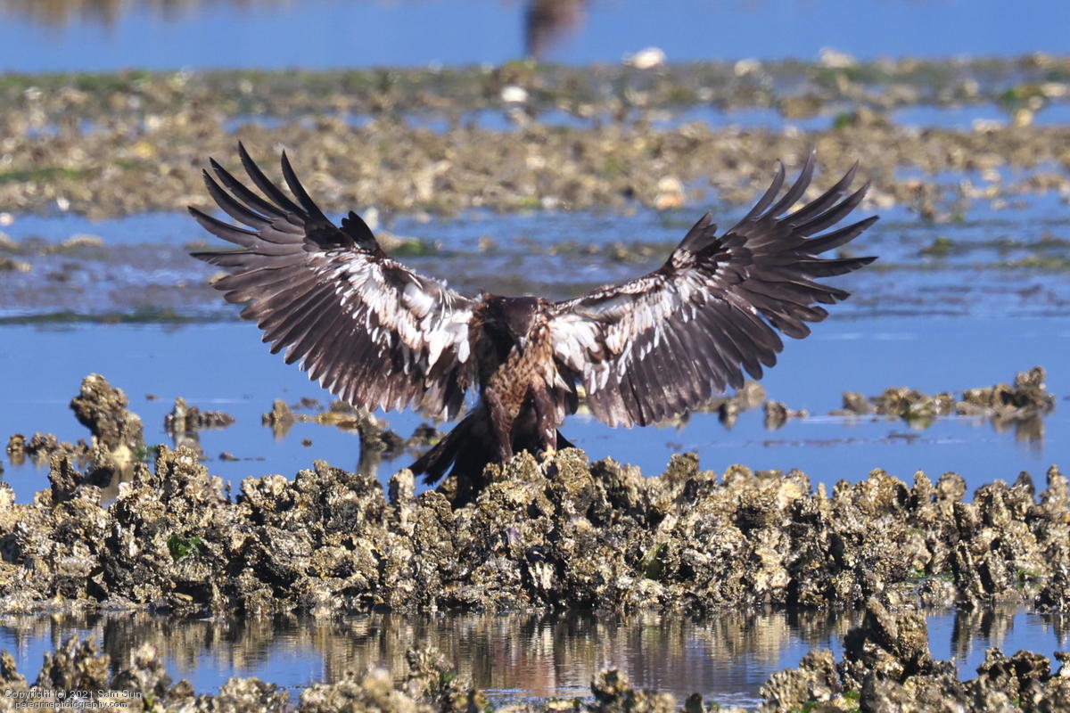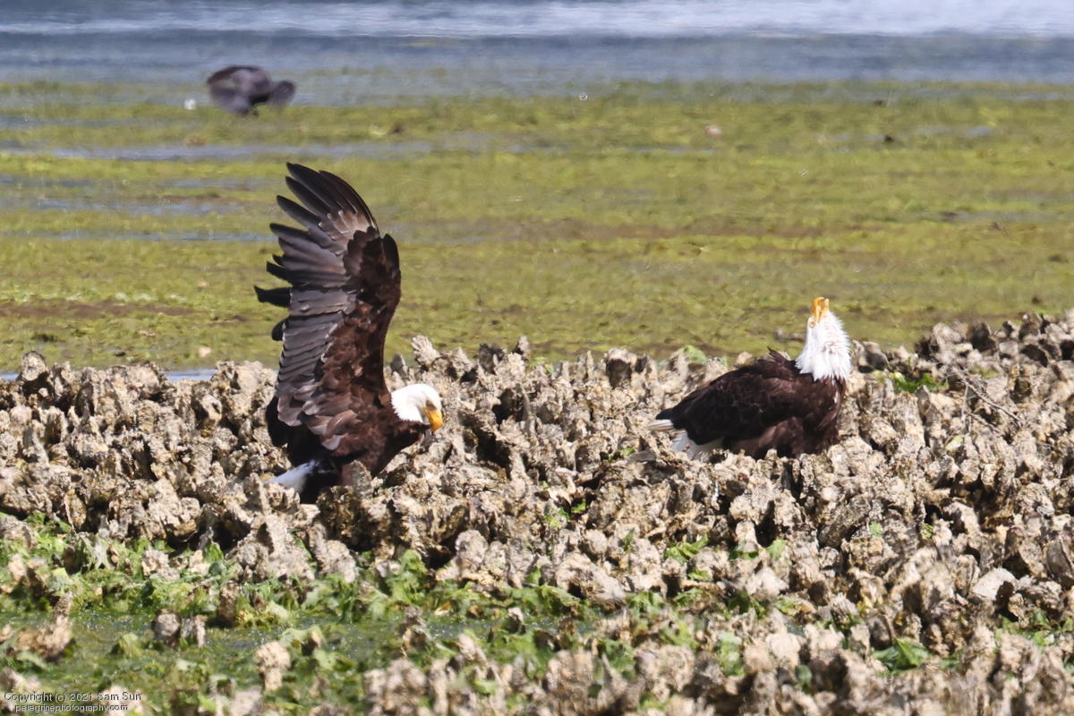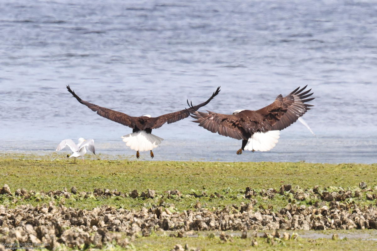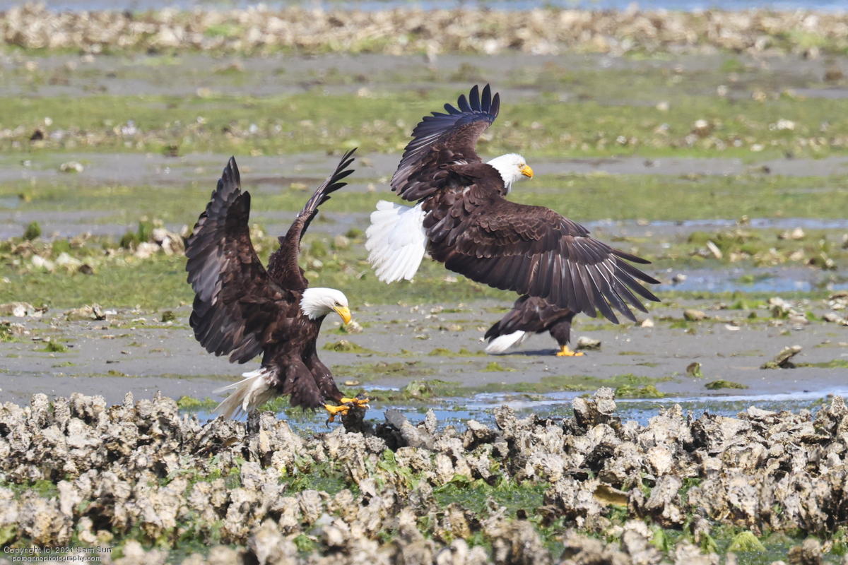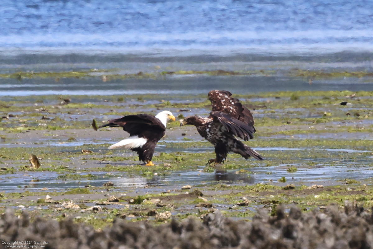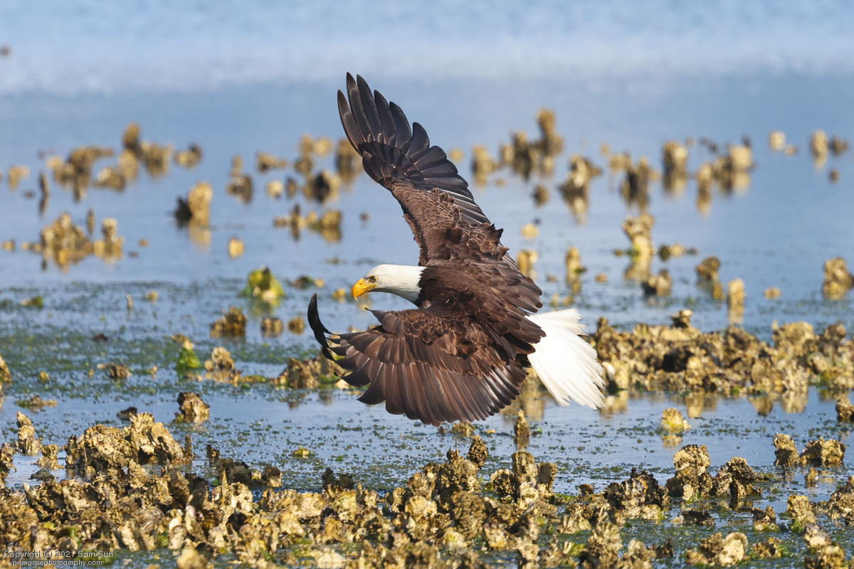 Midshipman fish bring the birds and photographers to Seabeck. The fish spawn among the oyster beds and are easy prey at low tide. The herons show up first as the tide goes out, then the eagles.