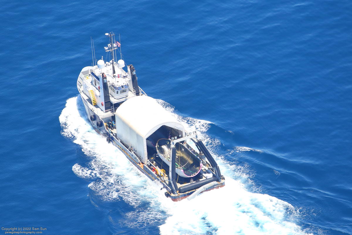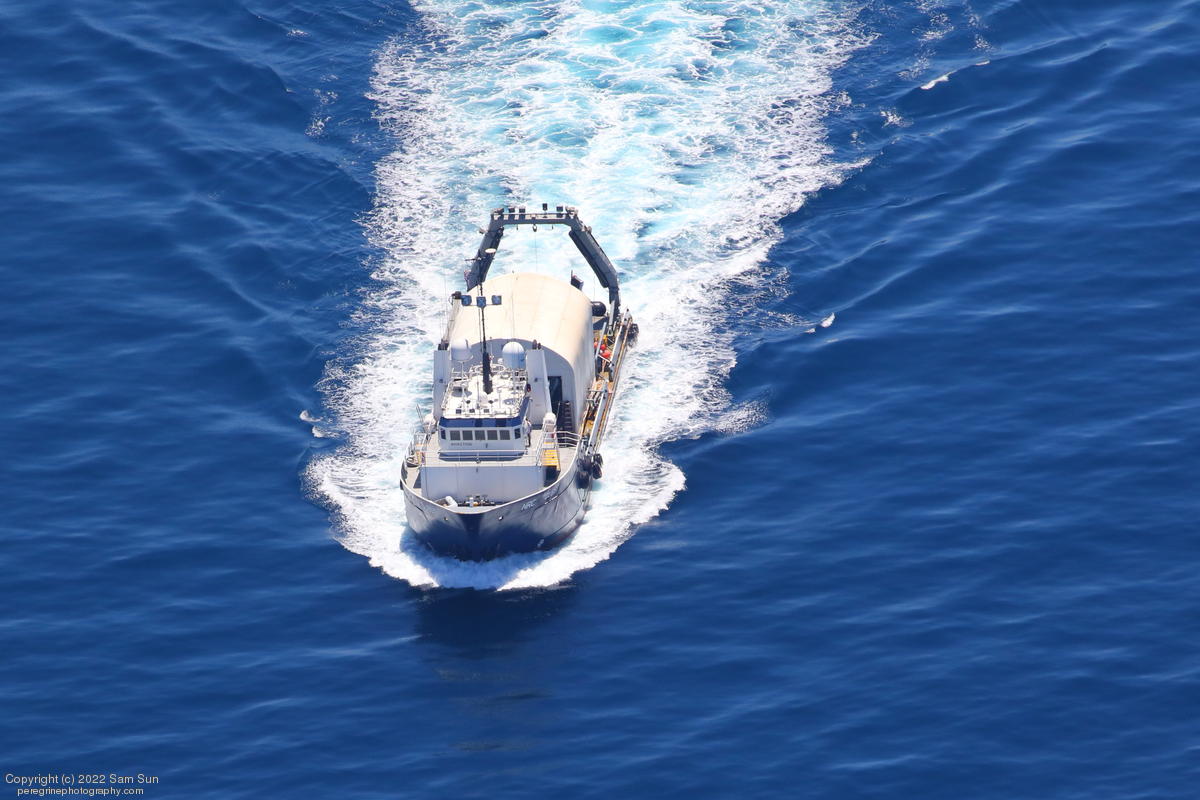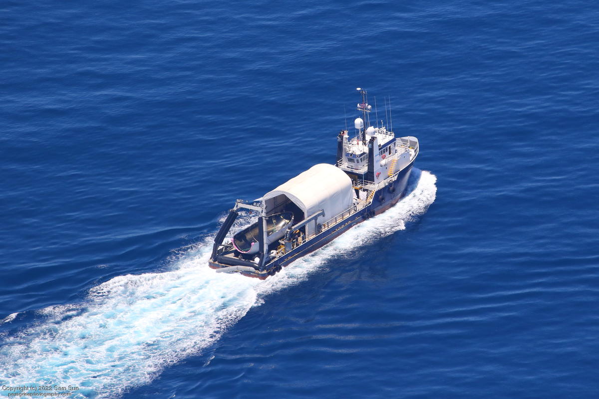 NRC Quest passing Santa Catalina Island with recovered fairing halves.