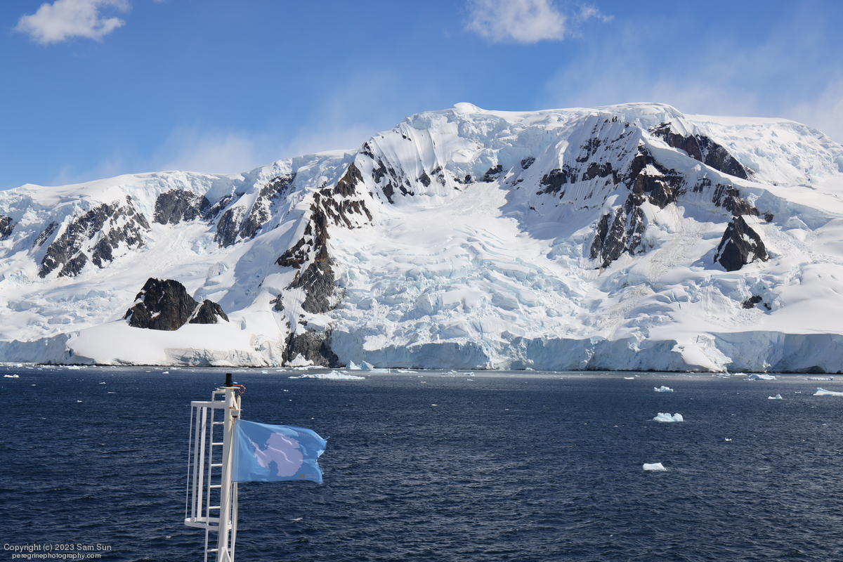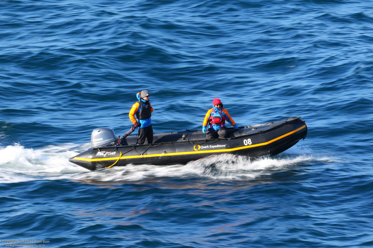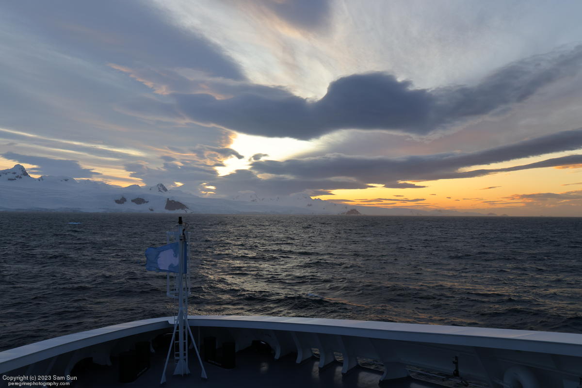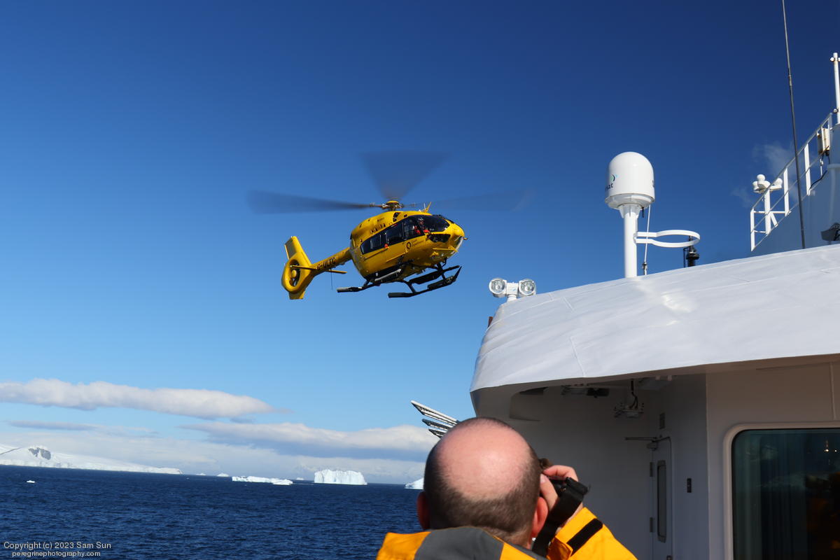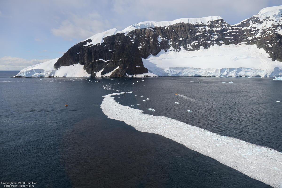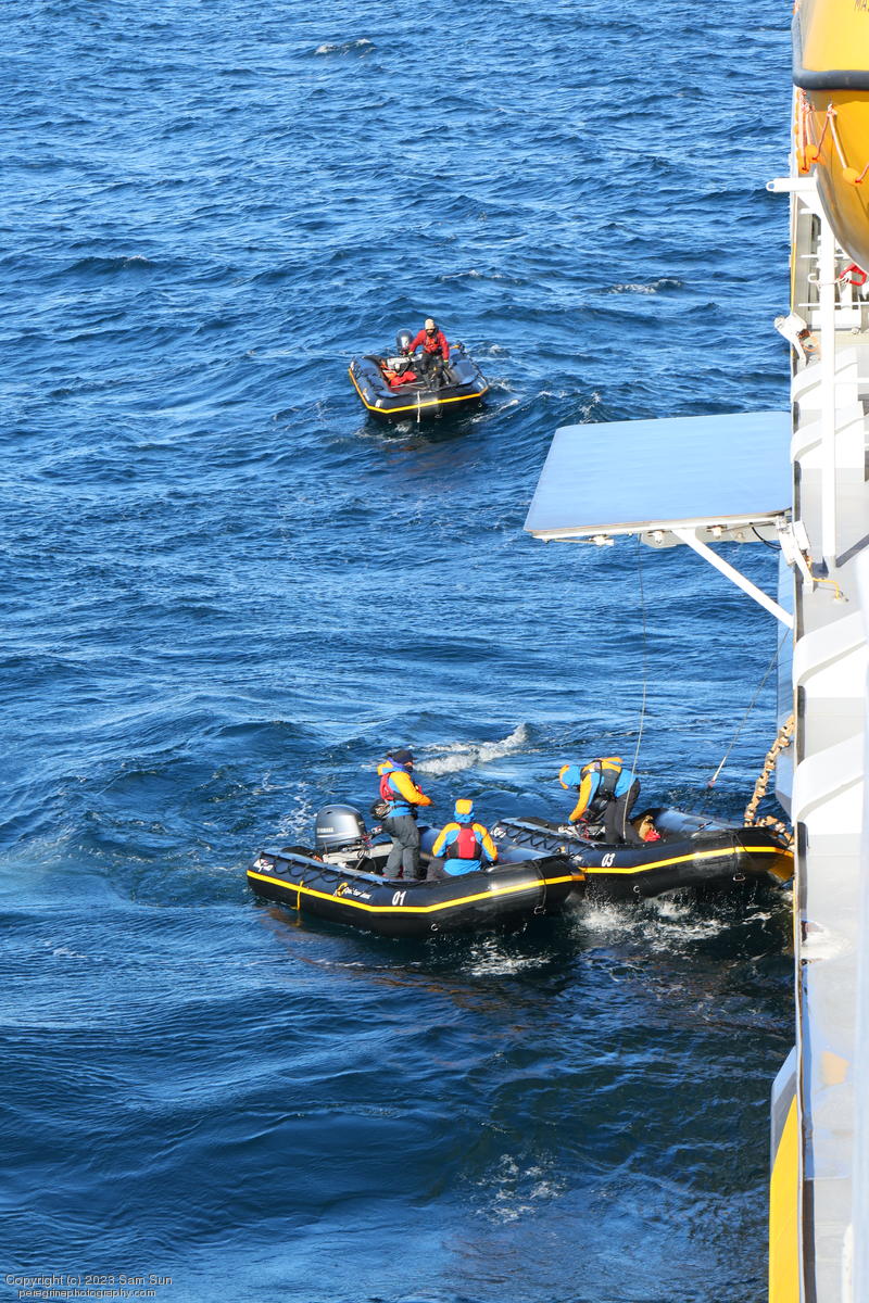 A nice day with mostly sunny skies, but winds were an issue for zodiac and helicopter excursions. We finally found a sheltered area near Kaiser Island to go flightseeing. In the afternoon, we crossed paths with a pod of orcas. The winds came up again, and the afternoon excursions were ultimately cancelled.