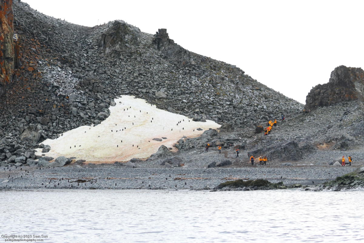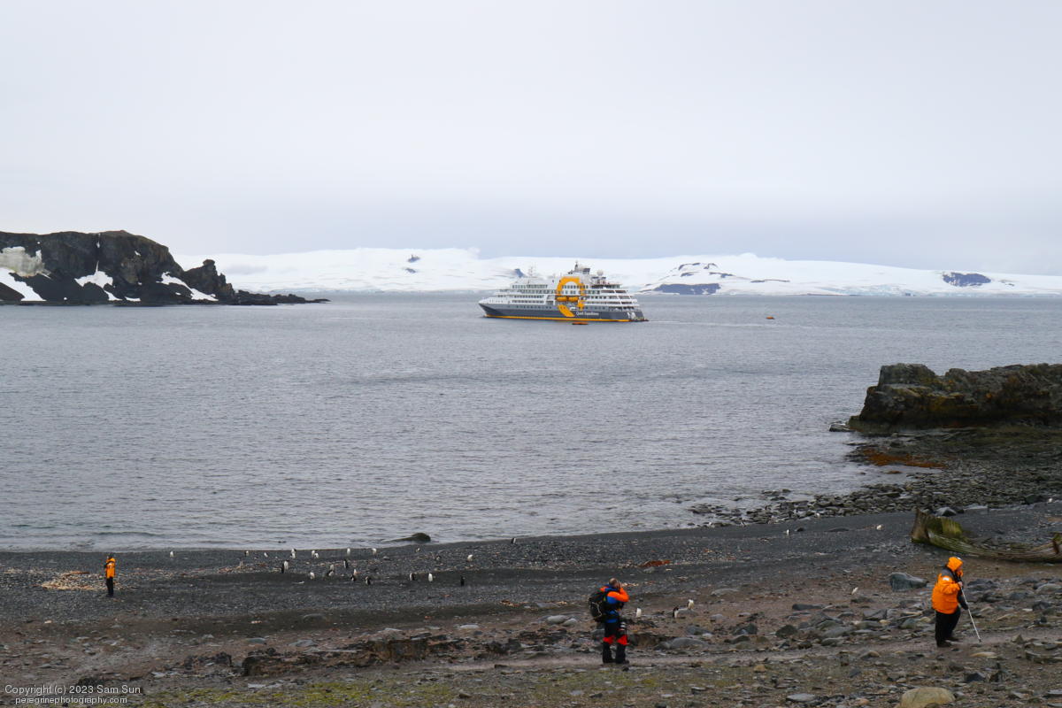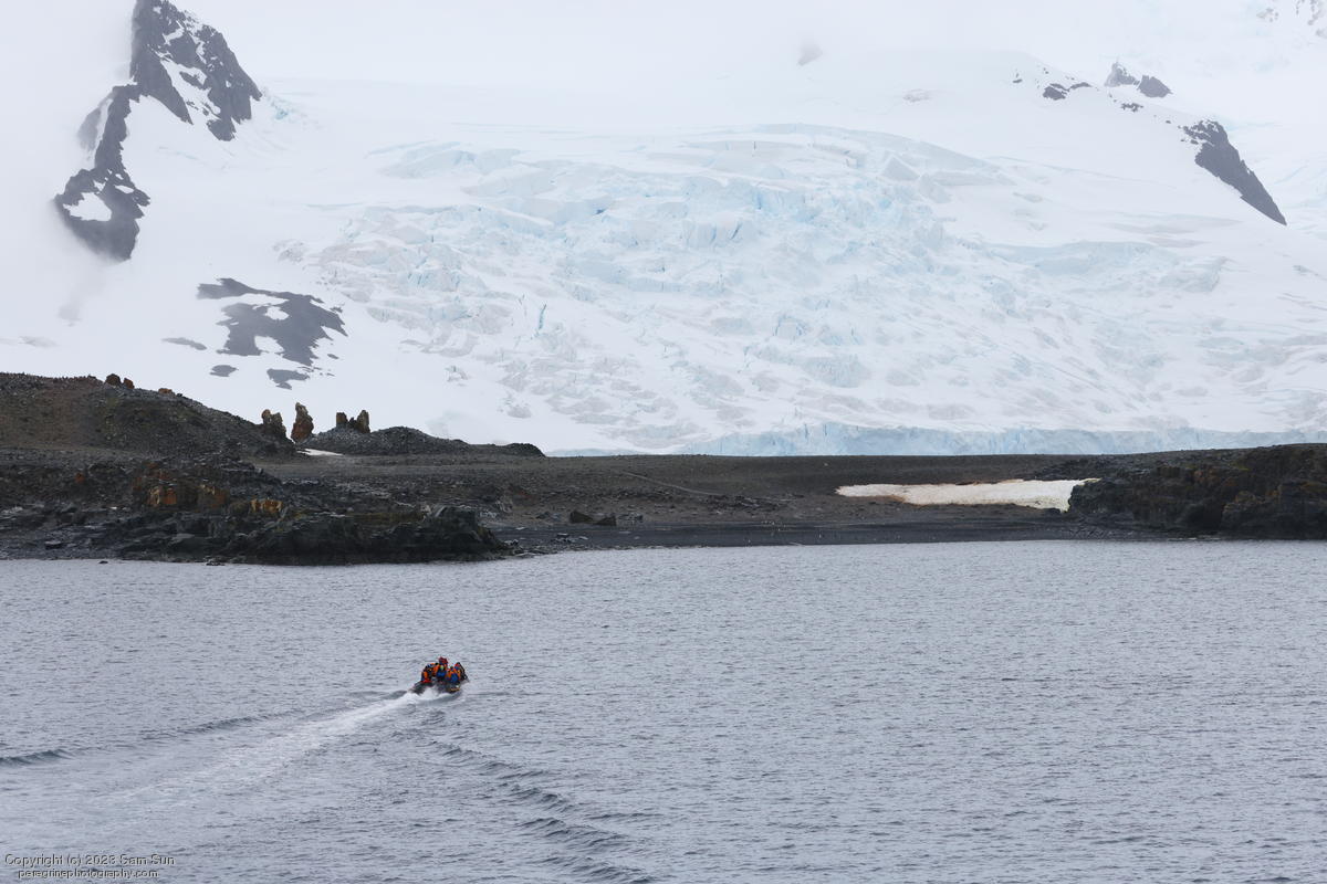 Our first shore excursion was at Half Moon Island, home to a chinstrap penguin colony. The Argentine Base Camara also lies on the island, a short distance away from our landing site. Later in the evening, we cruised by Deception Island.