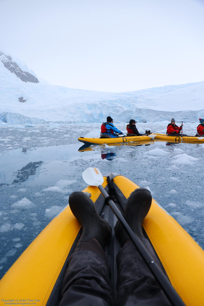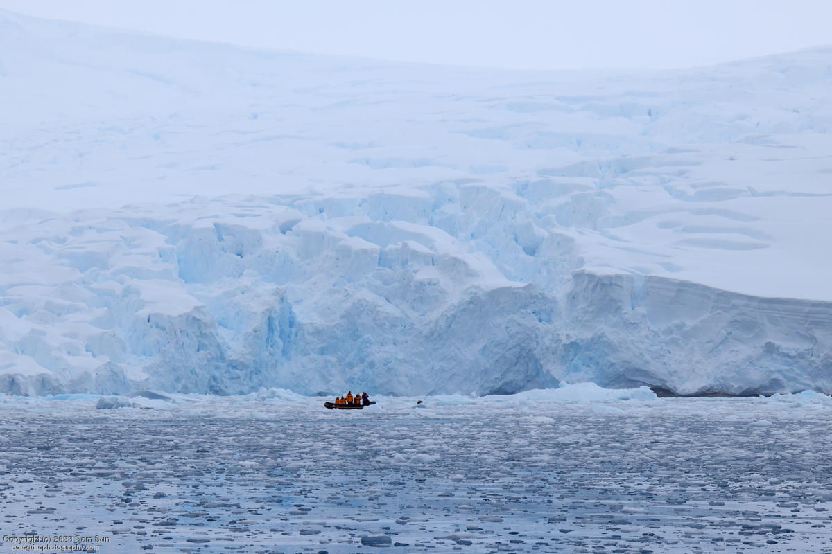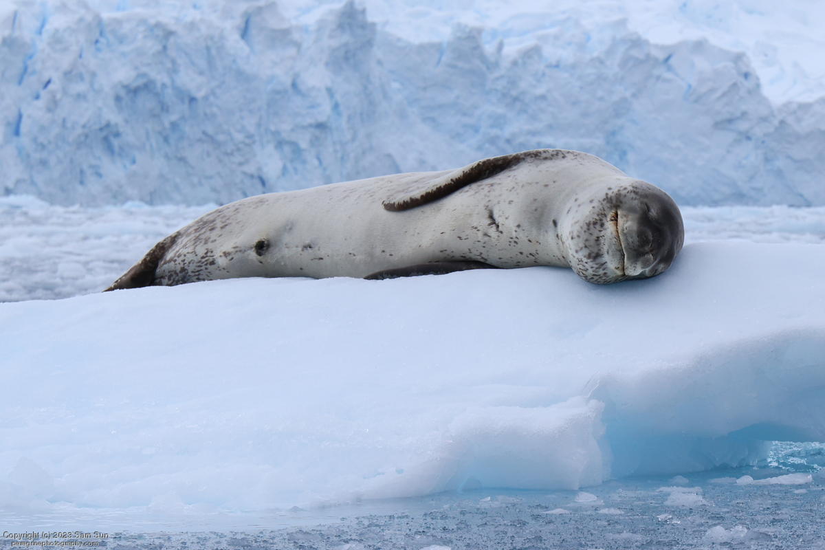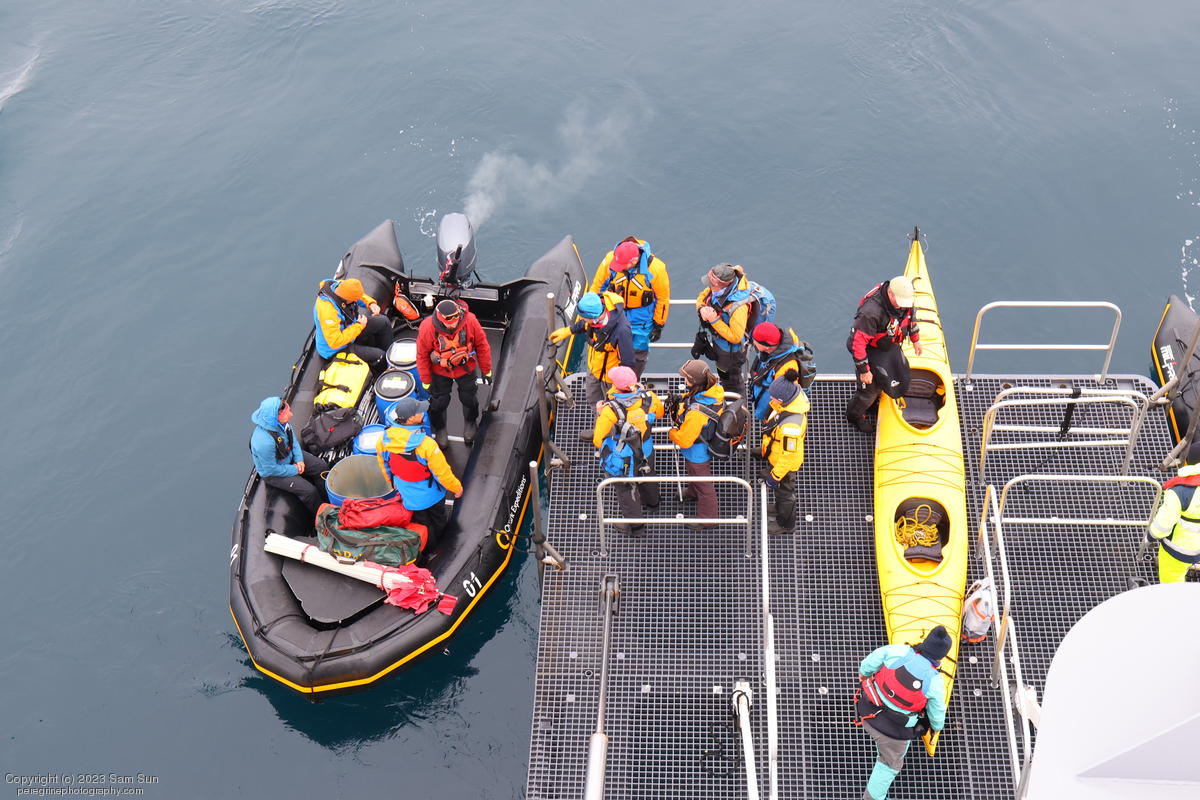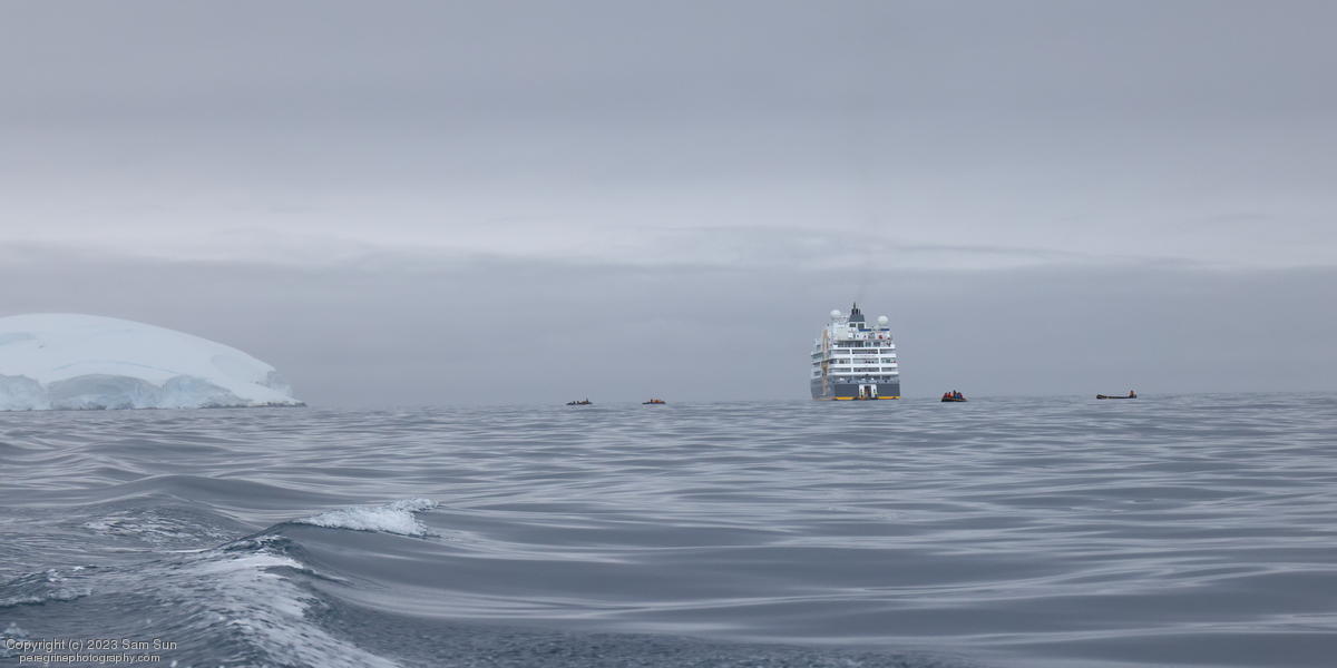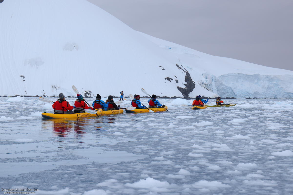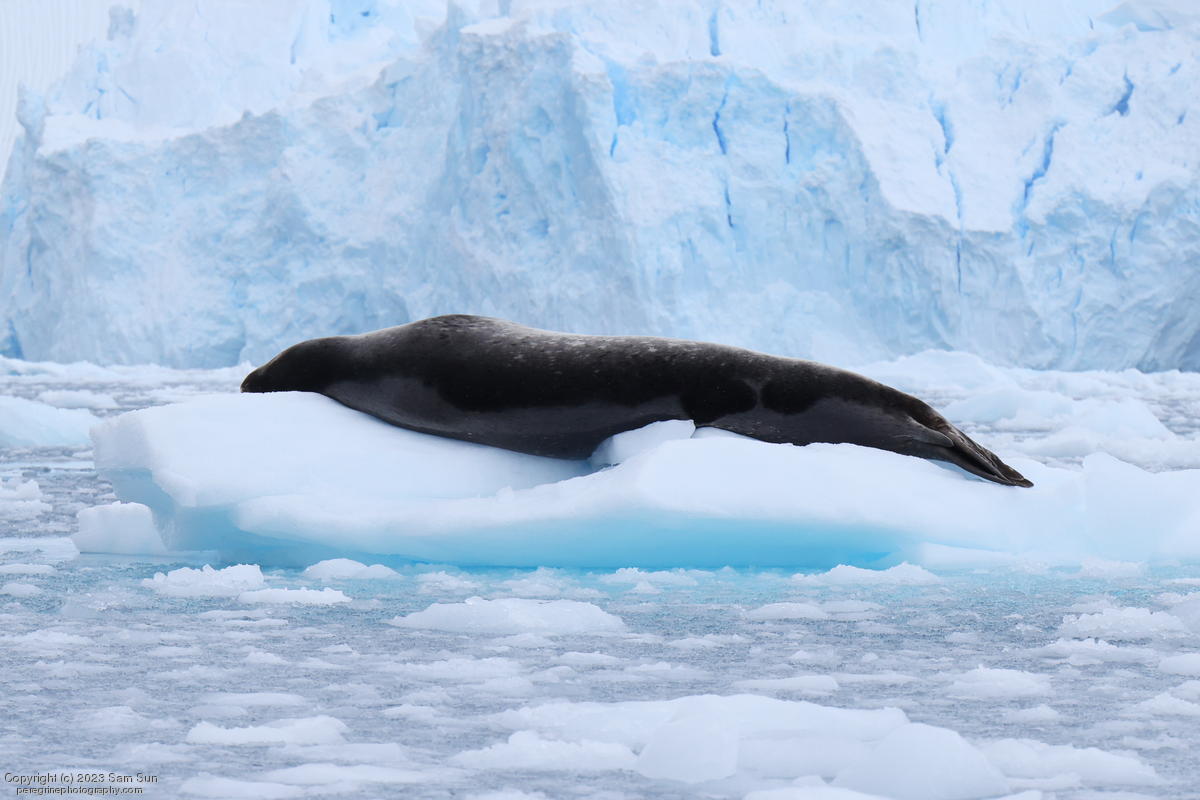 We backtracked a bit to the northeast overnight to stay with better weather. In the morning, we did a paddling excursion and came across a leopard seal.