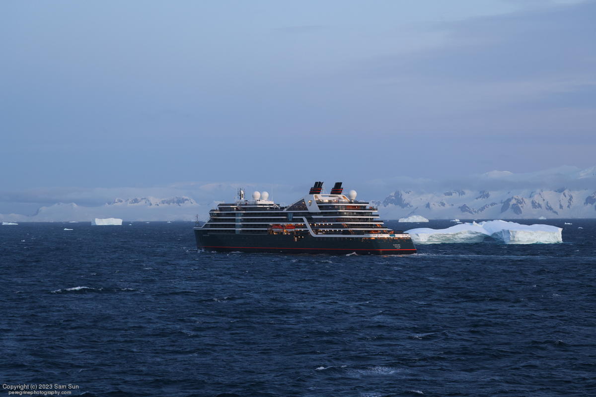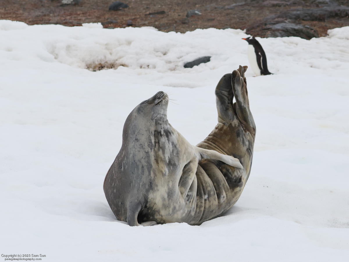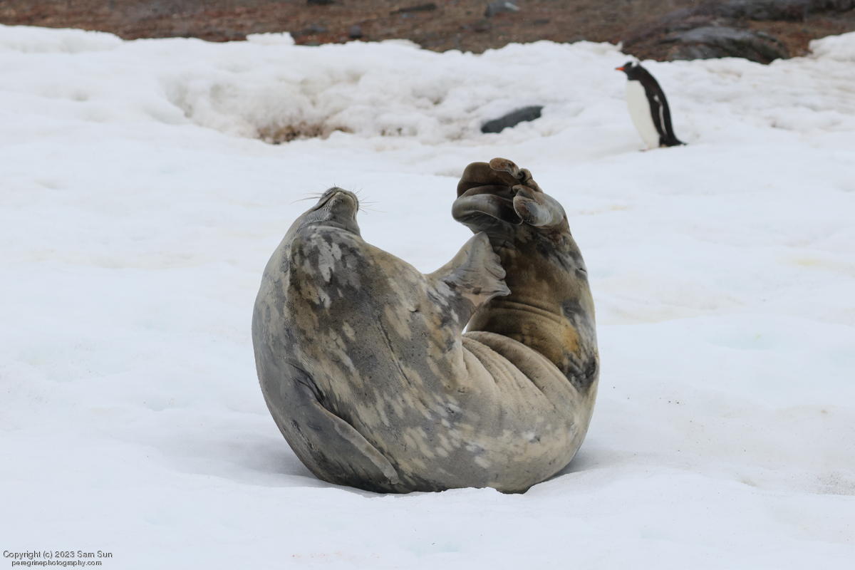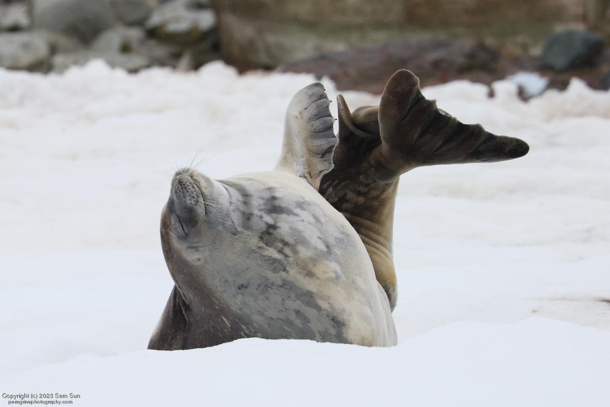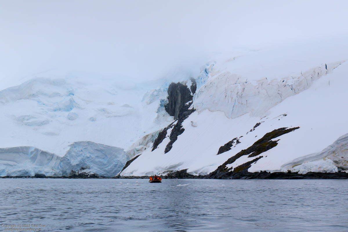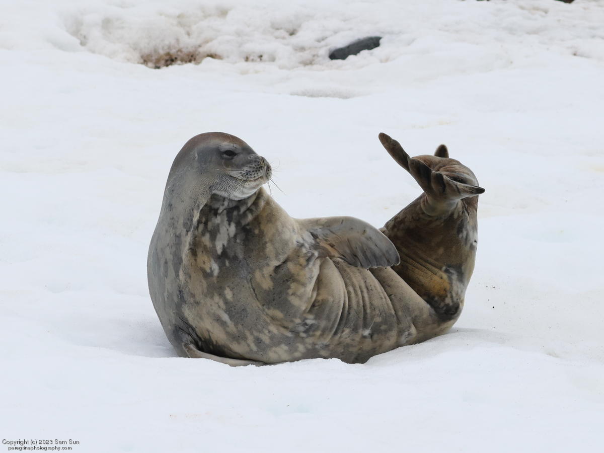 We backtracked a bit to the northeast overnight to stay with better weather. In the morning, we did a paddling excursion and came across a leopard seal.